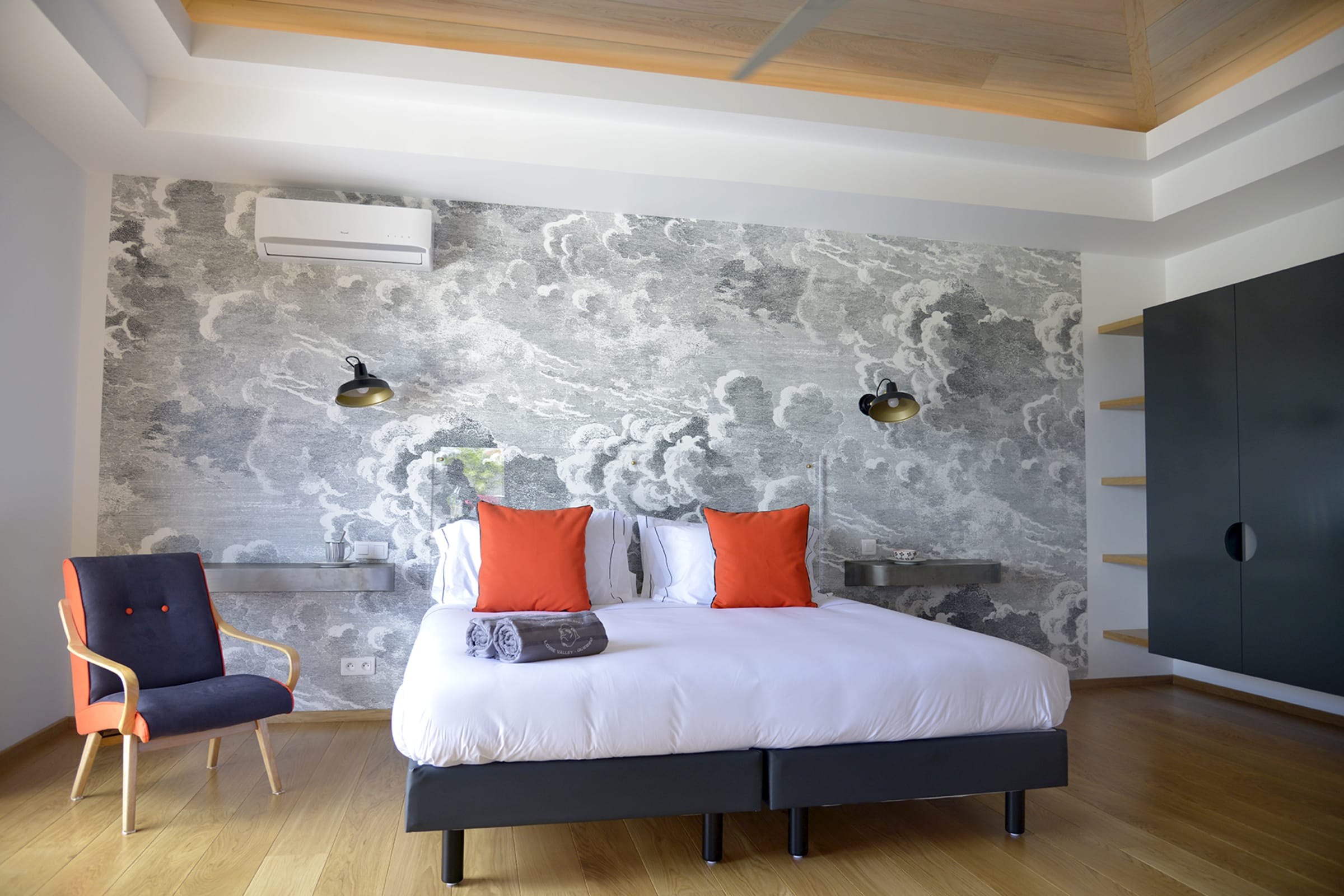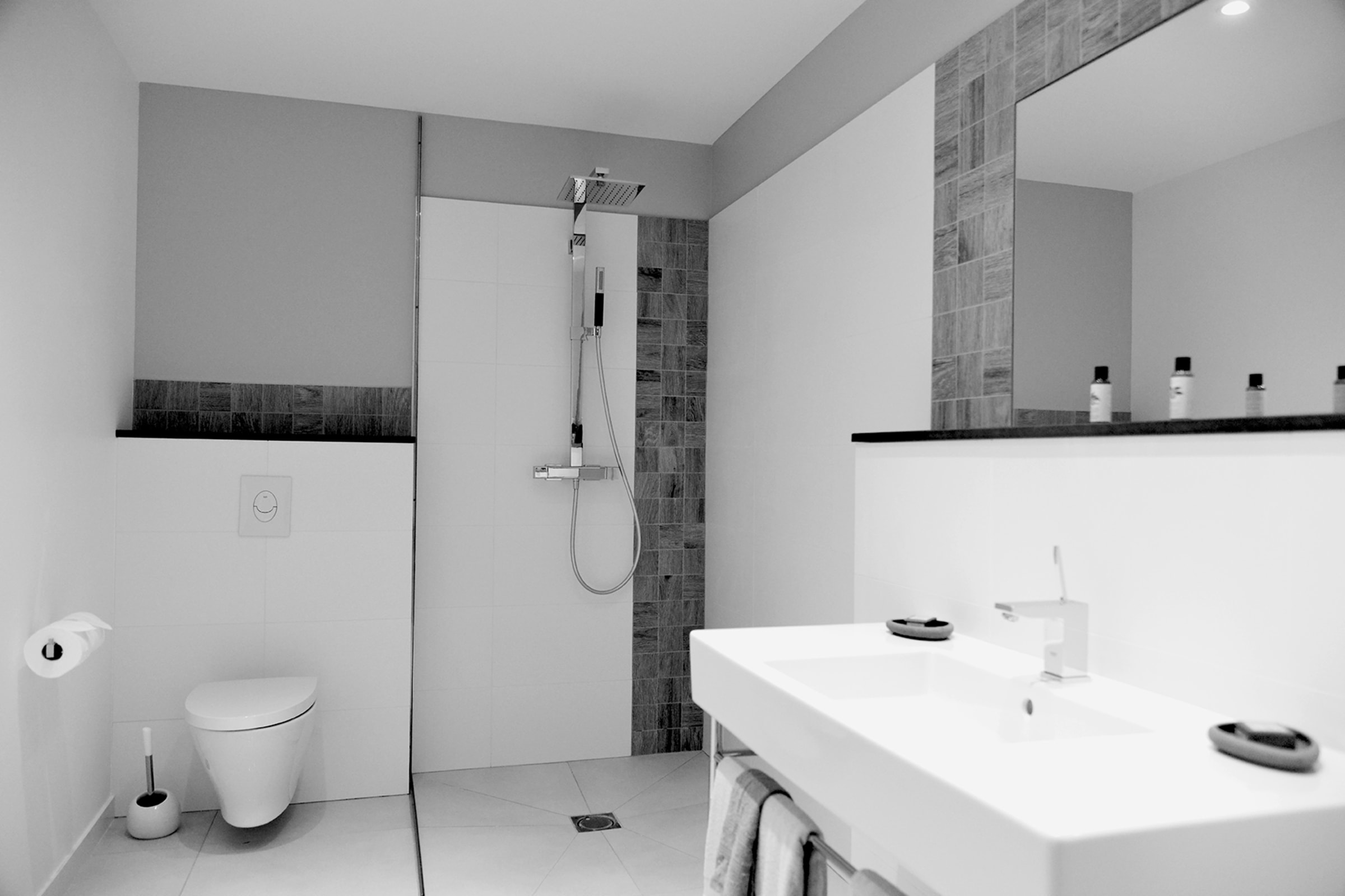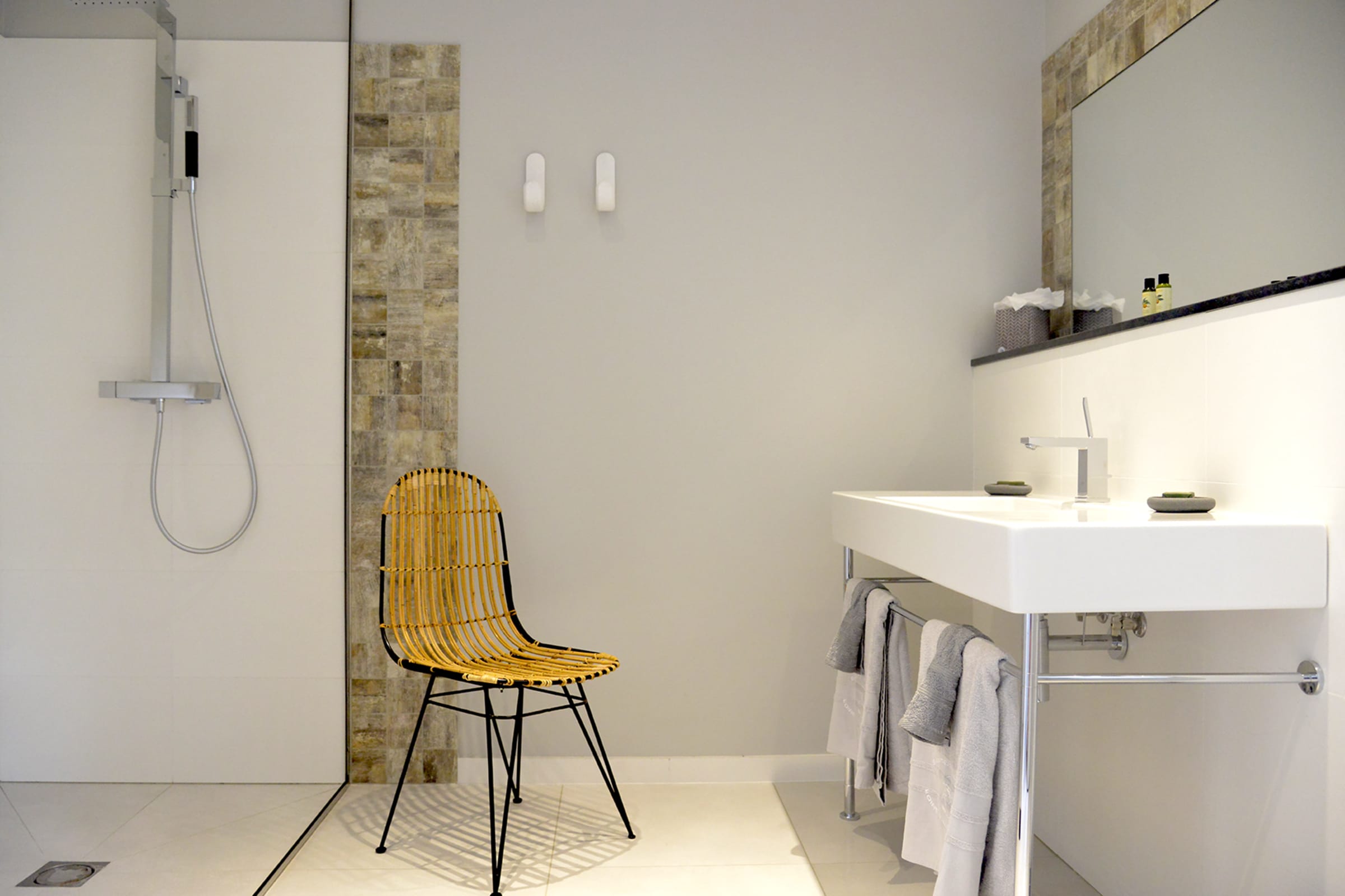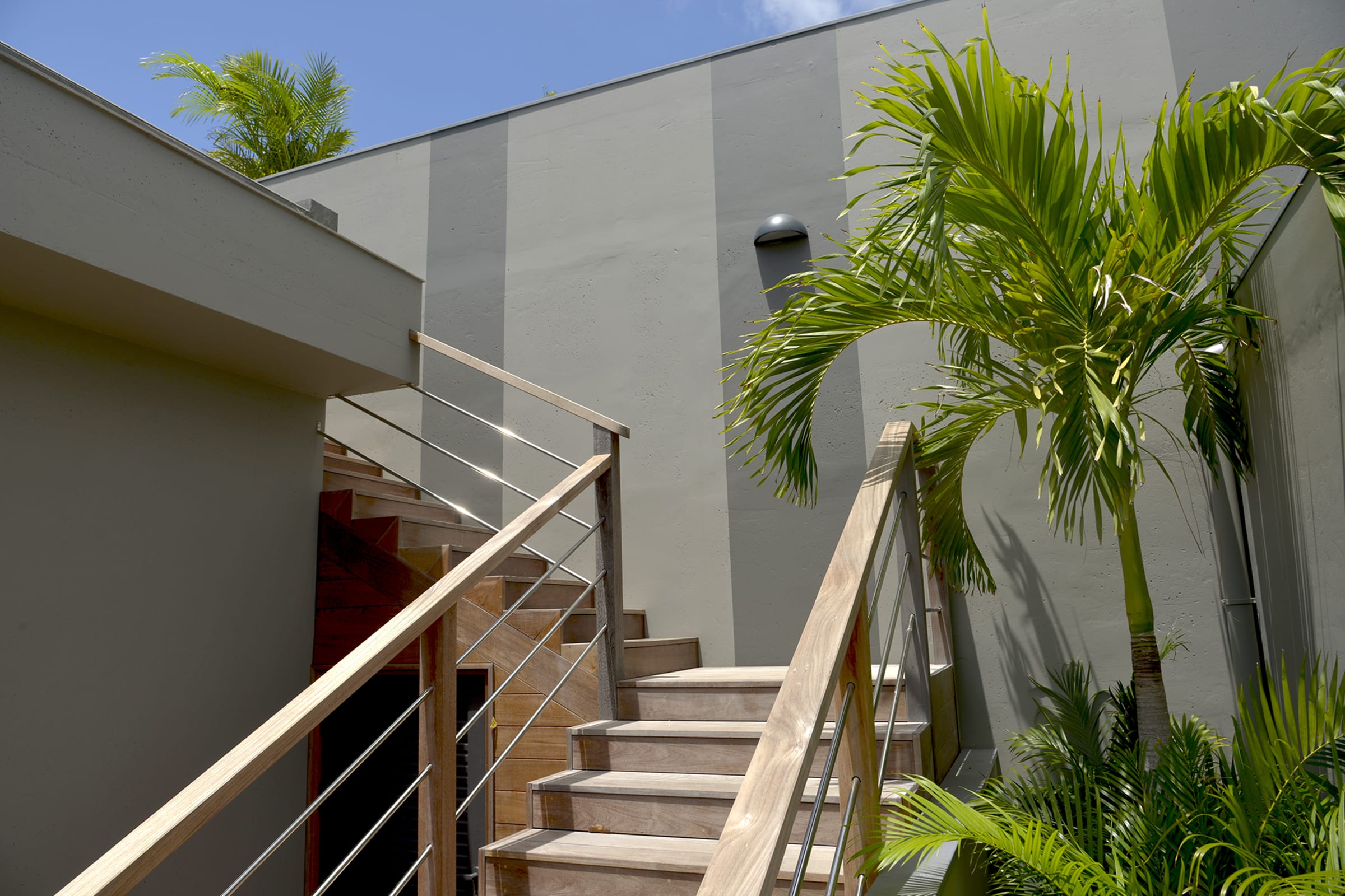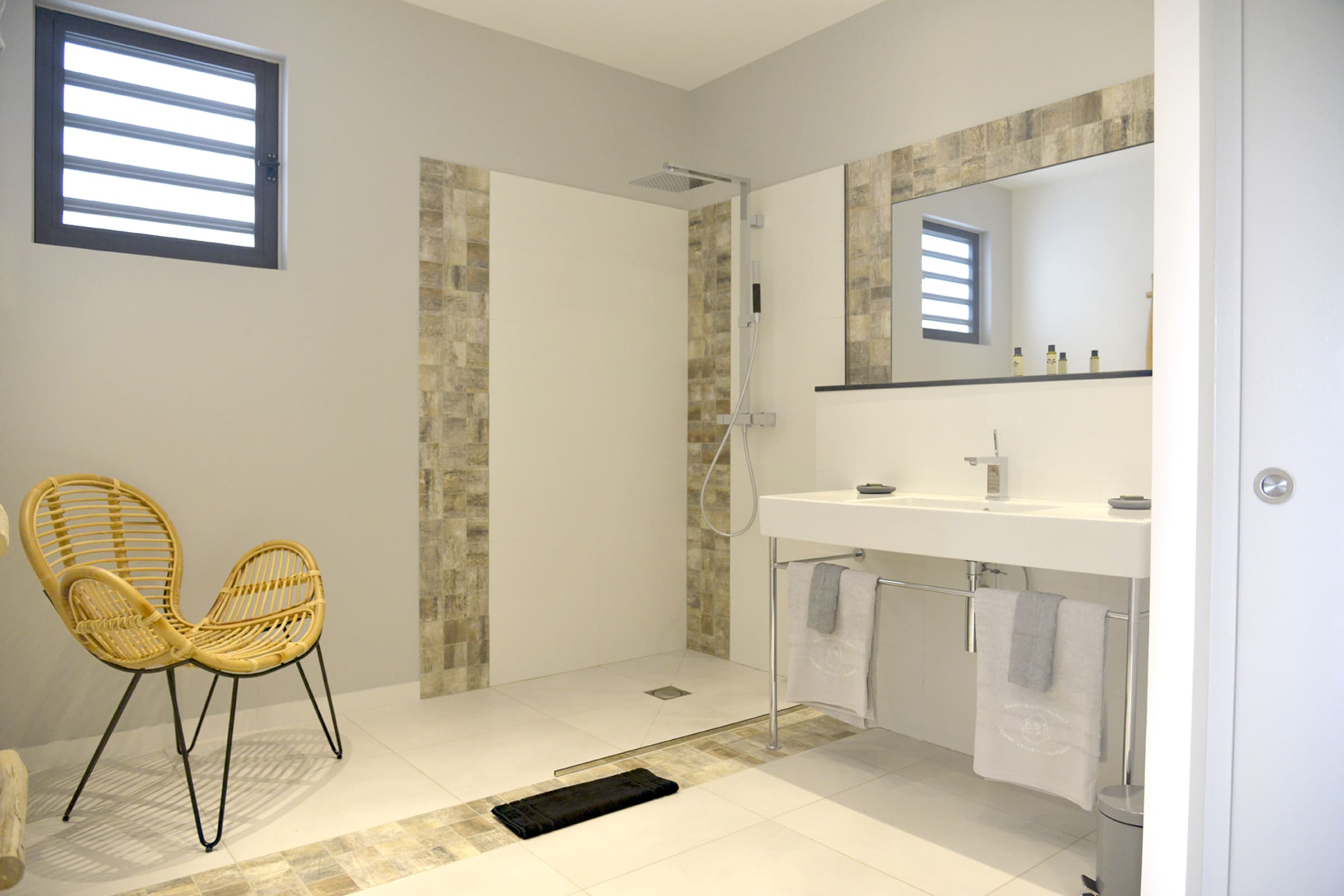 The villa features 4 master suites across two levels. One is located on the main floor and is ideal for a PMR access. The 3 others are one the lower level accessible from garage or via staircases on either side of the pool. They are air-conditioned with private bathroom, desk and balcony and all with king size beds (180cm) convertible into two twin beds.