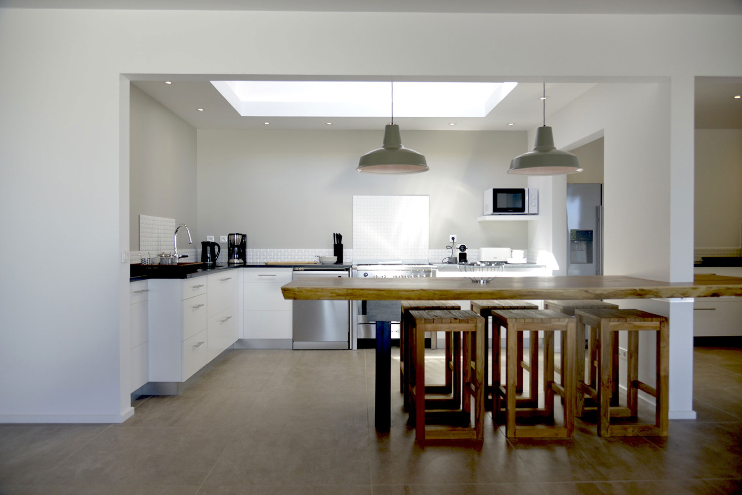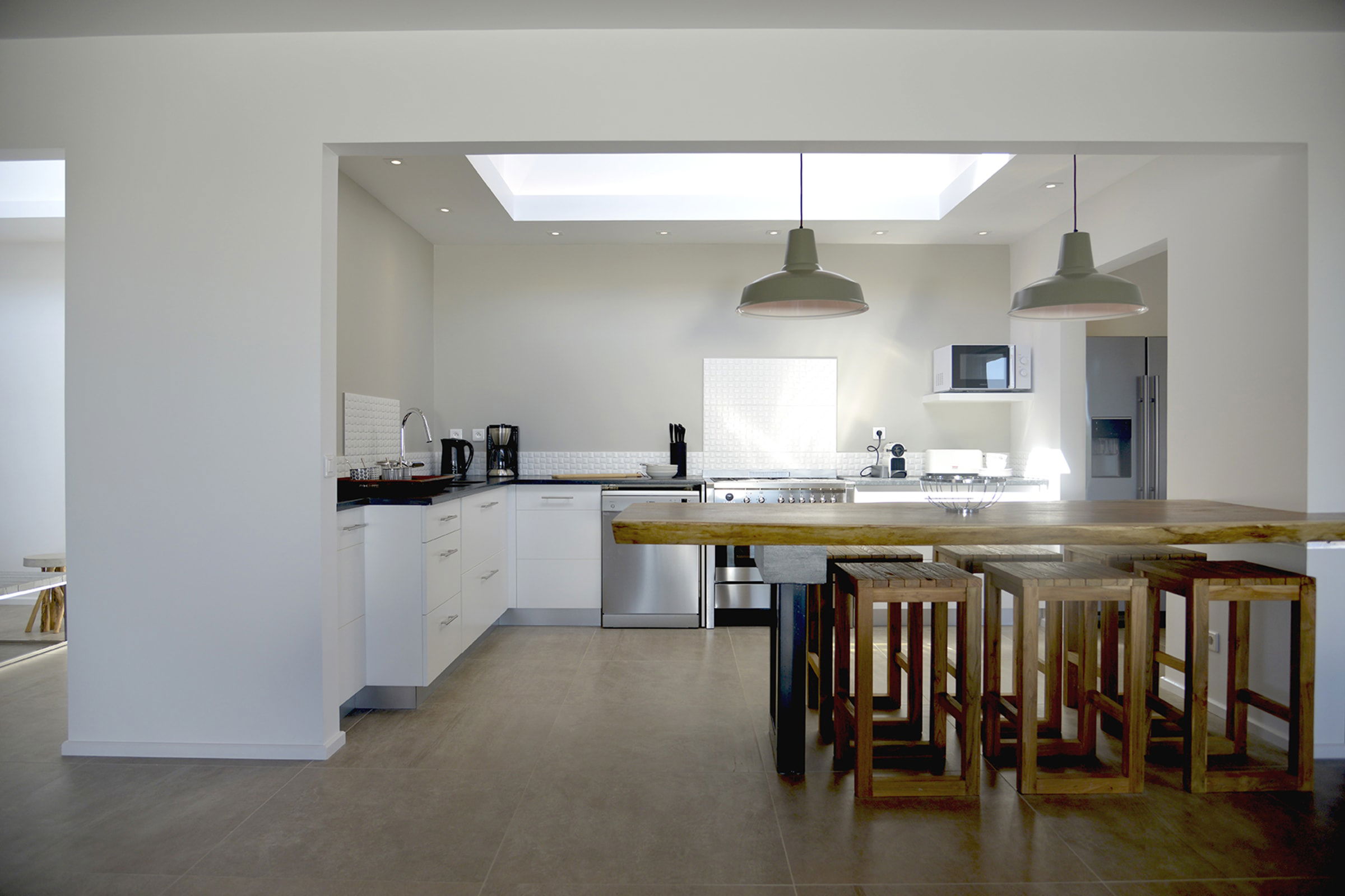 The bright living room on the main level, opens onto the terrace and infinity pool with ocean view. The decor is tasteful, simple, with a touch of arty flair to add character to your stay. The fully equipped kitchen with its 6 seats bar, partially opens to the air-conditioned living area with a 8 seats table, ideal for relaxed, convivial meals. Outside, a 15m long infinity pool merges with the sea and vegetation in the background.