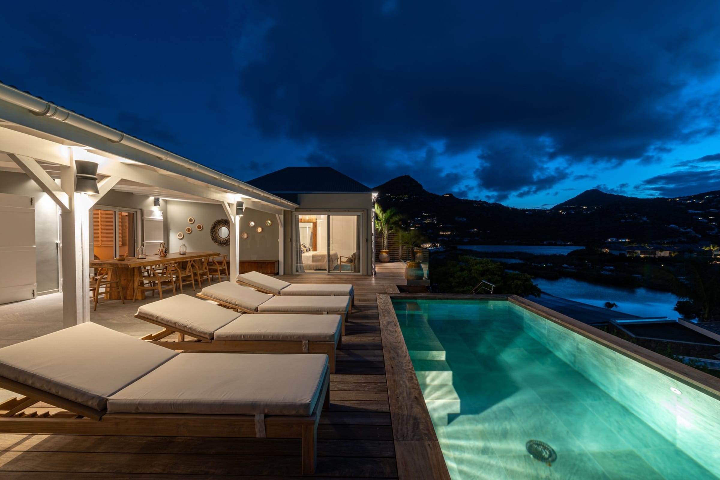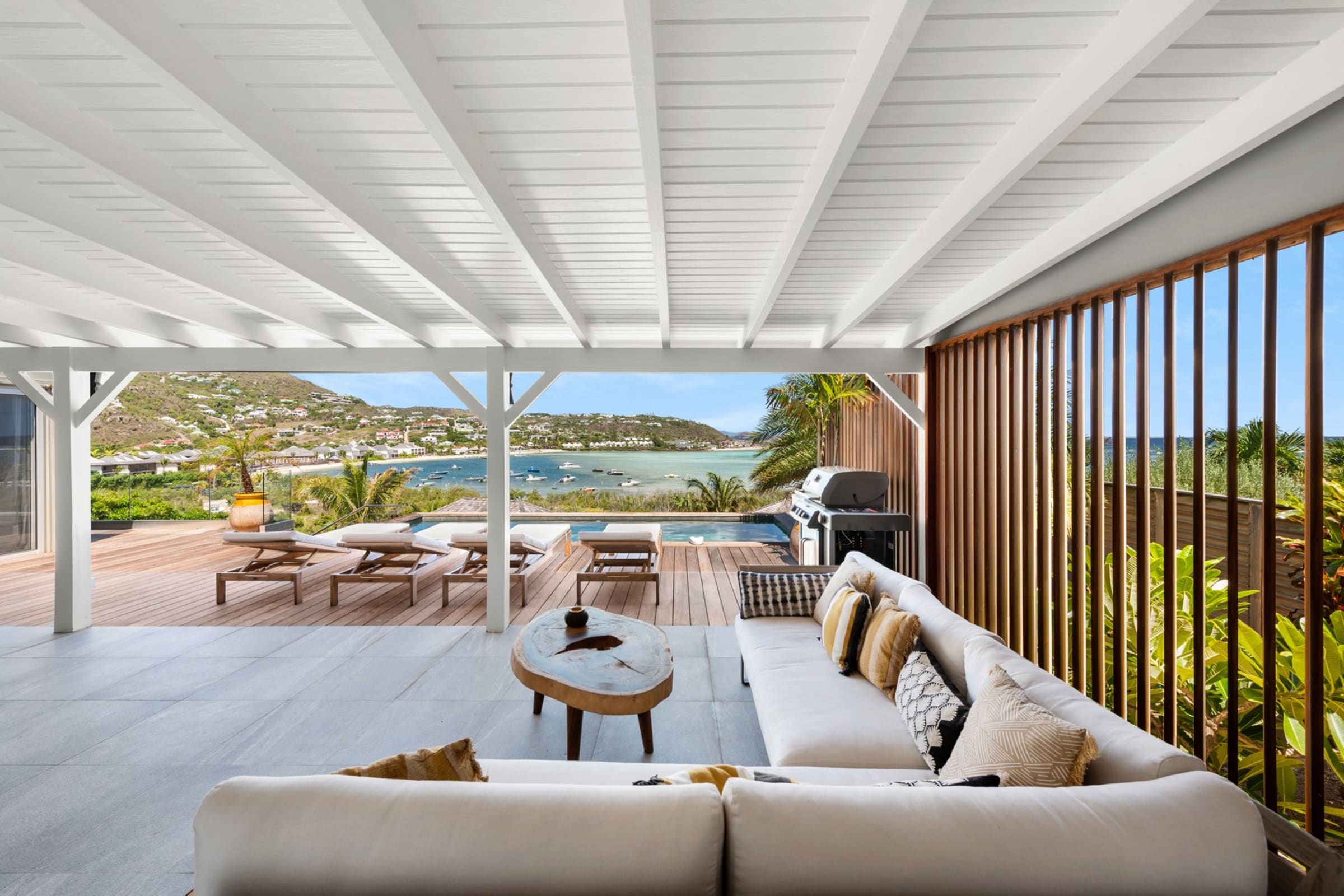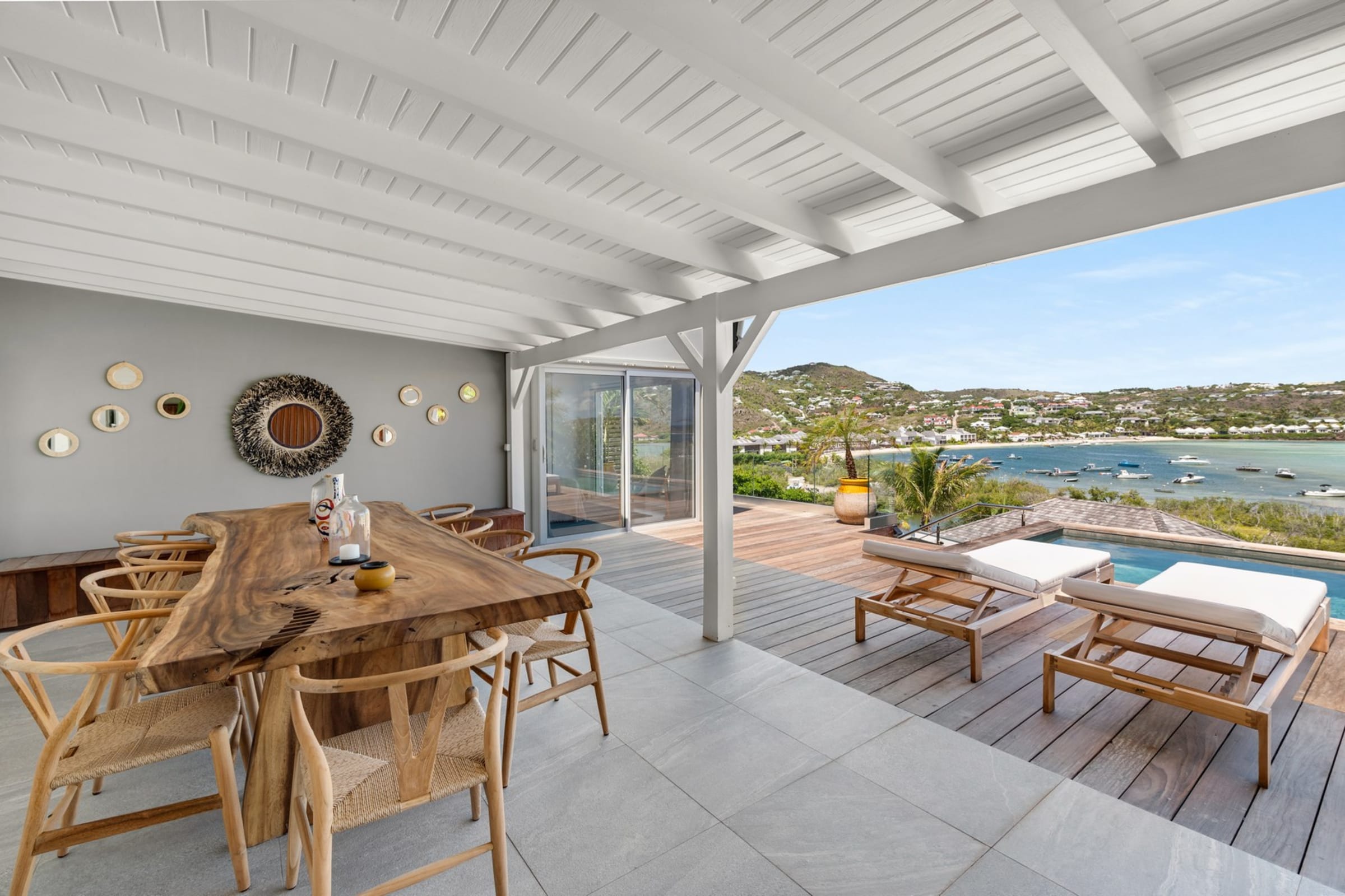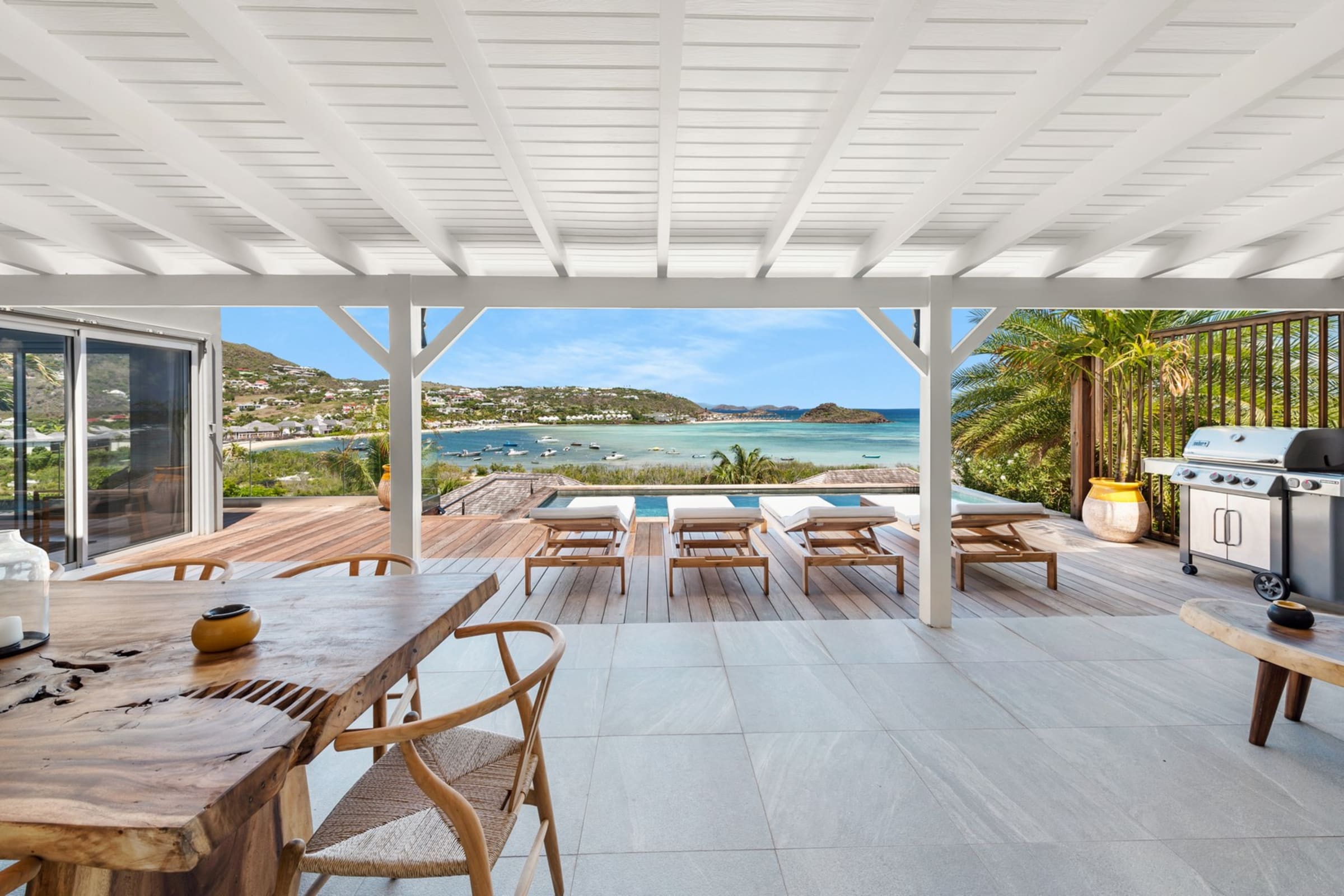 The terrace facing the lagoon offers an exceptional view of the stunning blue hues of Grand-Cul-de-Sac. Beneath the pergola, a beautiful raw wood table invites you to enjoy open-air meals, complemented by a cozy outdoor lounge. A little further down, the pool awaits you, surrounded by sun loungers for relaxing by the crystal-clear water. A barbecue is also available for convivial evenings under the stars.