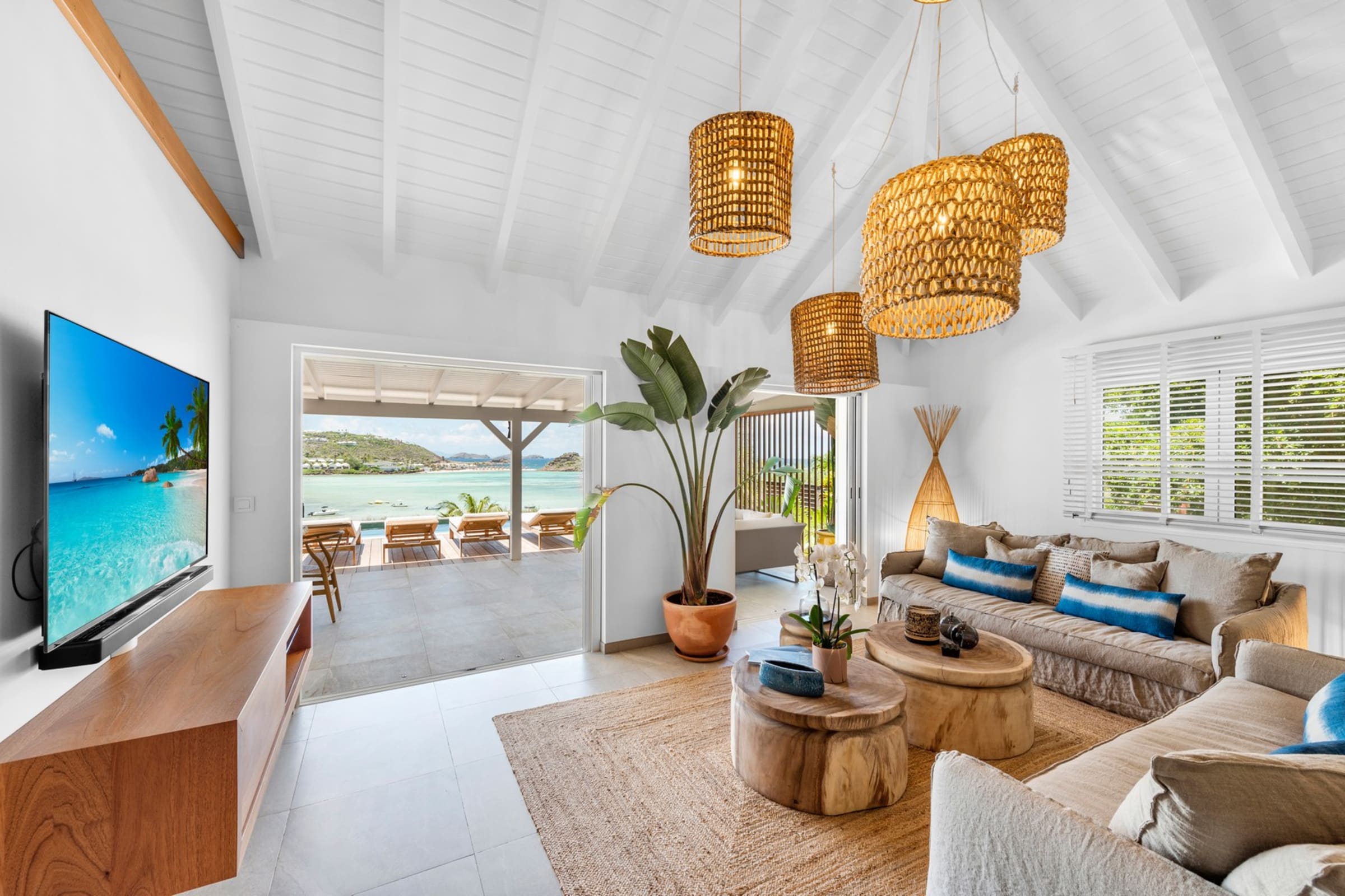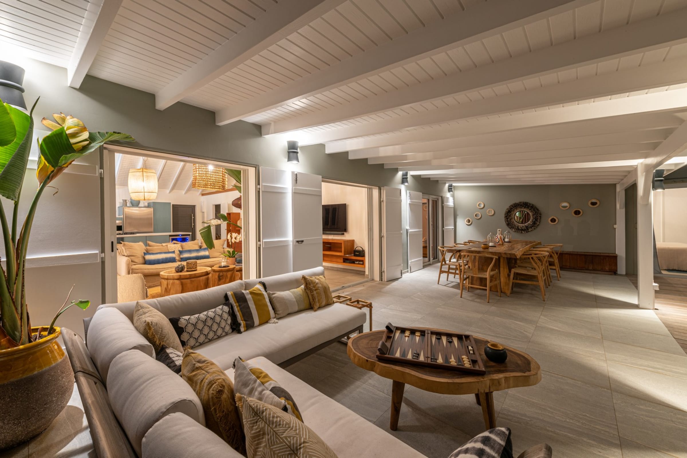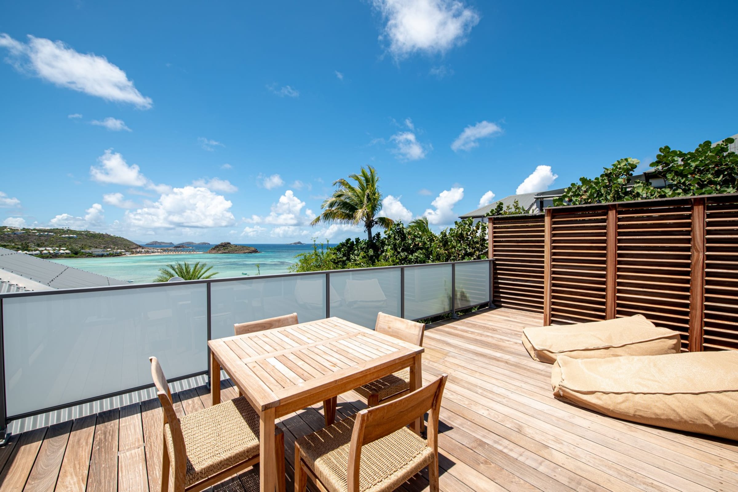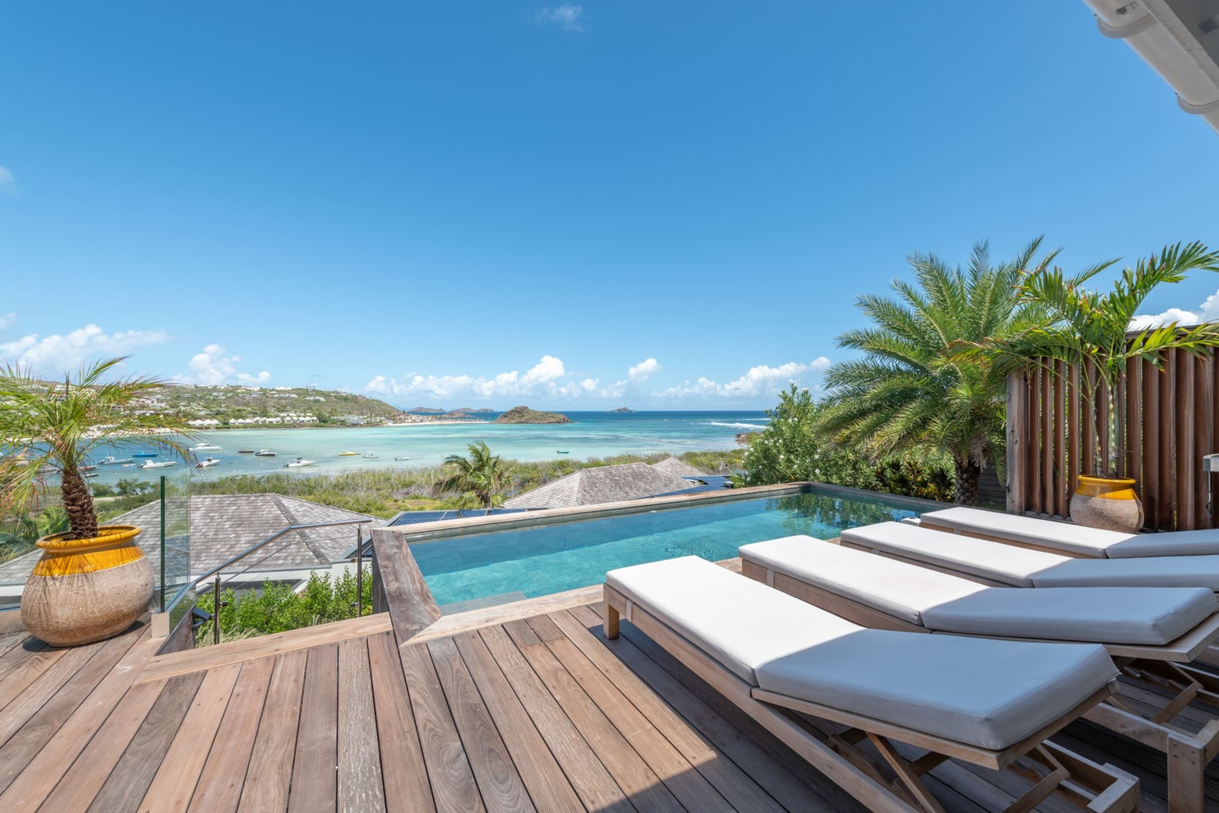 The terrace facing the lagoon offers an exceptional view of the stunning blue hues of Grand-Cul-de-Sac. Beneath the pergola, a beautiful raw wood table invites you to enjoy open-air meals, complemented by a cozy outdoor lounge. A little further down, the pool awaits you, surrounded by sun loungers for relaxing by the crystal-clear water. A barbecue is also available for convivial evenings under the stars.