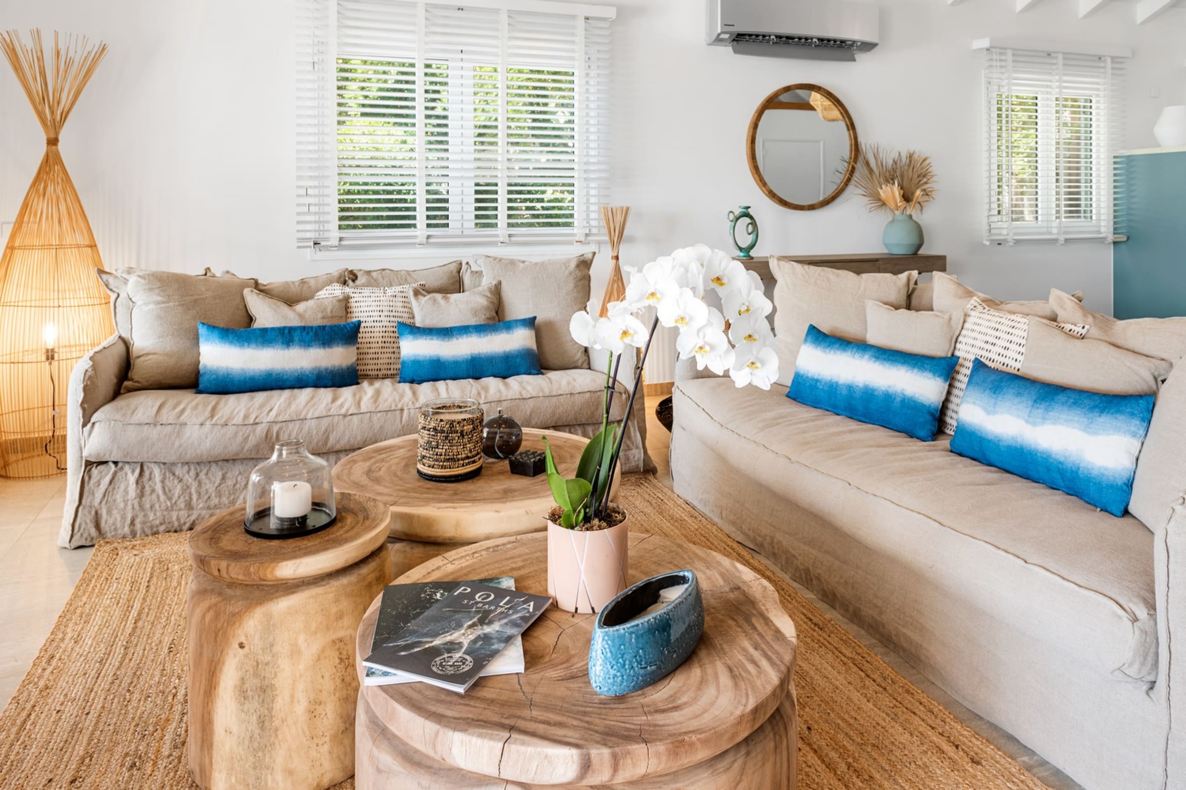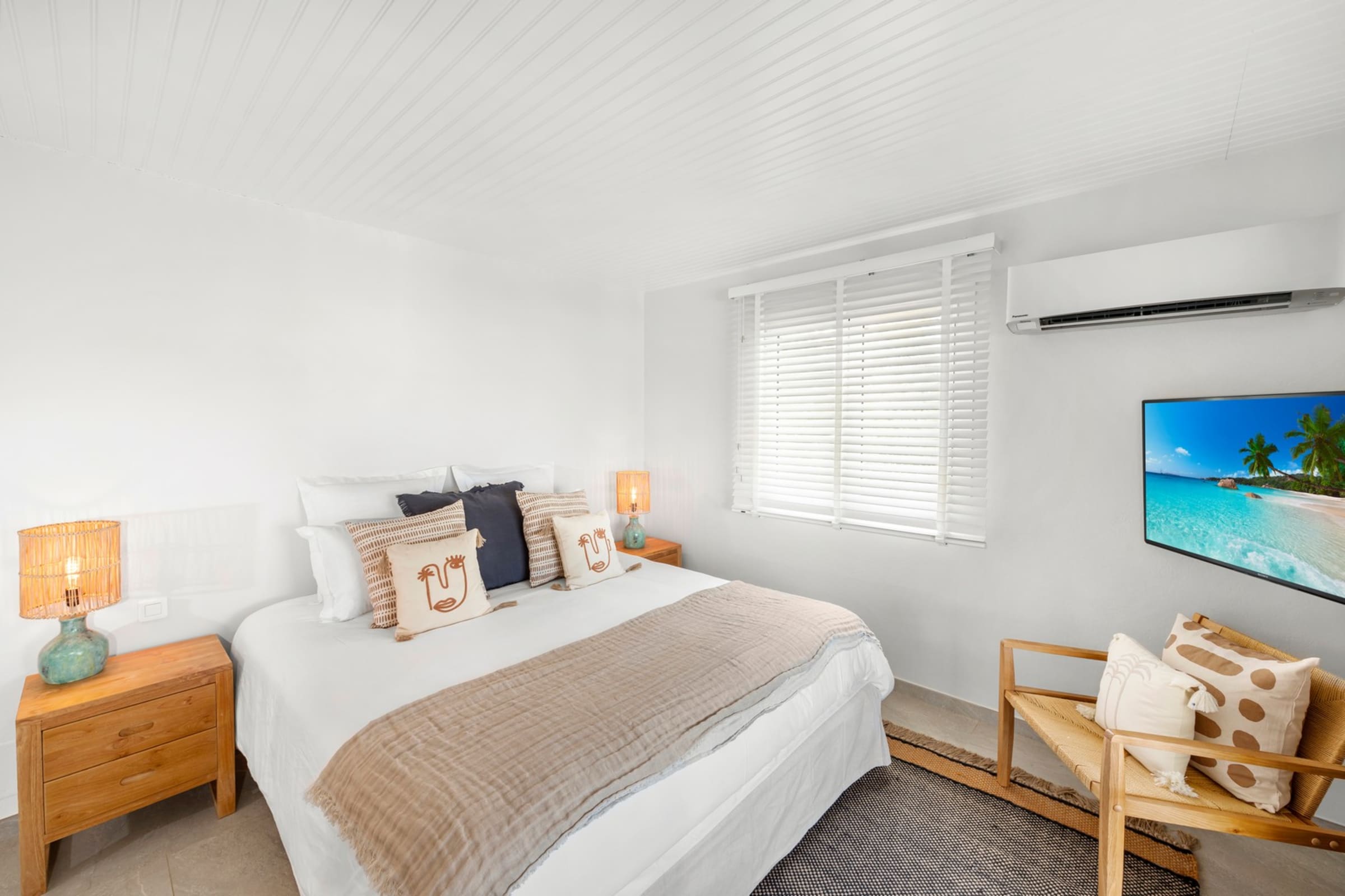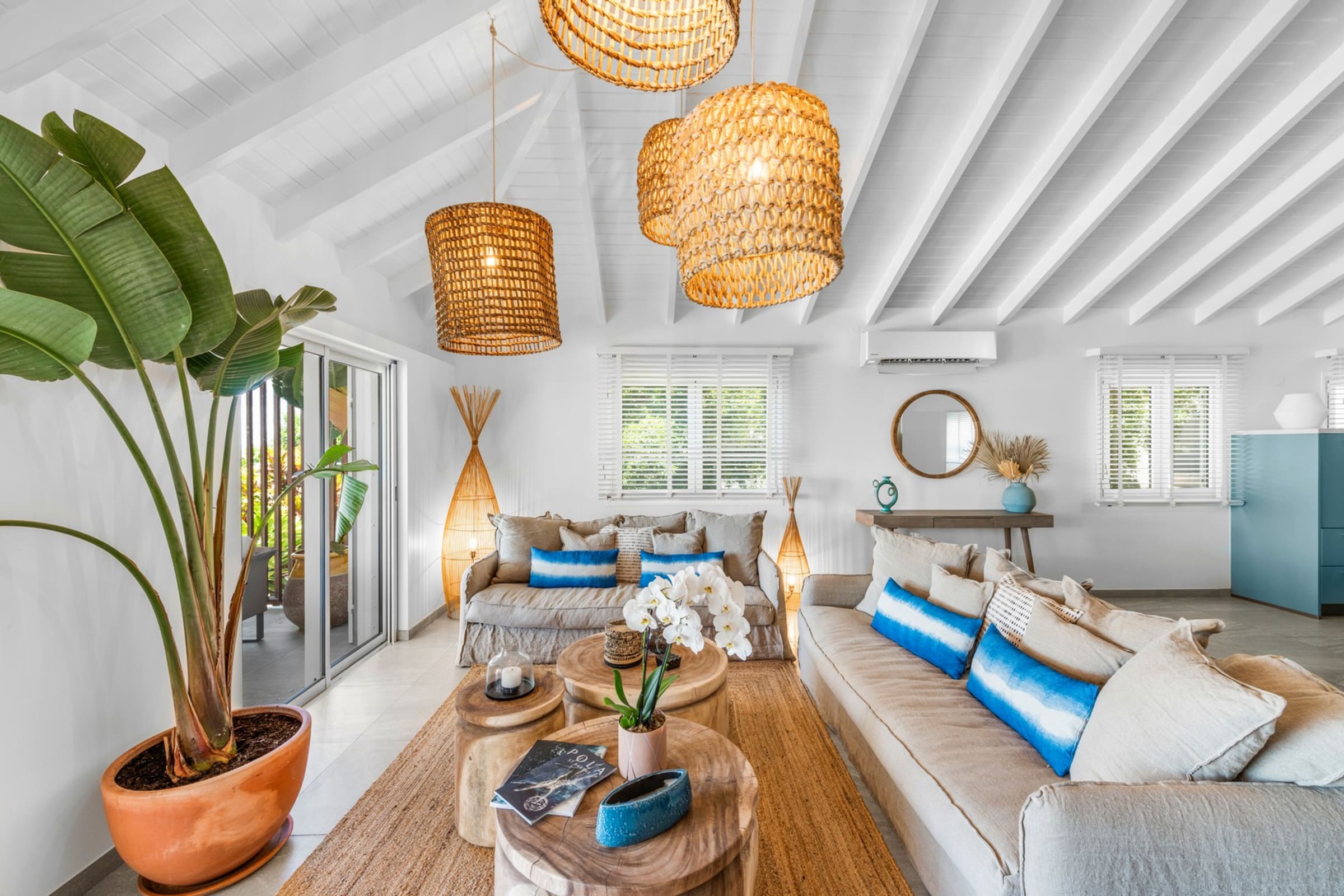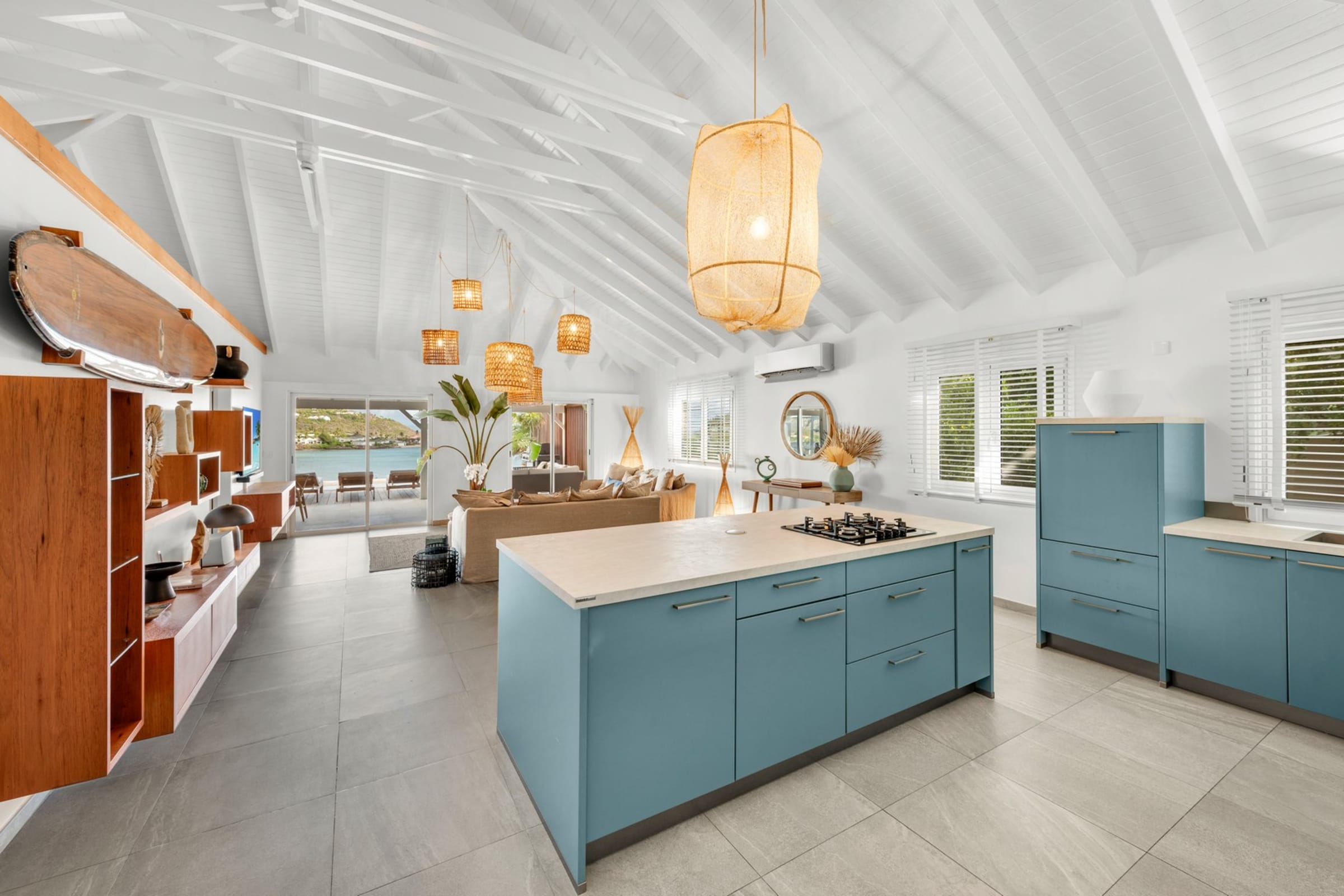 Comprising a main building and an independent bungalow, Villa Essenia is fully air-conditioned. The bright living room opens generously onto the outdoors and offers breathtaking views. Natural materials, light wood, and soft fabrics create a warm and modern ambiance. The fully equipped open-plan kitchen flows naturally into the living room and out to the terrace. Beneath the high ceilings, the trade winds circulate freely — unless you prefer the comfort of air conditioning for your relaxing moments.