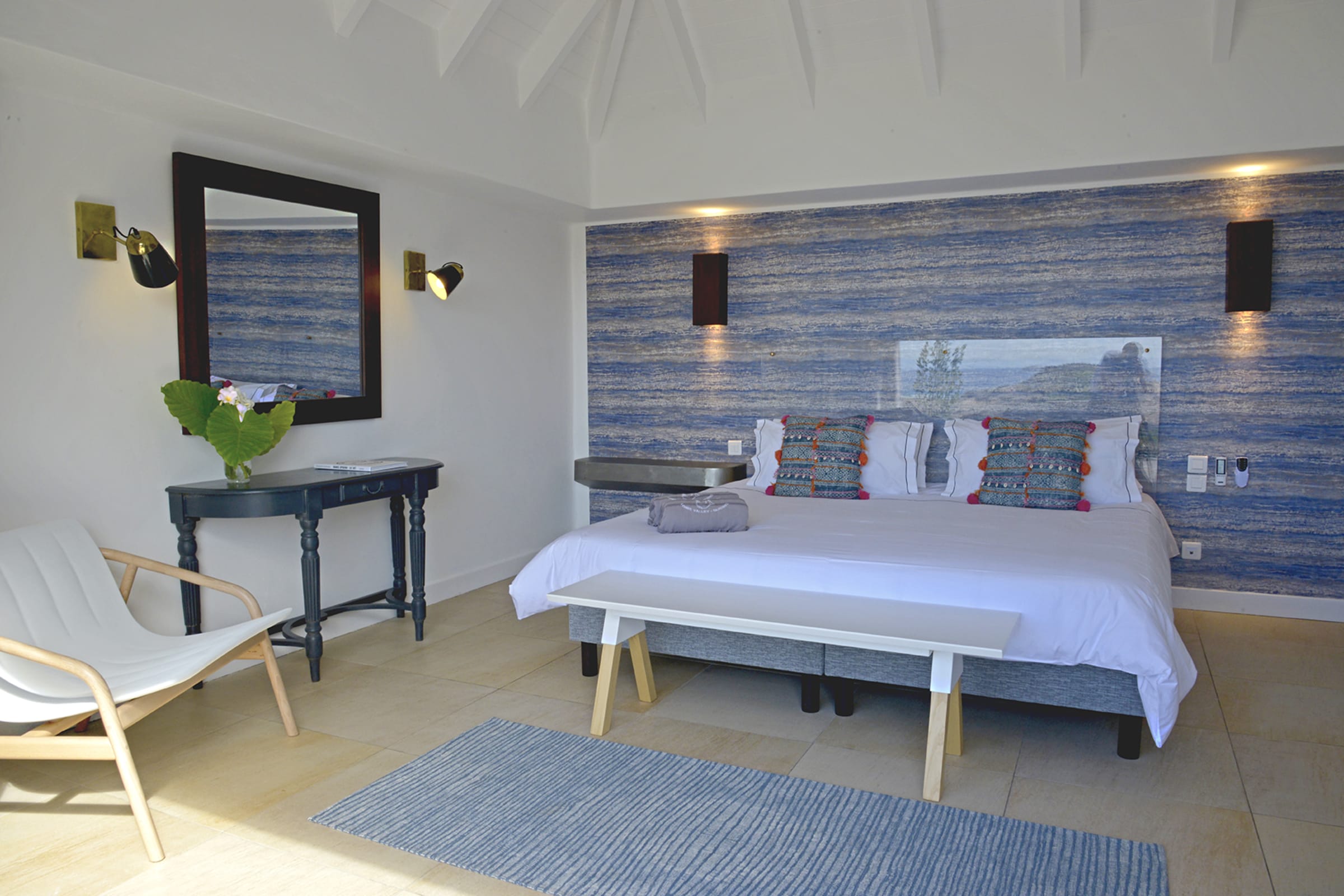 The living spaces of Villa Lagon Bleu are elegantly decorated in a subtle blend of authenticity and modern comfort. The fully equipped kitchen opens onto the dining area with its beautiful solid wood table. The main lounge is located outside under a covered terrace, while a cozy TV room is set in an adjacent indoor space.