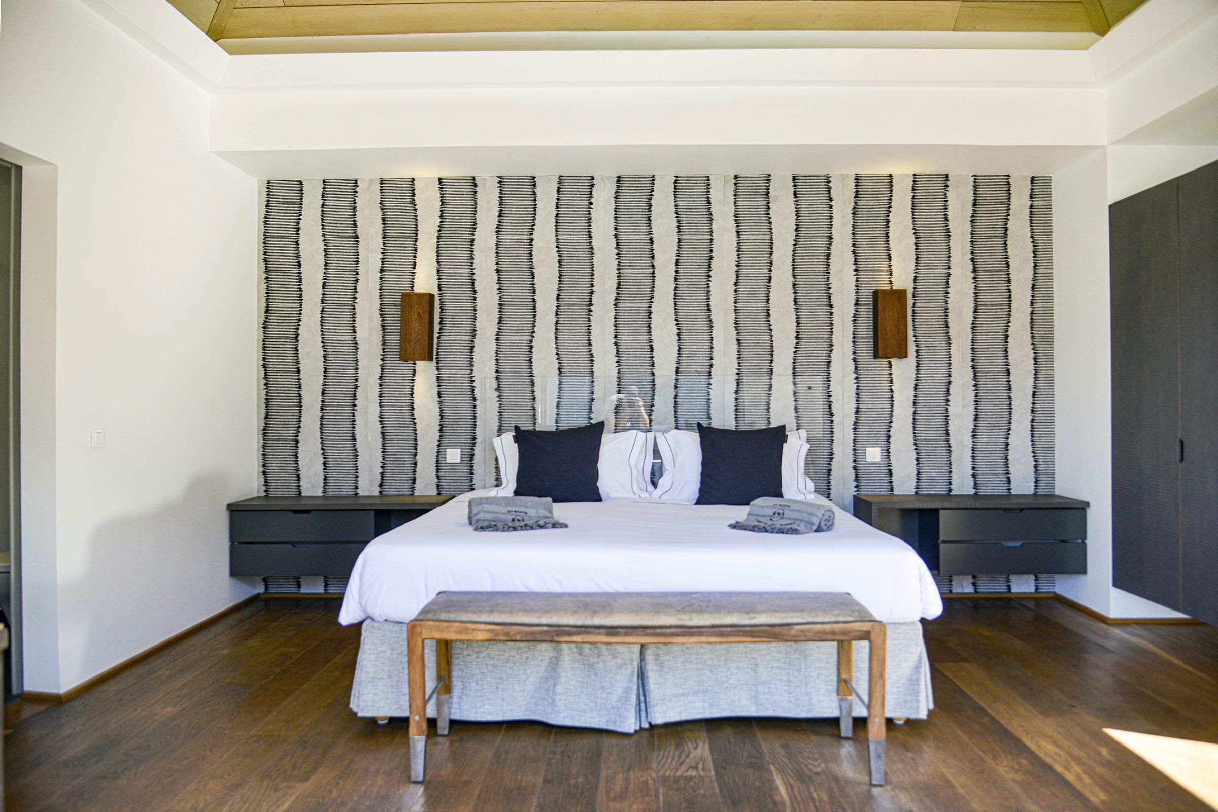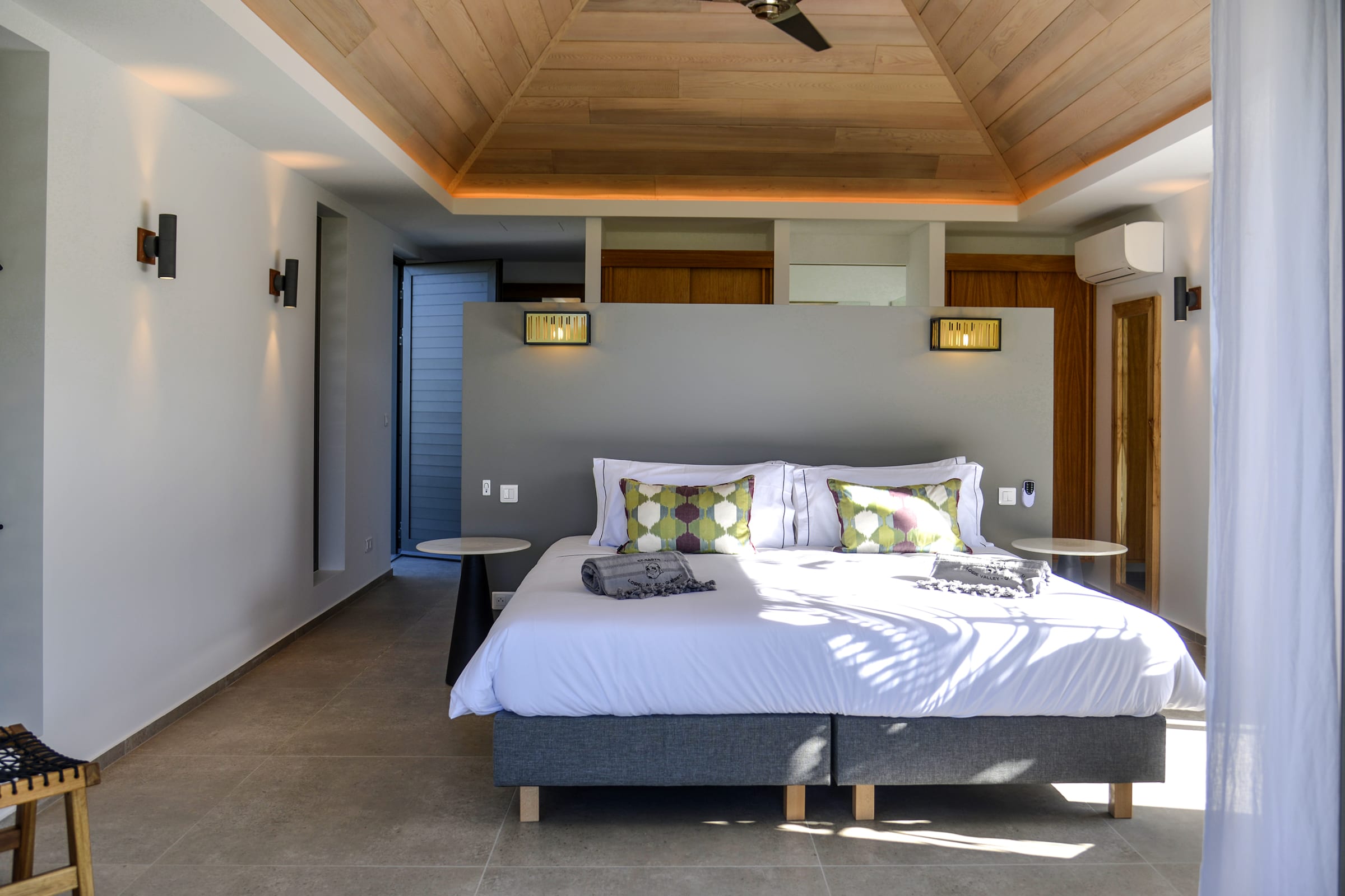 The villa features seven beautifully appointed, air-conditioned bedrooms, each offering a stunning view of either the ocean or the pool. Spacious and elegant, every suite is furnished with a king-size bed and a private en-suite bathroom. Sloped ceilings add a sense of openness, while refined textiles in soft, neutral tones enhance the peaceful, sophisticated atmosphere of these restful retreats.