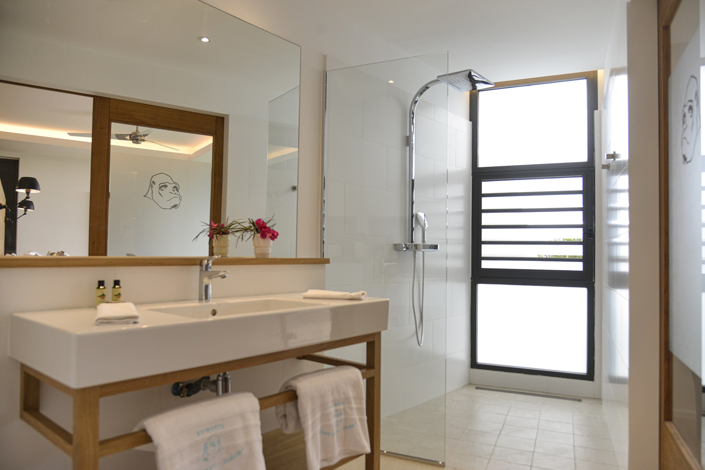 The fully equipped kitchen opens onto a beautiful solid wood dining table for 8 guests. Just beyond, the TV lounge features comfortable sofas and armchairs, a flat-screen TV, and a ceiling fan. Thanks to its large openings, the living spaces are filled with natural light and offer stunning sea views.