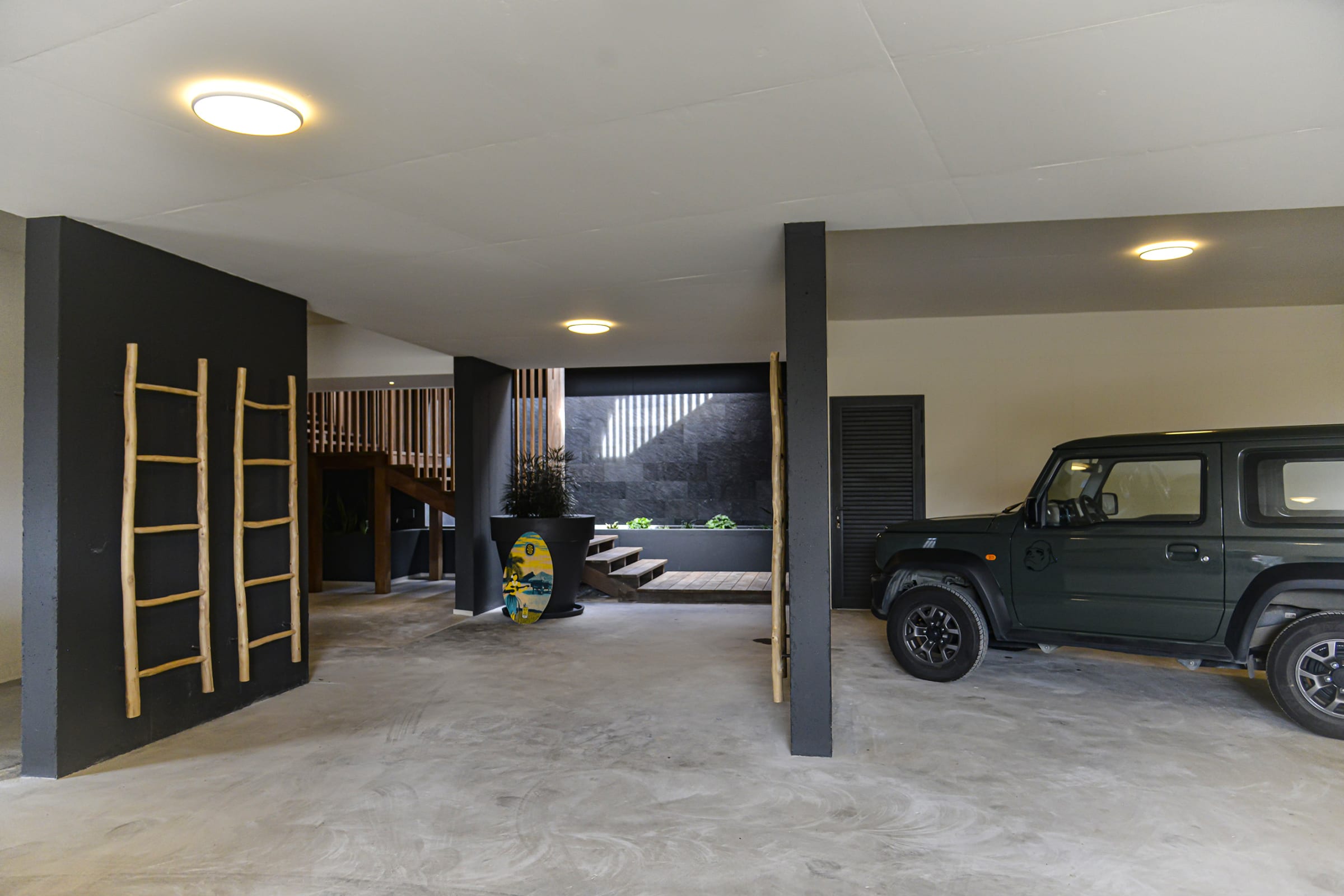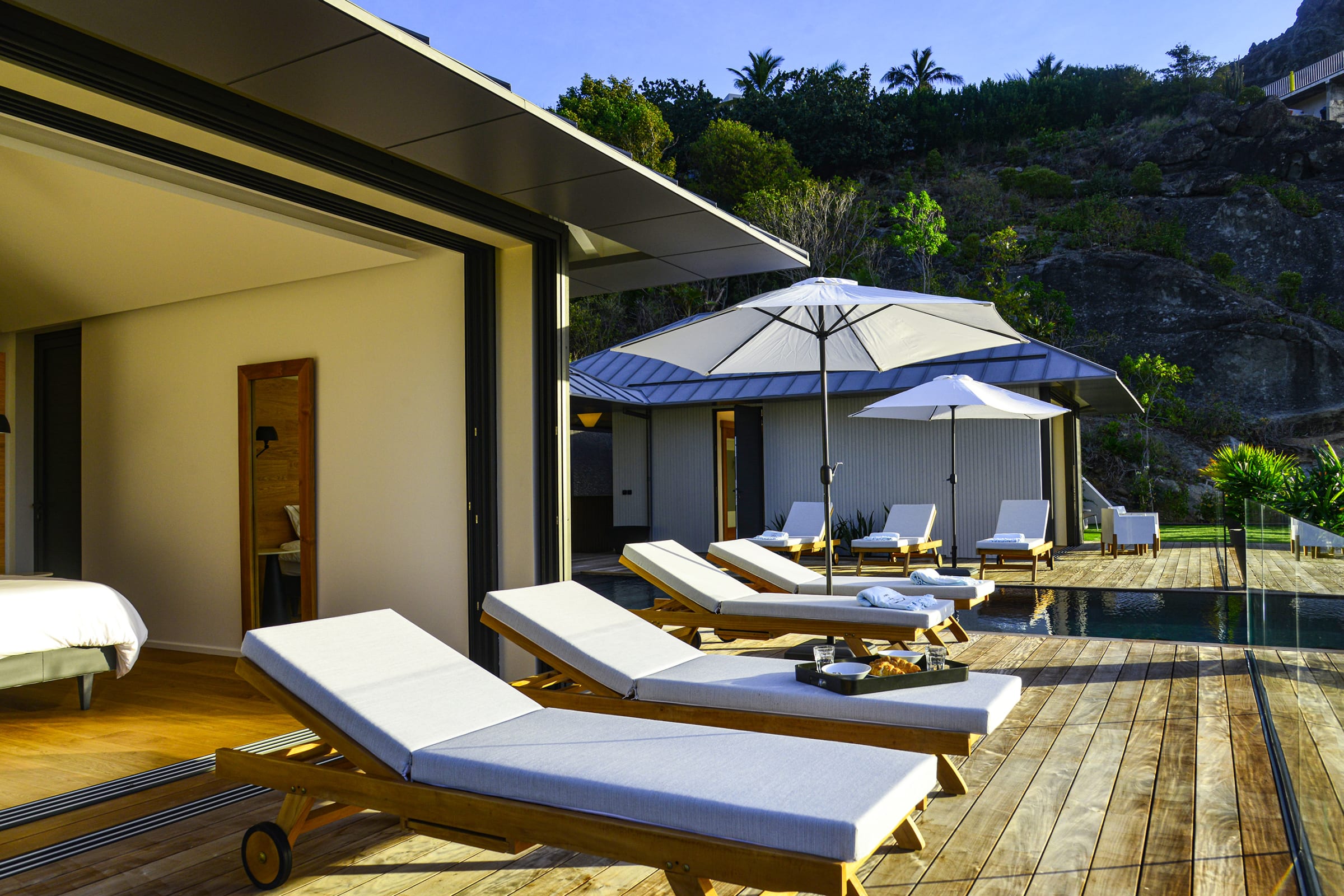 Under the covered terrace, you'll find a cozy outdoor lounge. Beyond it, the stunning infinity pool appears to flow into the ocean. Sun loungers and parasols invite you to relax, while a garden-side dining table provides a tranquil spot for outdoor meals.