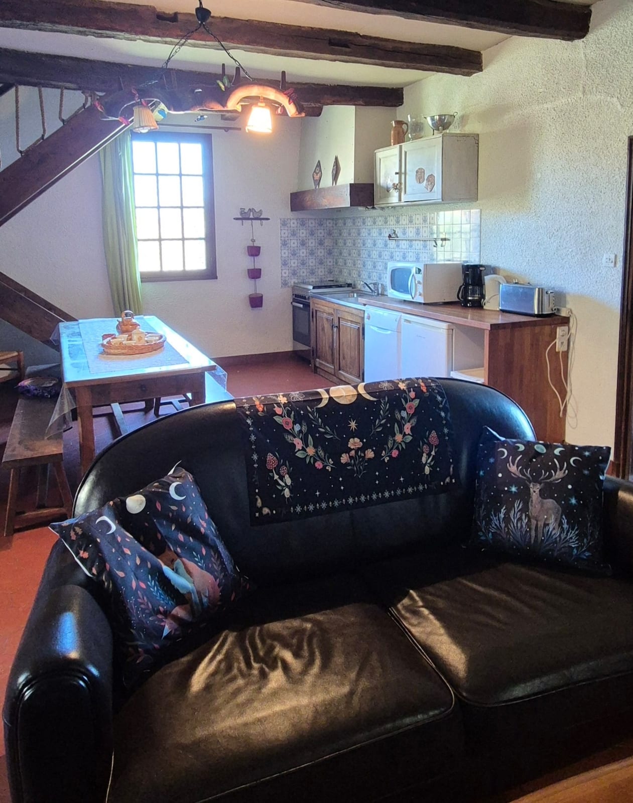 Au rez-de-chaussée : une cuisine ouverte -salon- salle à manger, une chambre (3 lits 90 cm) et une salle d’eau avec wc séparé.