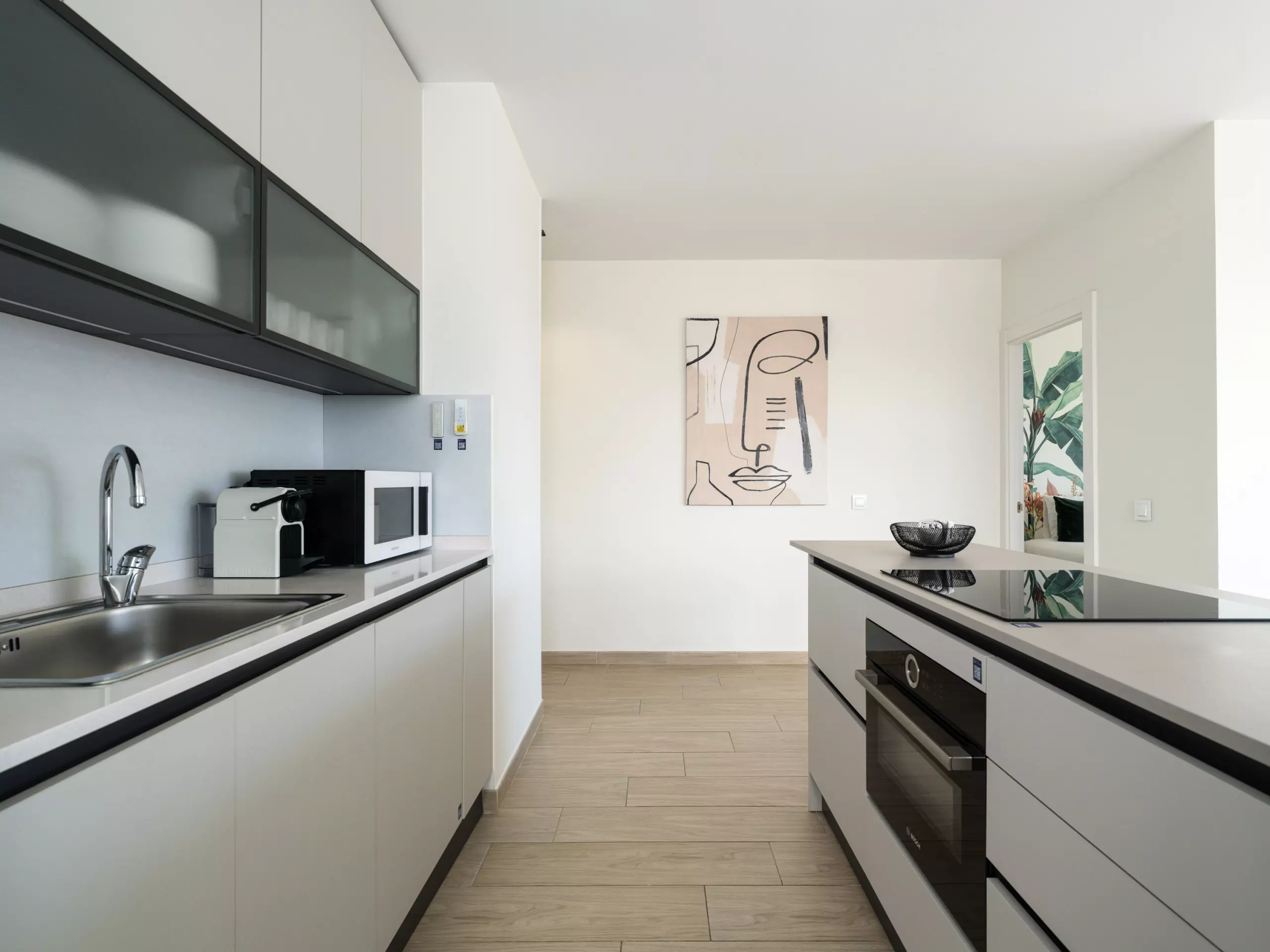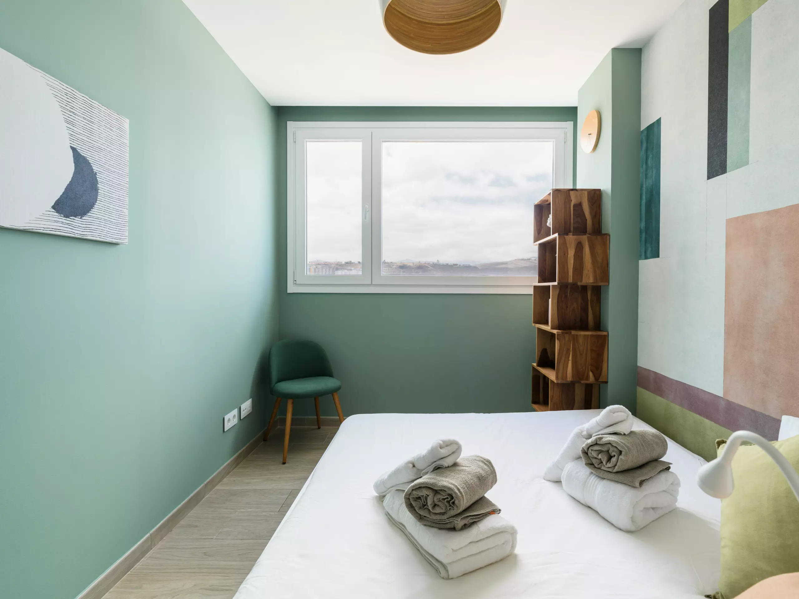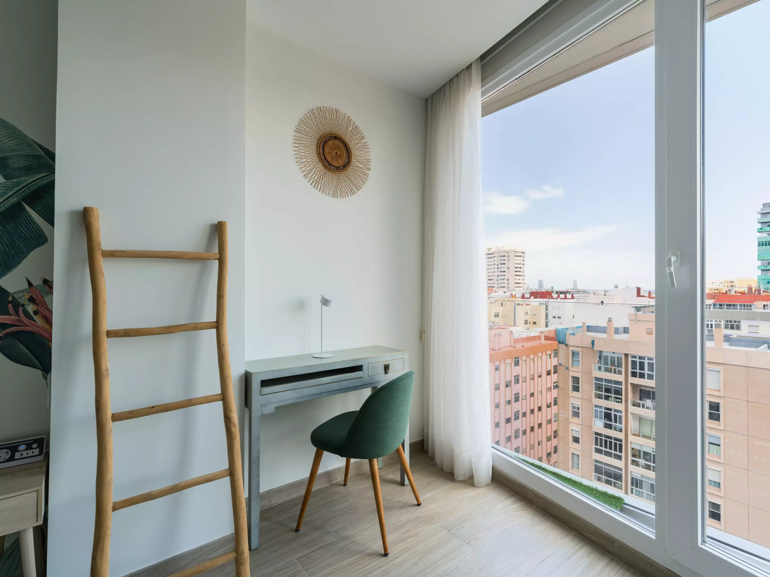 Its features include a balcony with sea and city views, a living room with a sofa, a dining area, an HD TV, Wi-Fi, a work desk, and an ironing area. The apartment is tastefully decorated and features details such as coat racks, built-in wardrobes, and quality bedding.