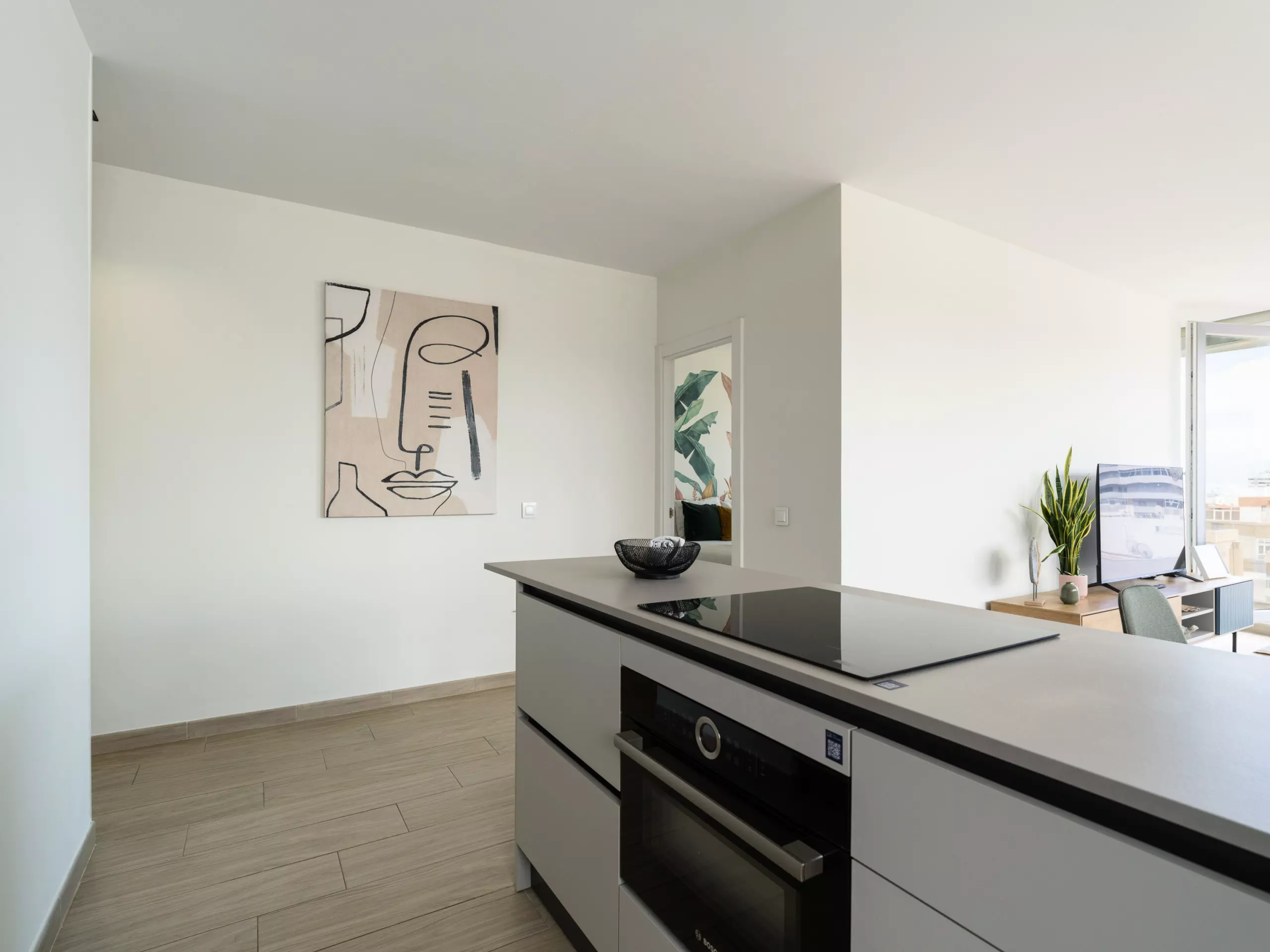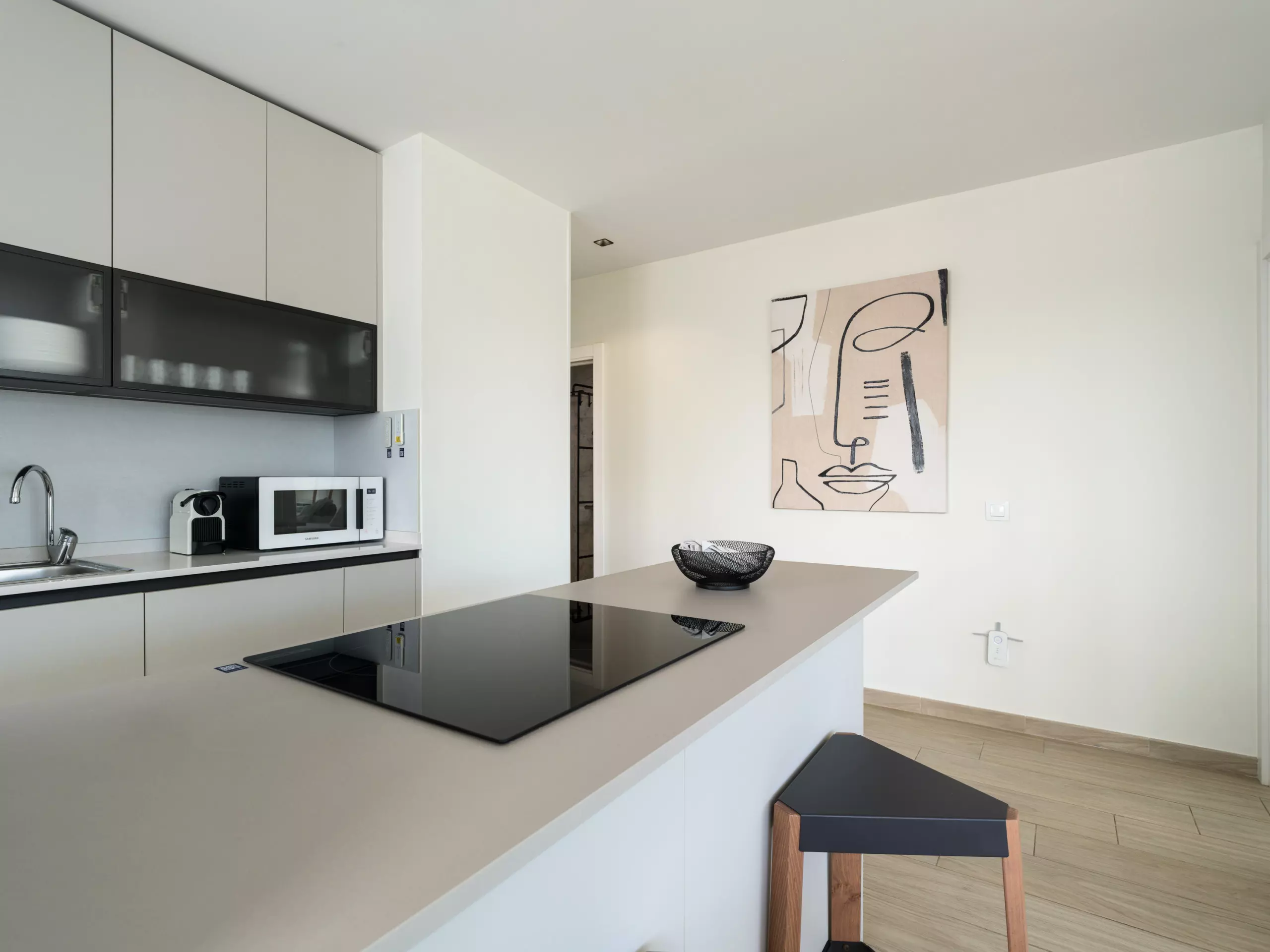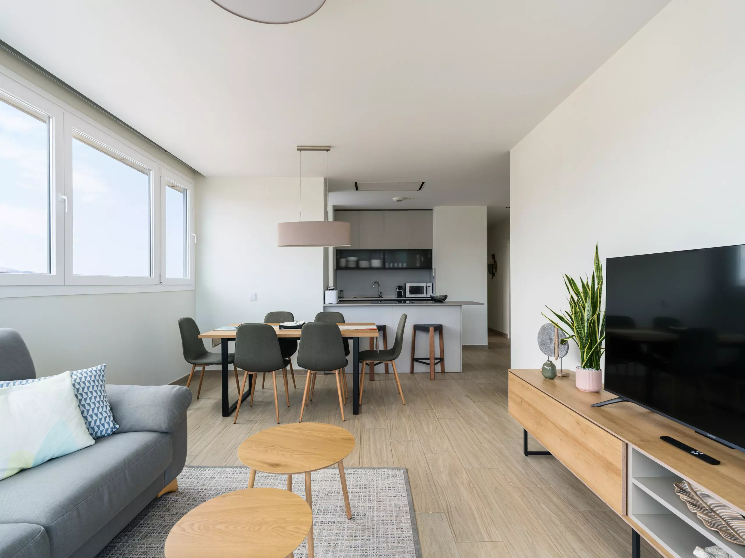 Its features include a balcony with sea and city views, a living room with a sofa, a dining area, an HD TV, Wi-Fi, a work desk, and an ironing area. The apartment is tastefully decorated and features details such as coat racks, built-in wardrobes, and quality bedding.