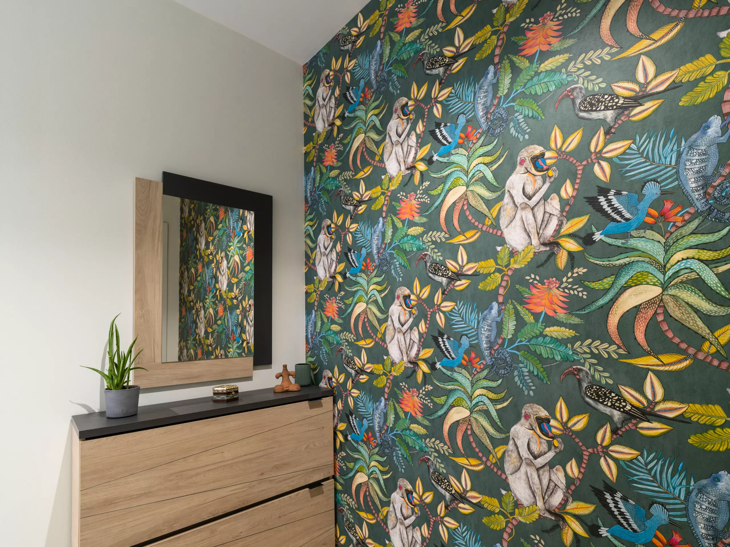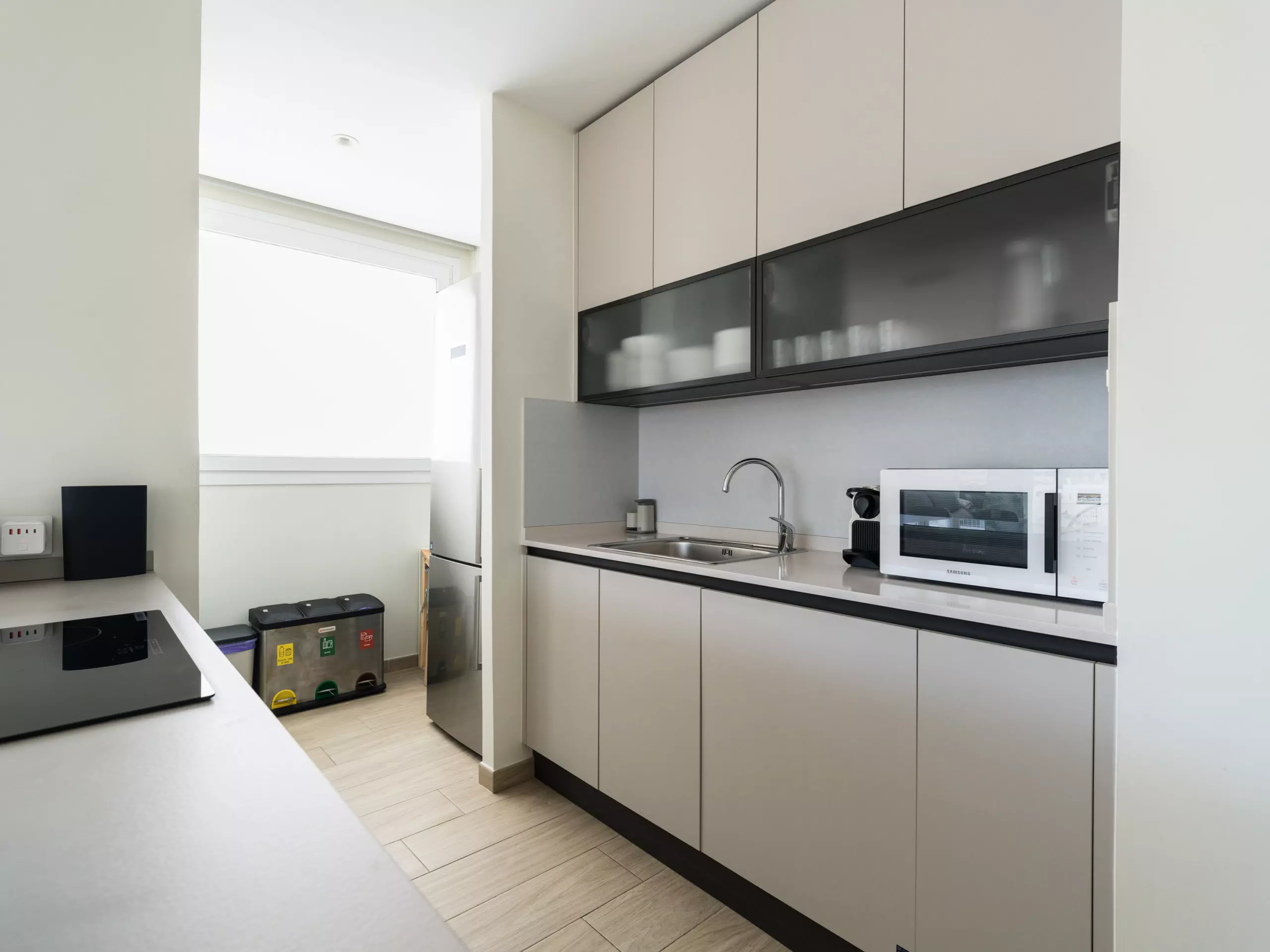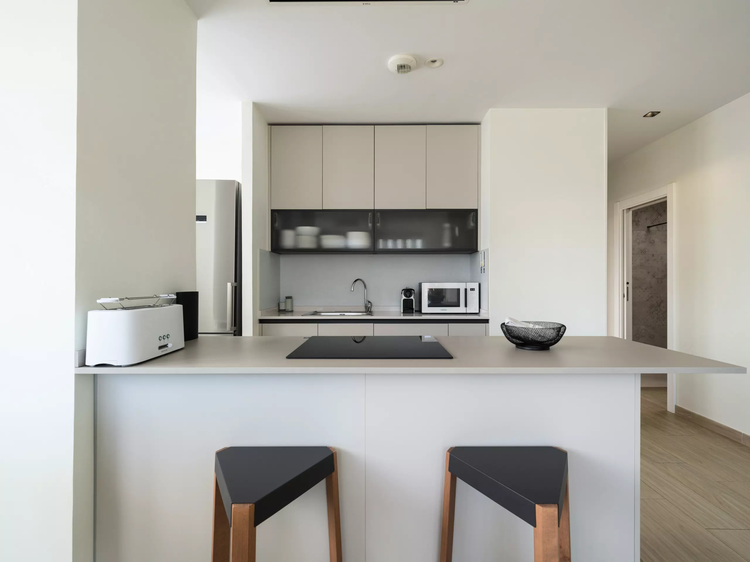 The open-plan kitchen is fully equipped with state-of-the-art appliances, including a refrigerator, freezer, washing machine, dryer, dishwasher, oven, microwave, coffee maker, toaster, kettle, and juicer. Perfect for preparing meals and enjoying gourmet moments with the family.