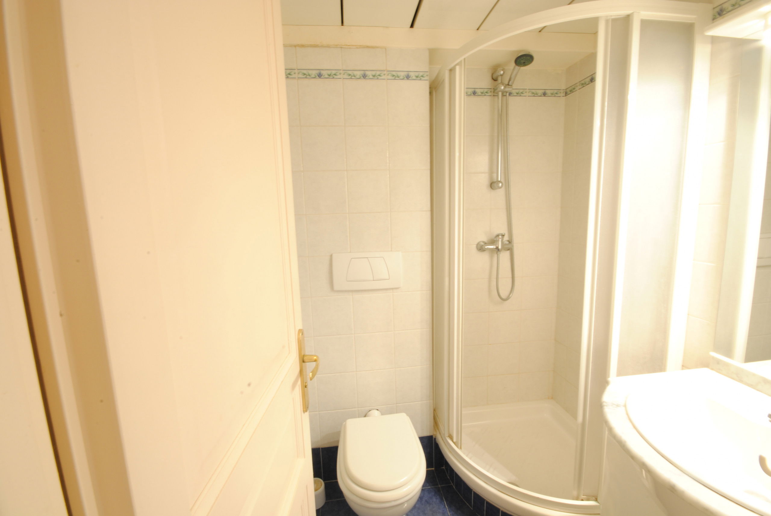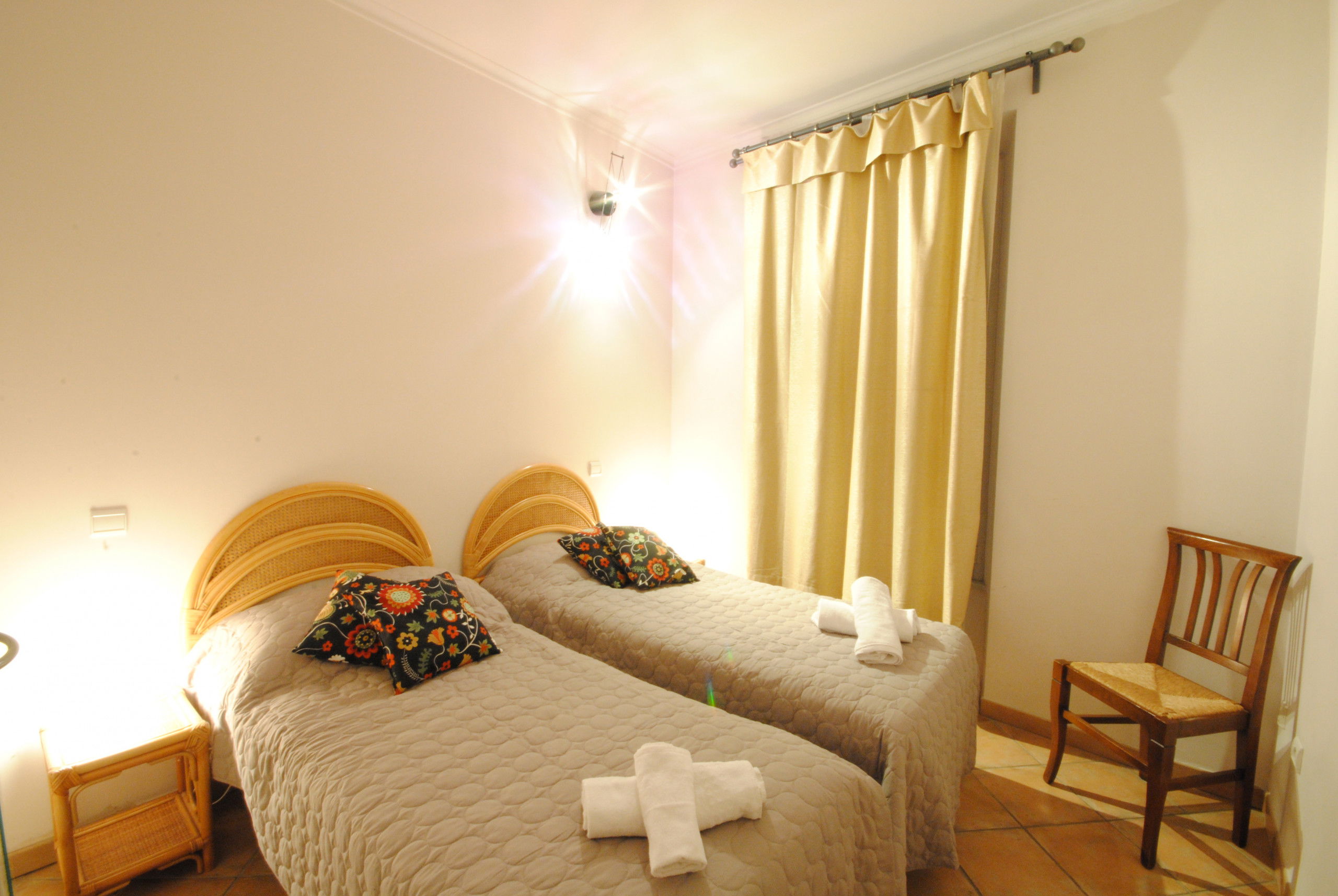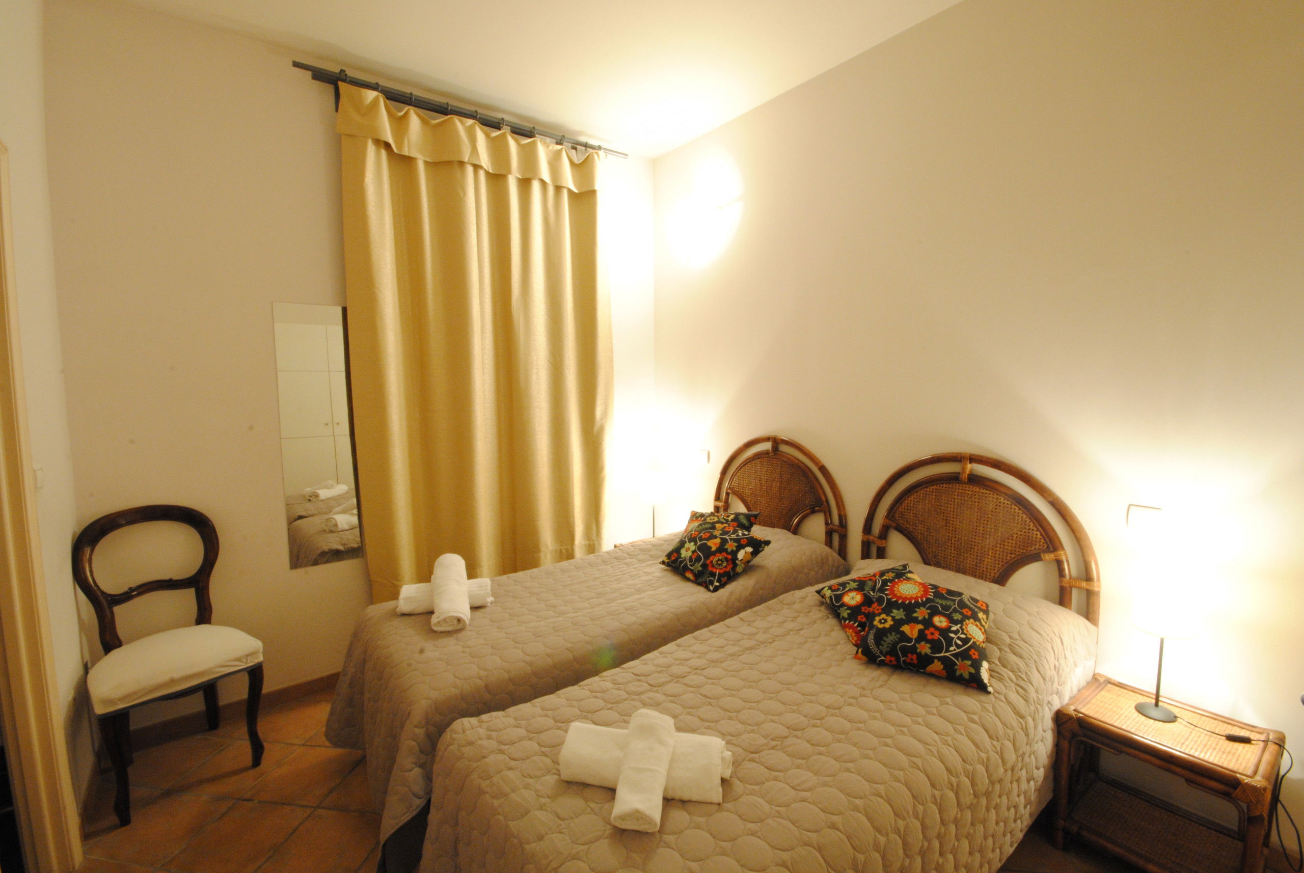 A bedroom with twin beds and an ensuite bathroom with WC.