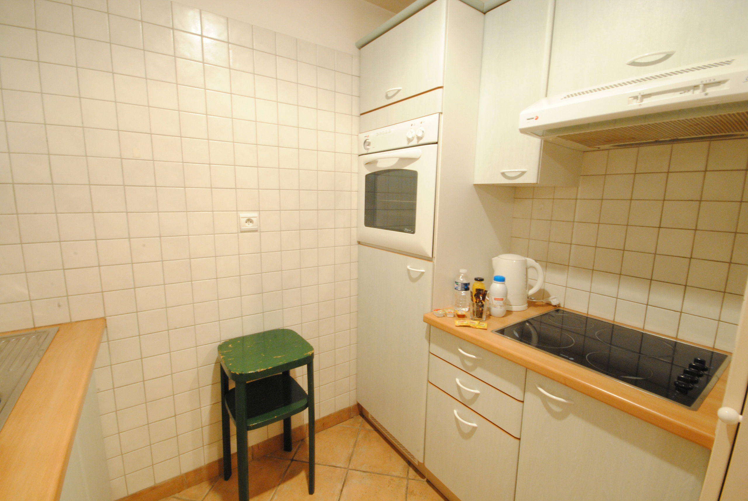 A fully equipped kitchen with a washing machine, 2-burner stove, small refrigerator, Nespresso coffee maker, kettle, and microwave.