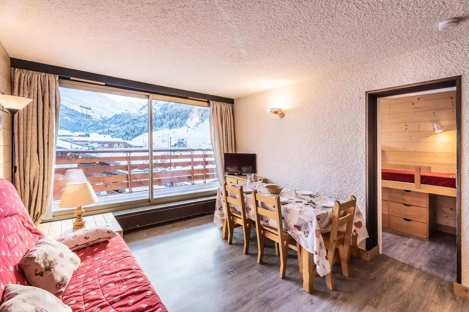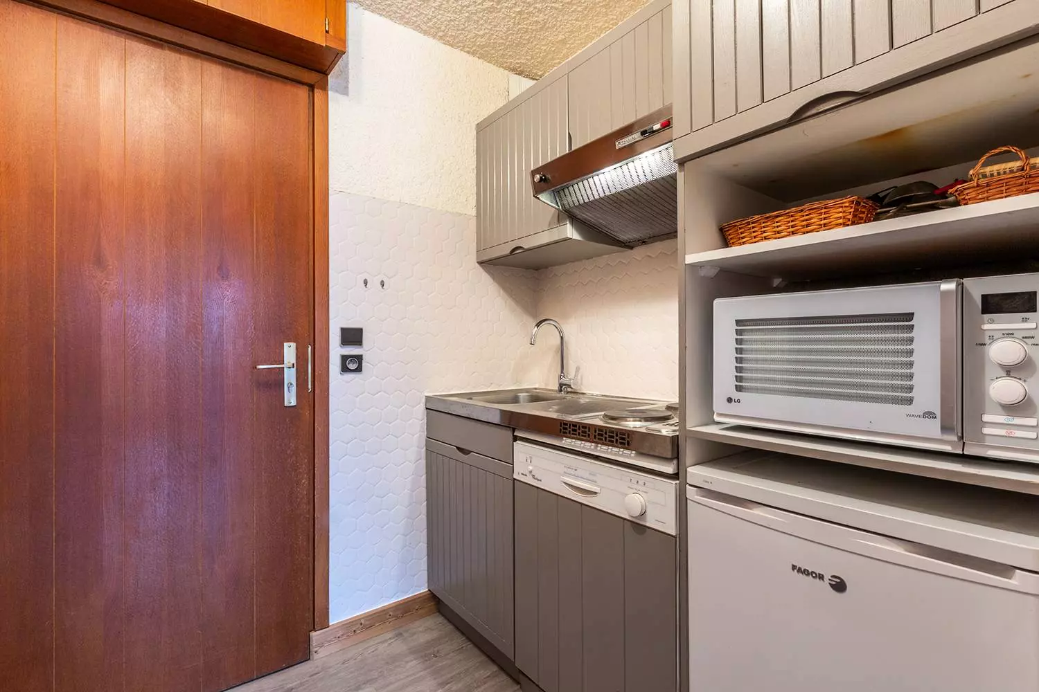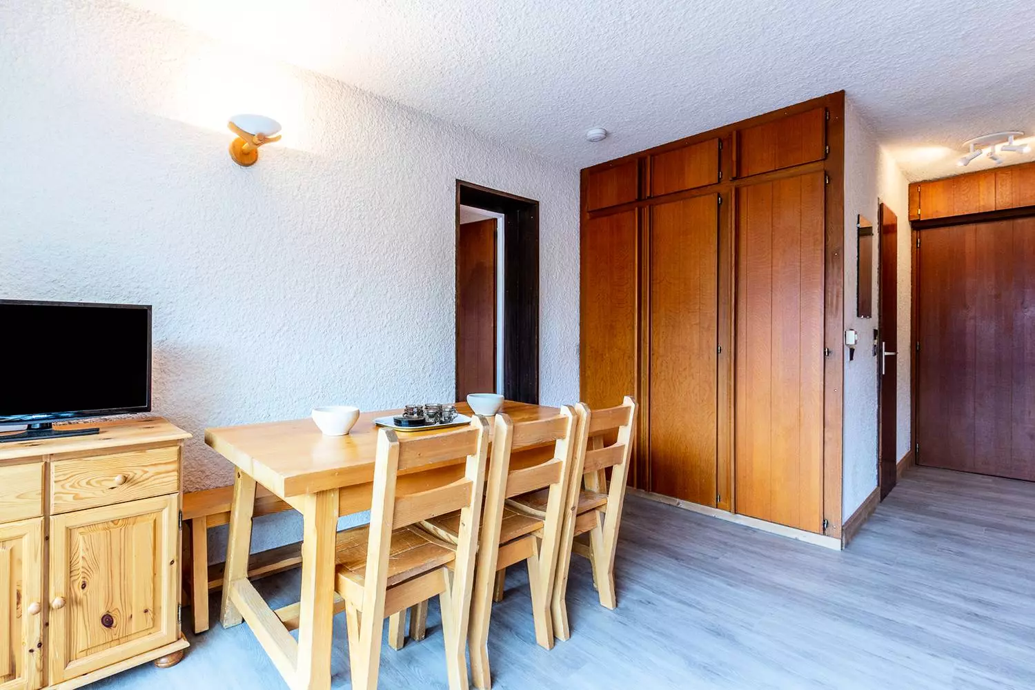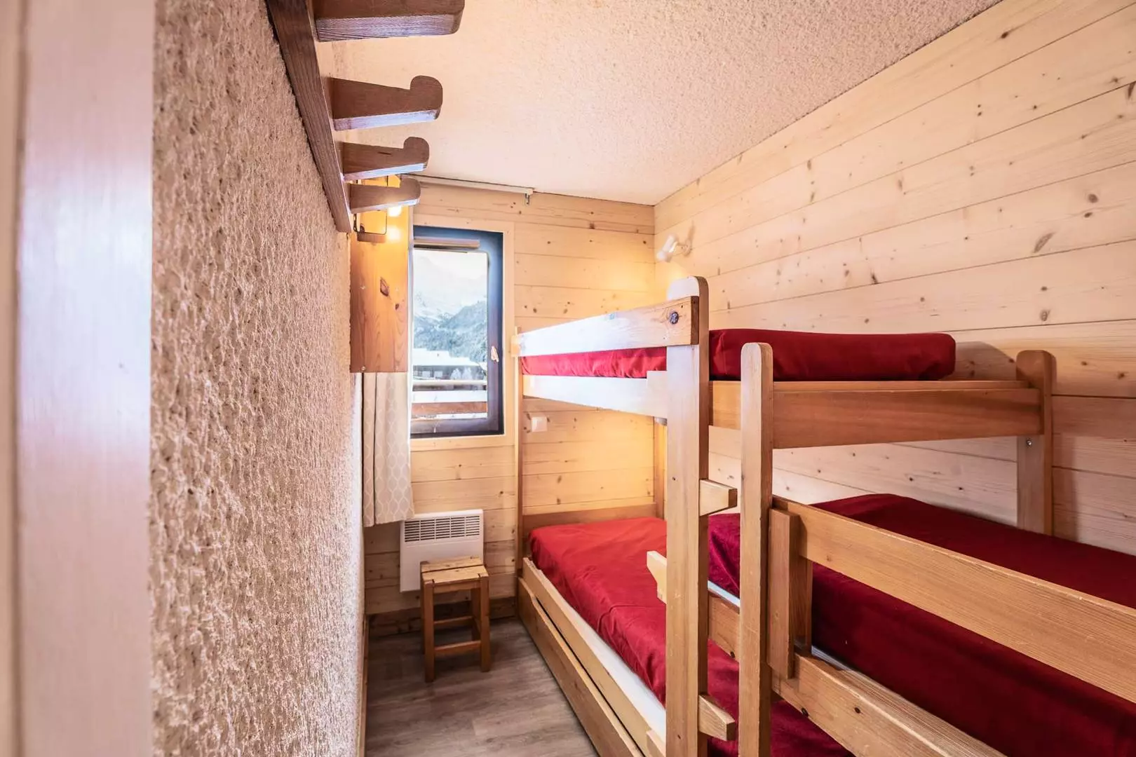 Living room with a sofa bed (140x190) and television. Bedroom with 3 bunk beds (80x190). Kitchenette in the entrance equipped with hotplates, microwave, dishwasher, kettle, coffee maker, toaster and refrigerator. Bathroom with toilet. South-facing balcony. Non-smoking apartment. Ski locker and elevator in the residence. Located on the 3rd floor. Pets not allowed.