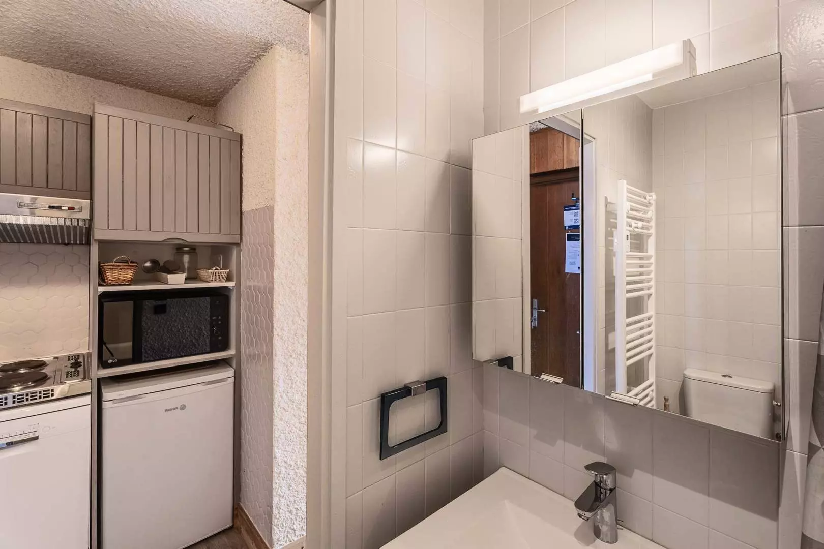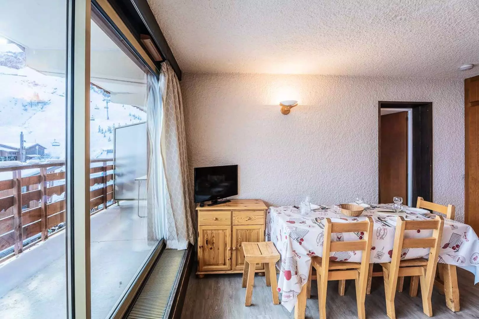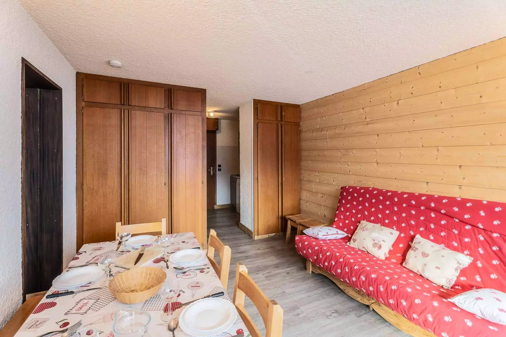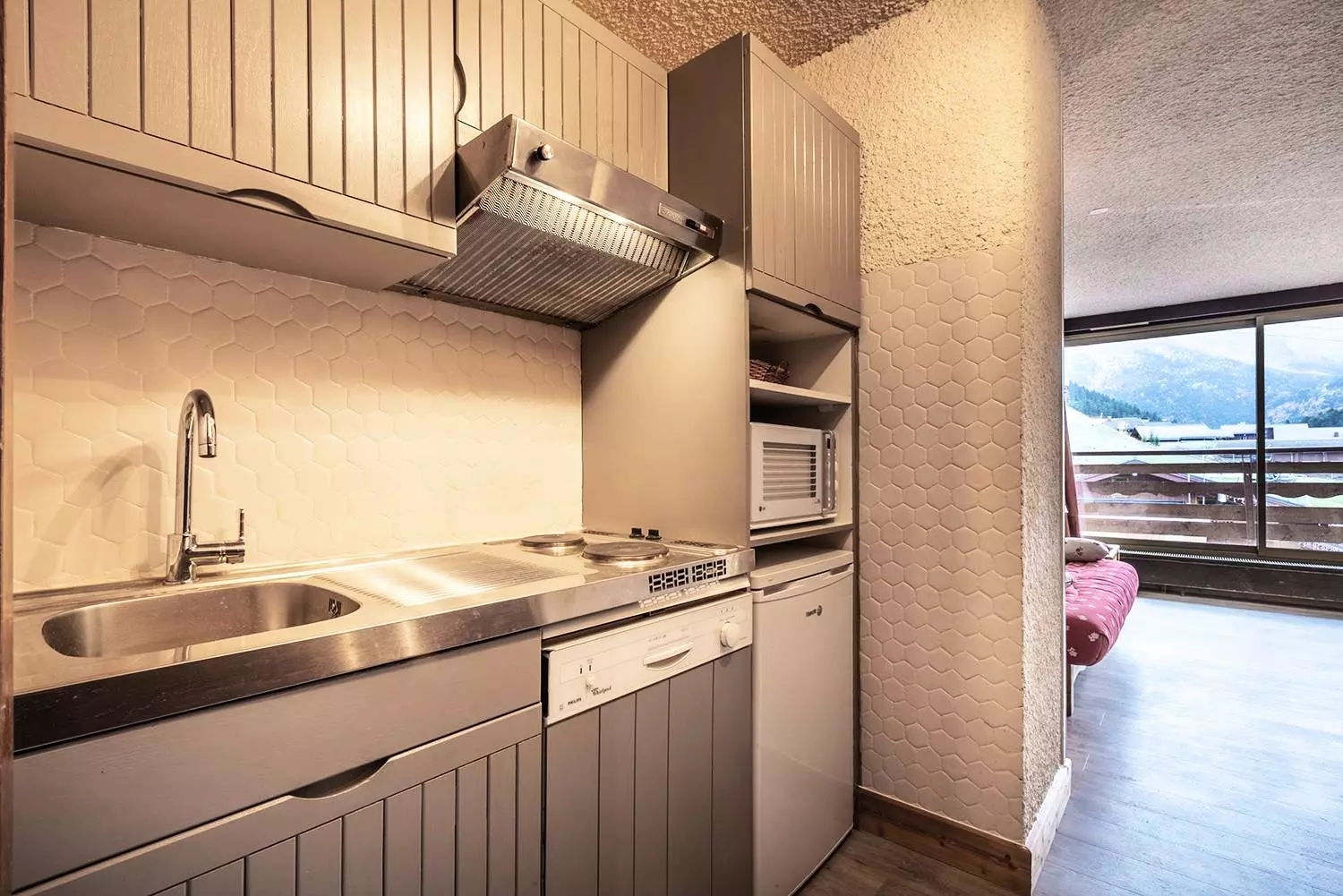 Living room with a sofa bed (140x190) and television. Bedroom with 3 bunk beds (80x190). Kitchenette in the entrance equipped with hotplates, microwave, dishwasher, kettle, coffee maker, toaster and refrigerator. Bathroom with toilet. South-facing balcony. Non-smoking apartment. Ski locker and elevator in the residence. Located on the 3rd floor. Pets not allowed.