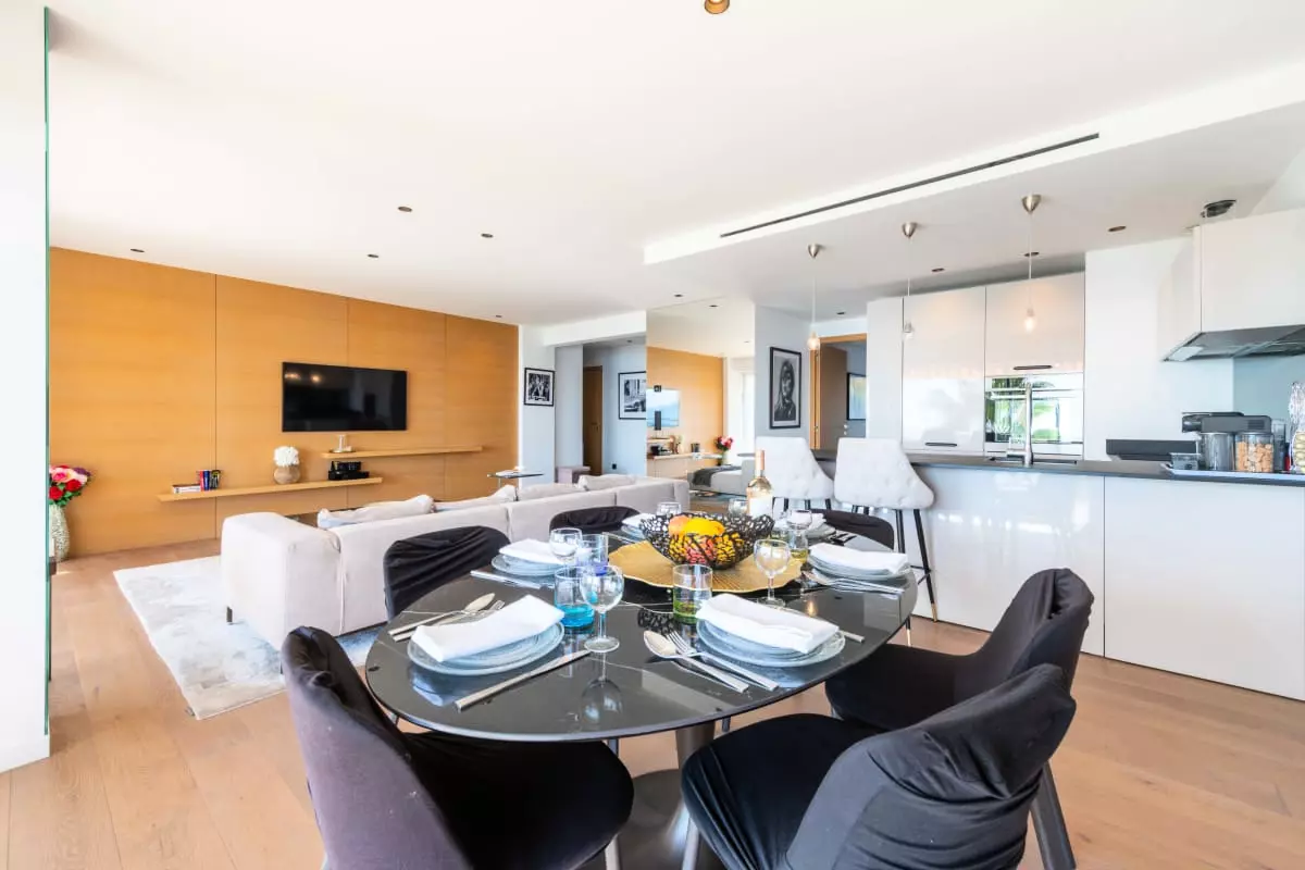 The south-facing living room offers an open space with a fitted kitchen, dining room and lounge area with smart TV and large sofa.