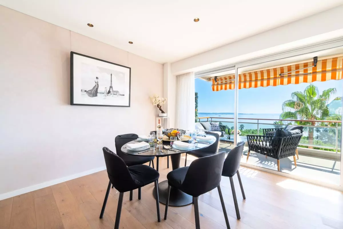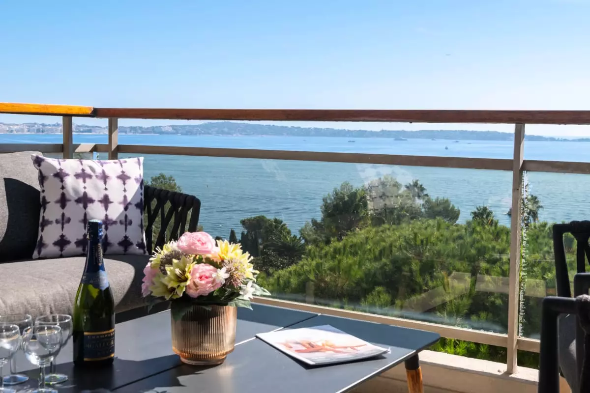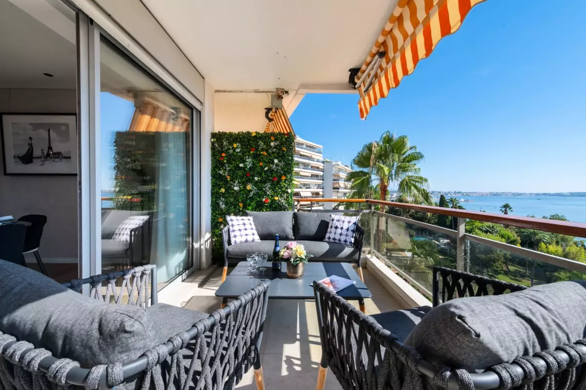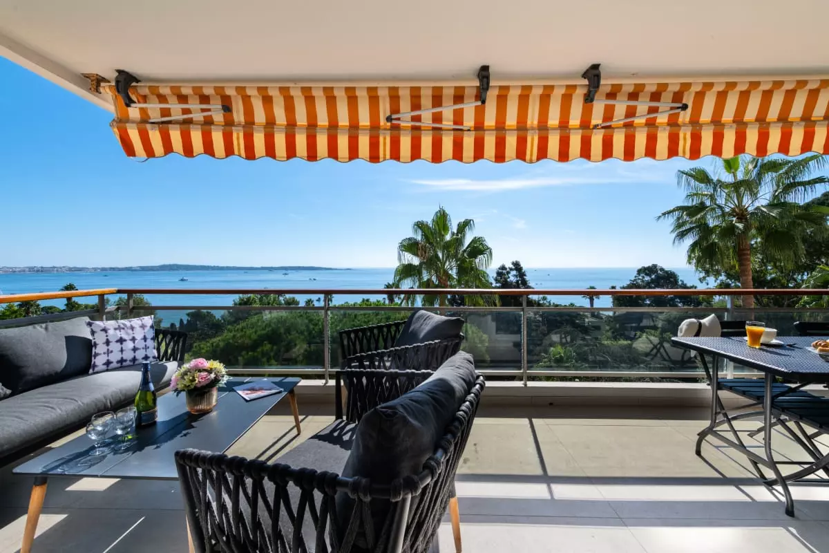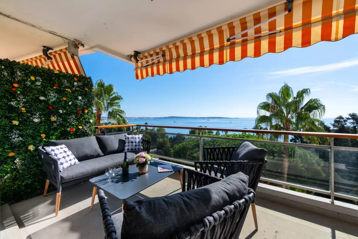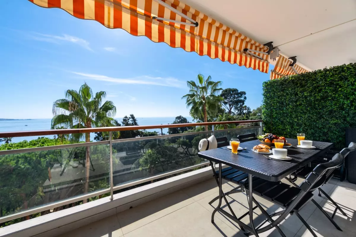 A bright apartment, facing the sea and opening onto the wooded park of a prestigious residence close to the beaches and Cannes, to enjoy the Côte d'Azur in a privileged setting.