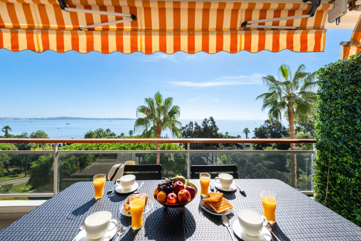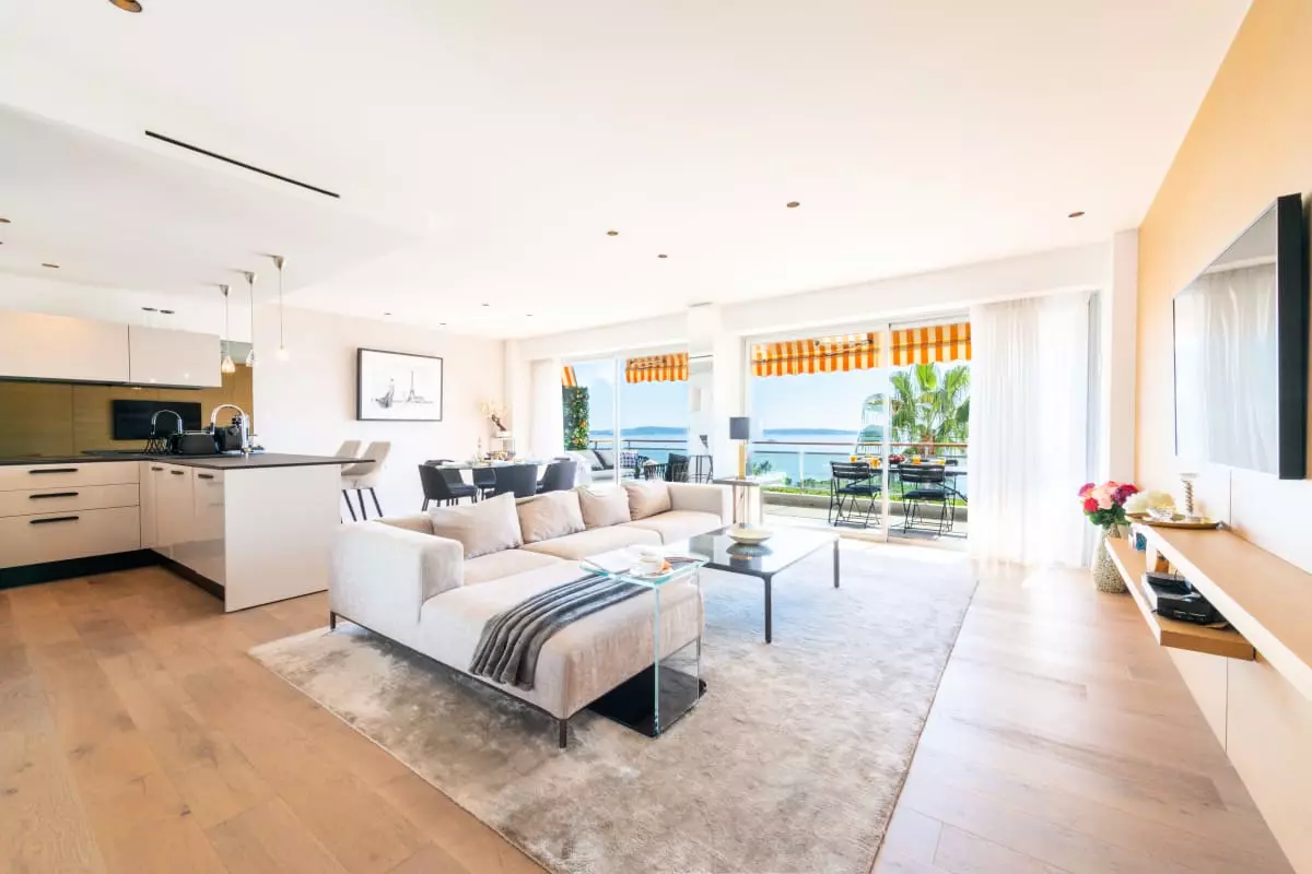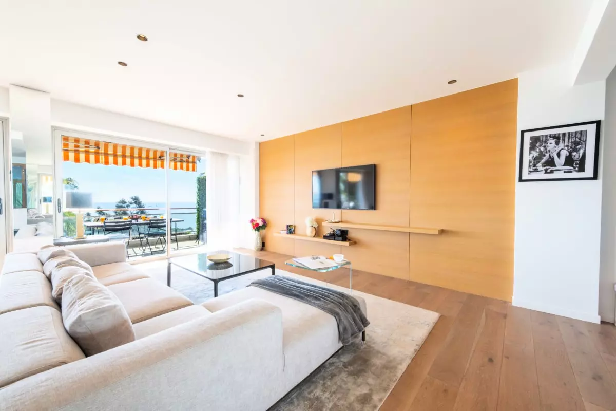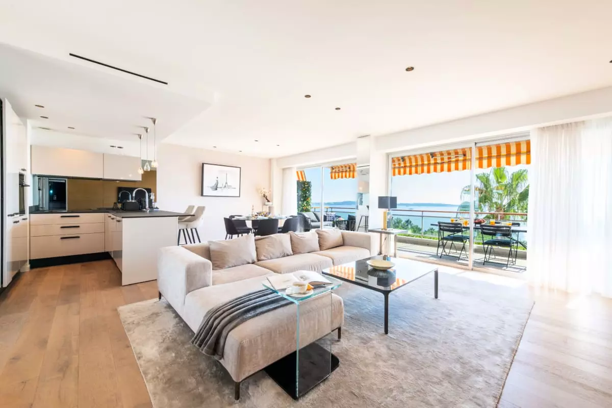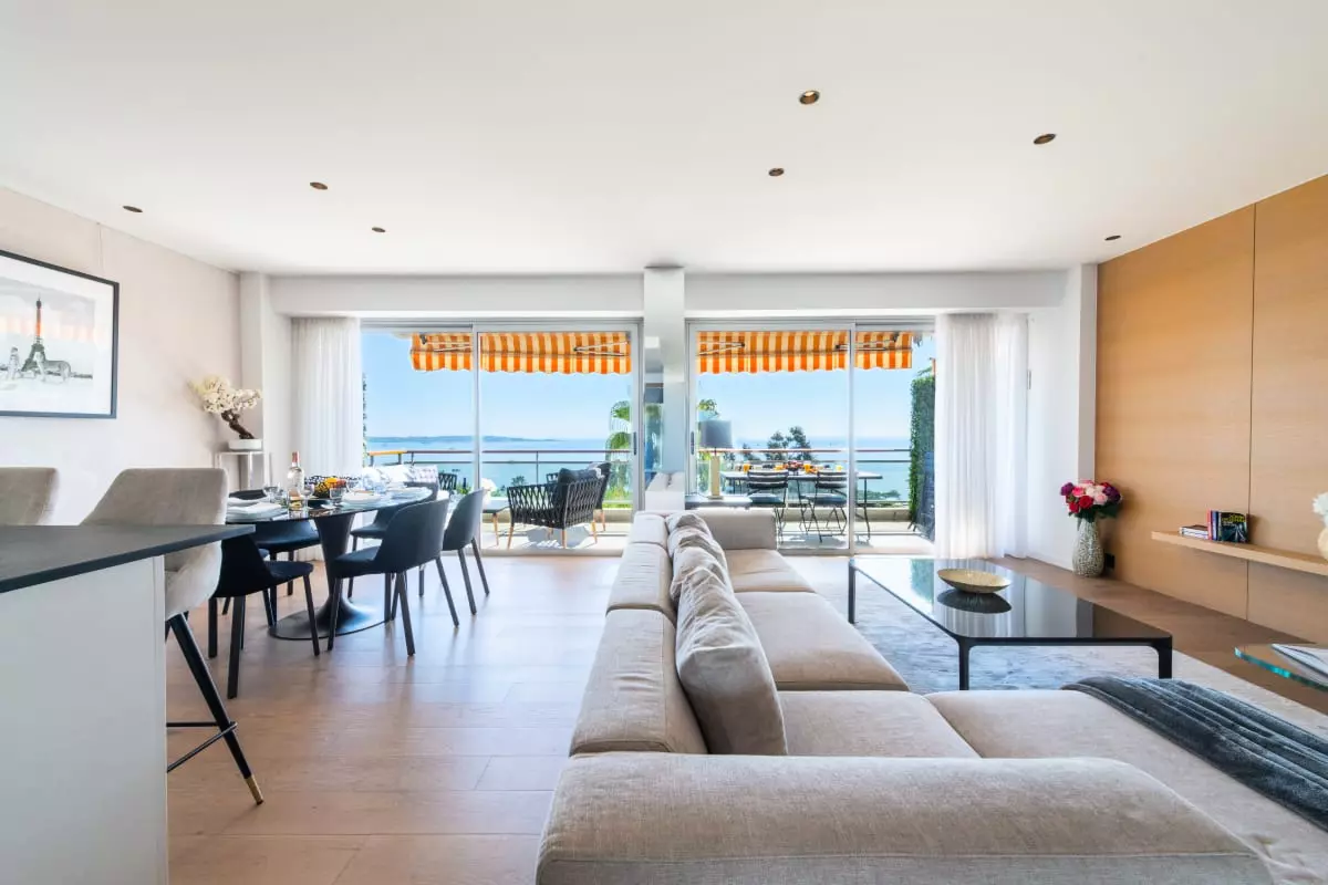 A bright apartment, facing the sea and opening onto the wooded park of a prestigious residence close to the beaches and Cannes, to enjoy the Côte d'Azur in a privileged setting.