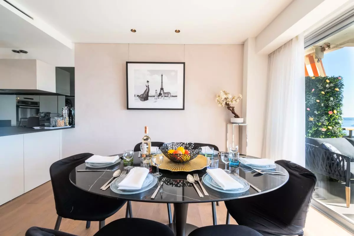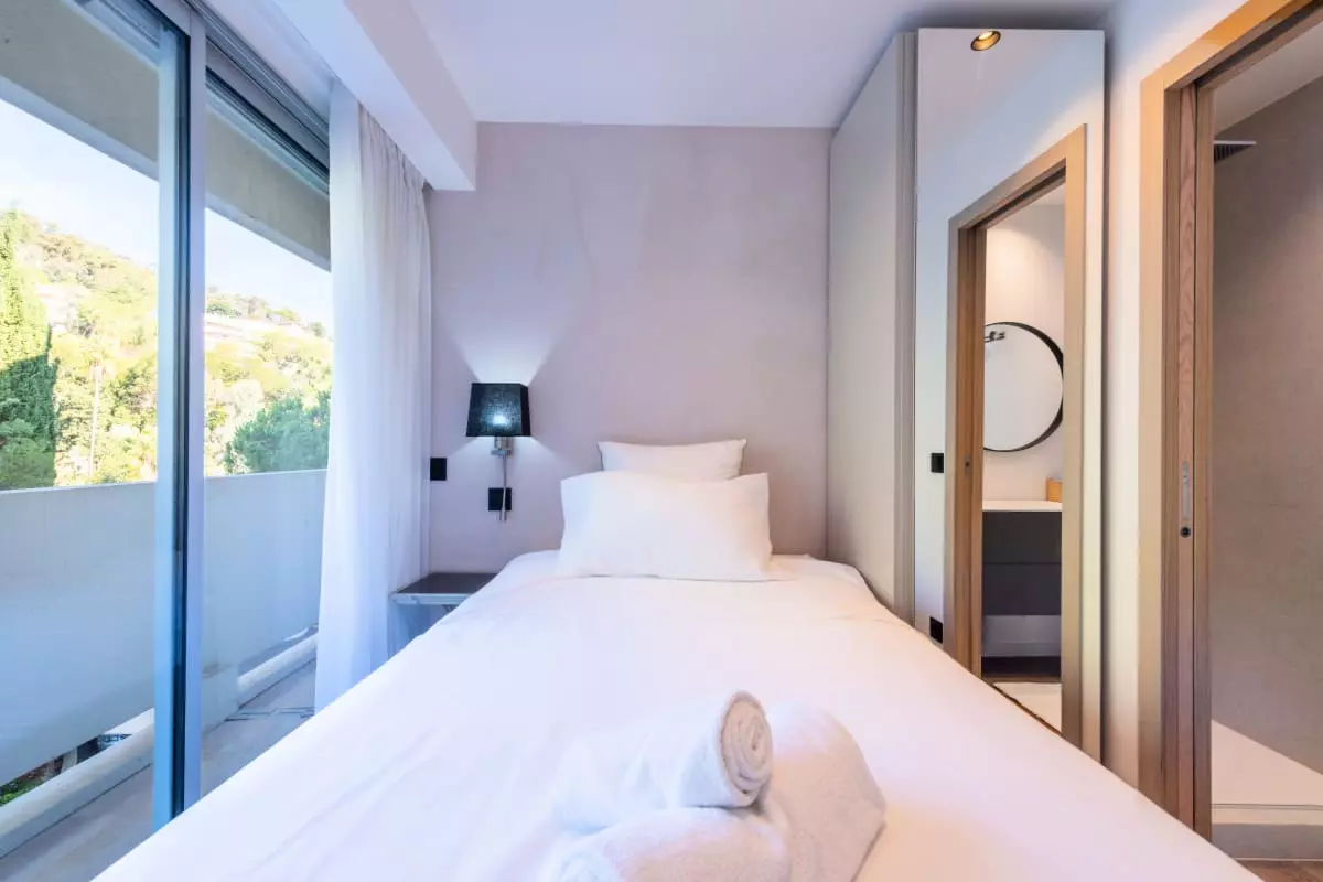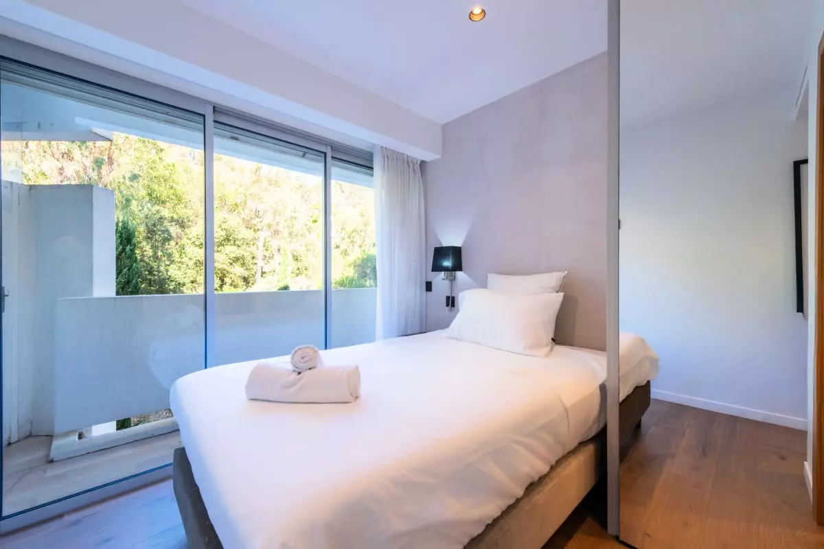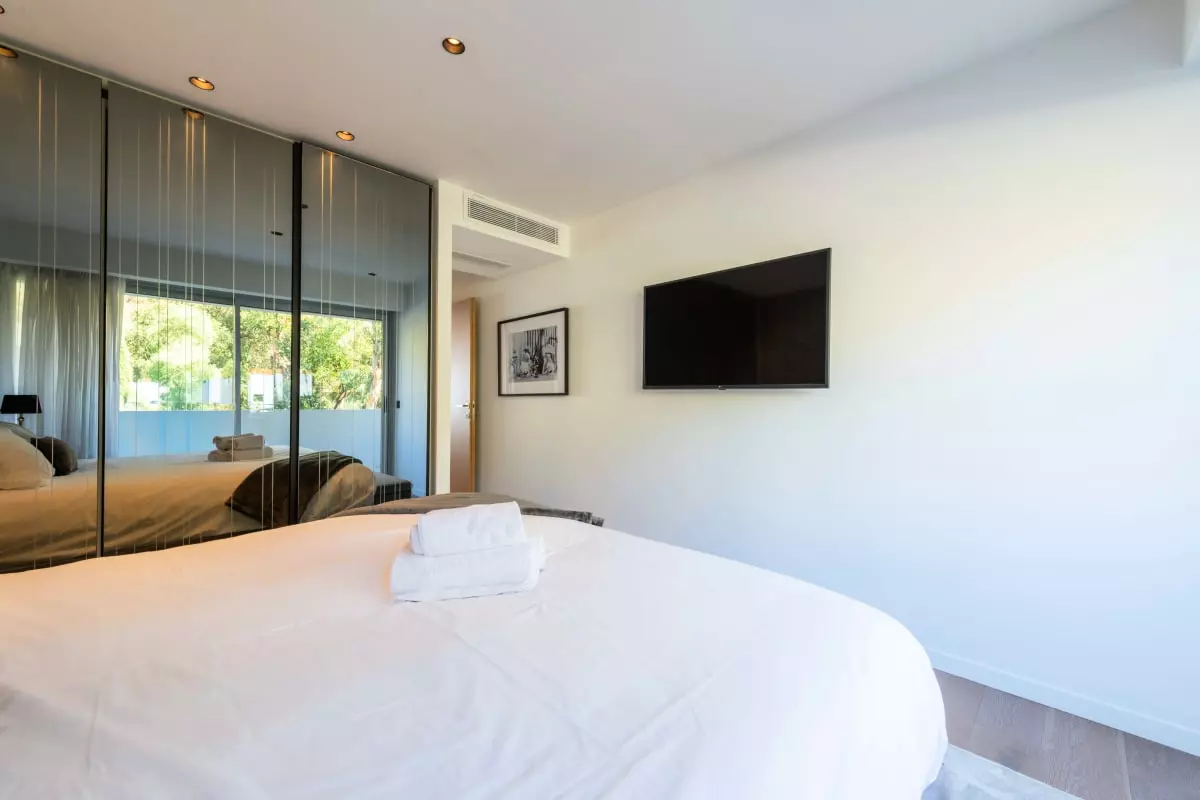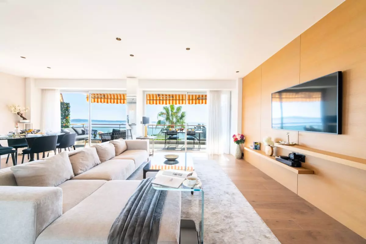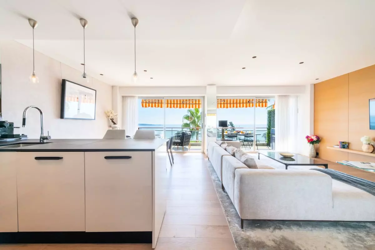 A bright apartment, facing the sea and opening onto the wooded park of a prestigious residence close to the beaches and Cannes, to enjoy the Côte d'Azur in a privileged setting.