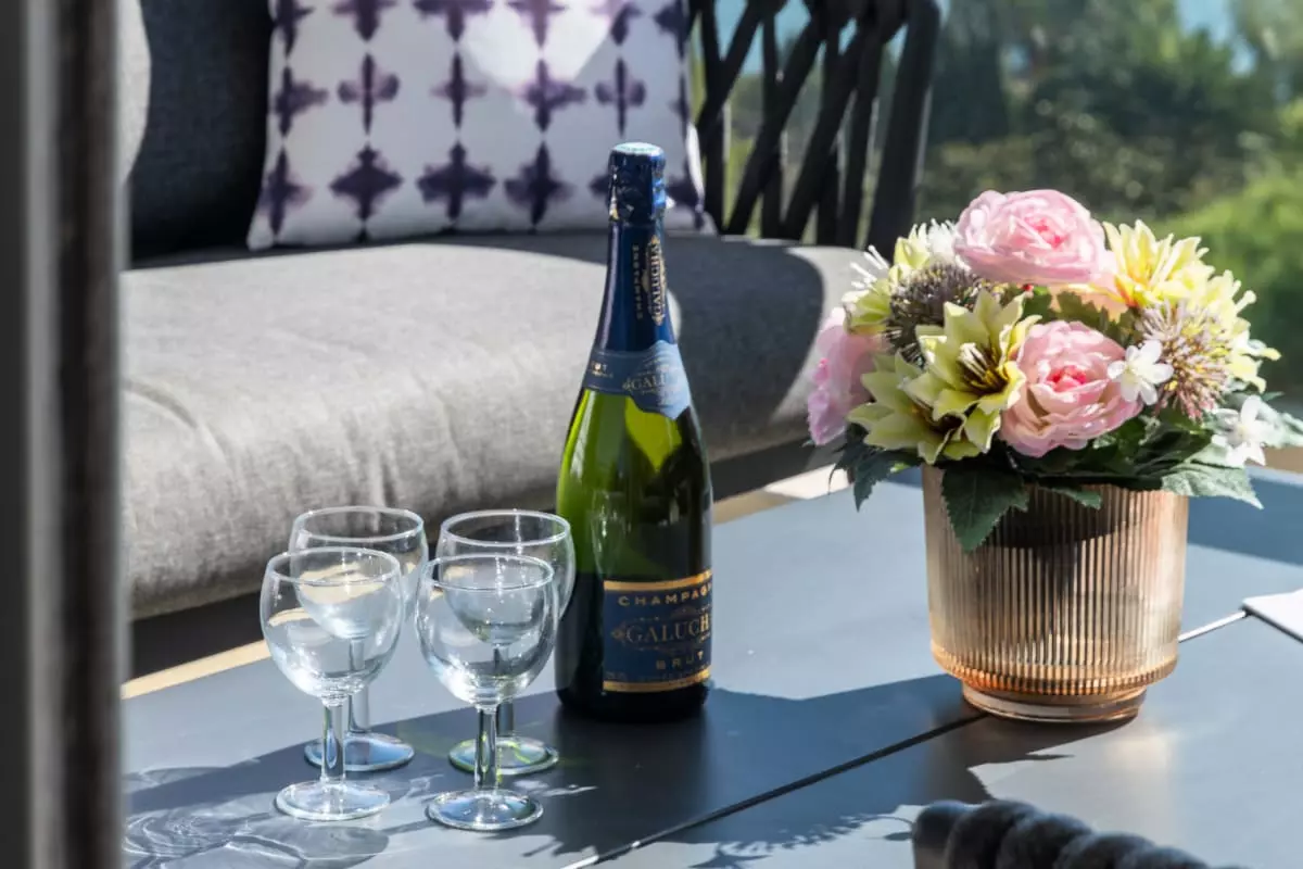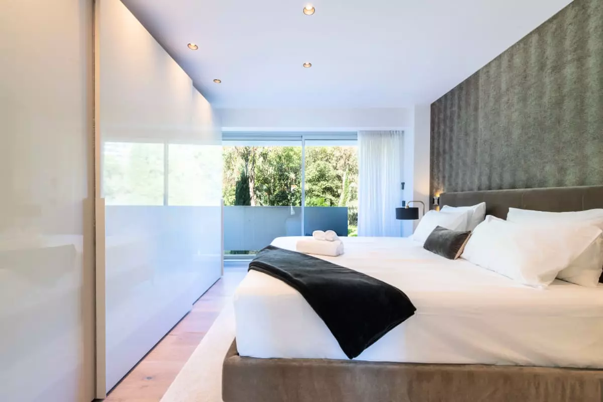 The bay windows extend the space towards the terrace furnished with garden furniture, from where you will enjoy a breathtaking view of the Mediterranean Sea and the residence's park.