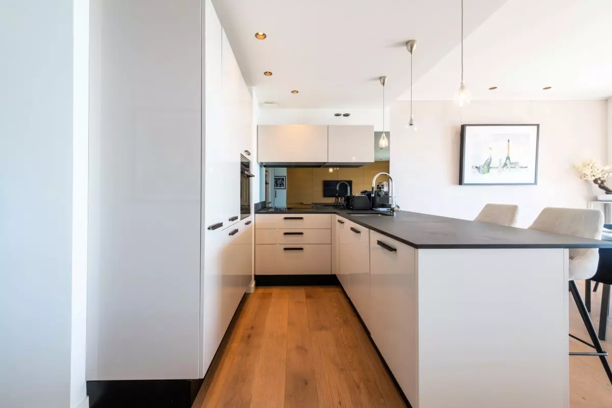 Nestled on the 3rd floor with elevator of a building overlooking the hill, the apartment opens onto an entrance serving all spaces.