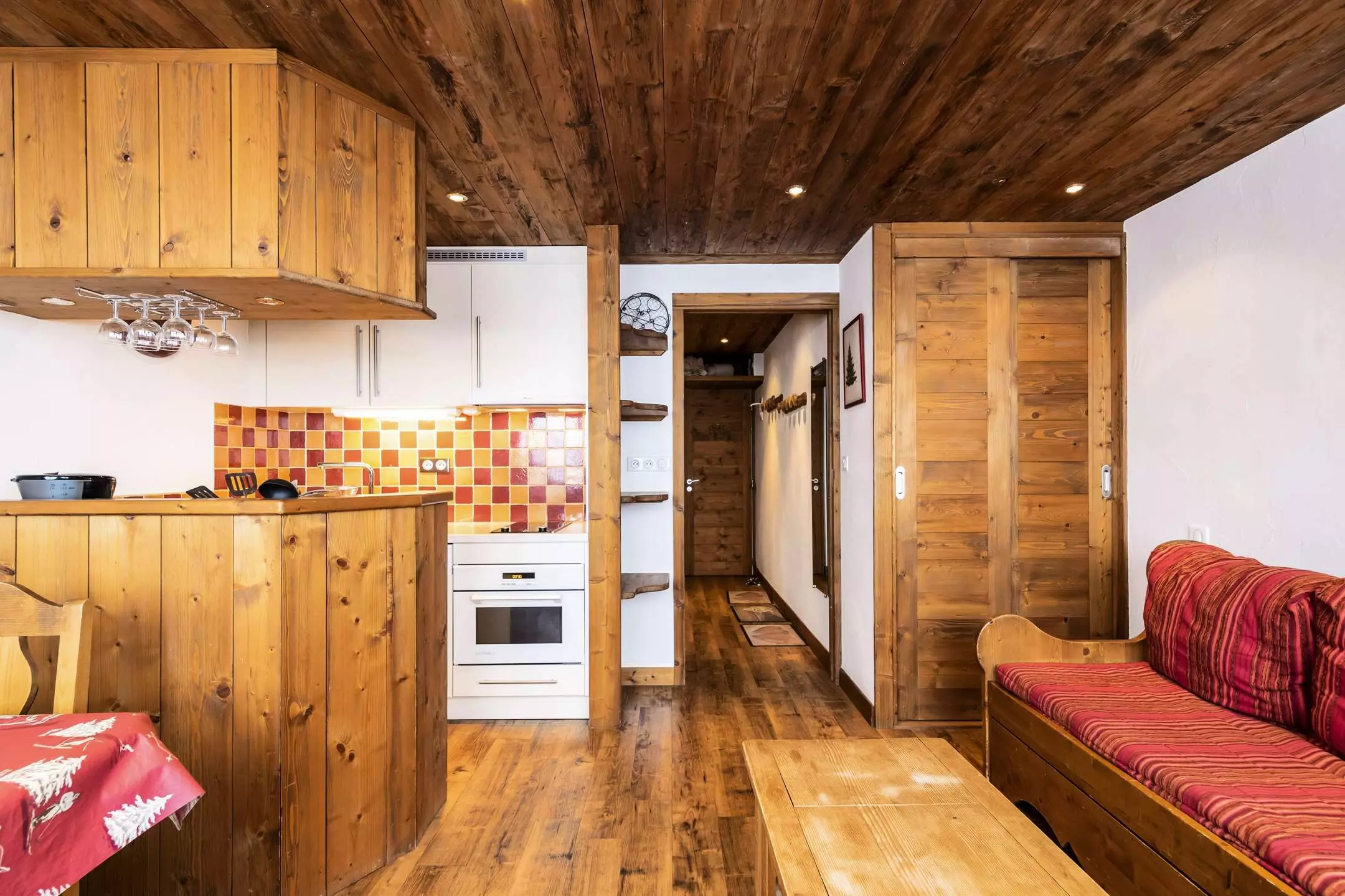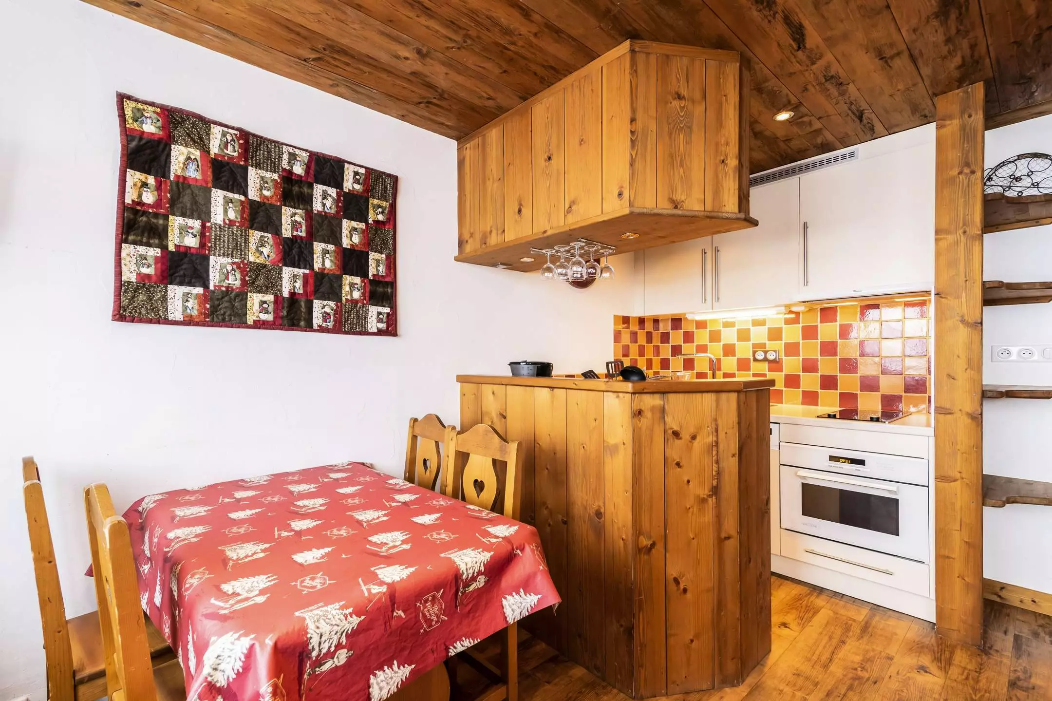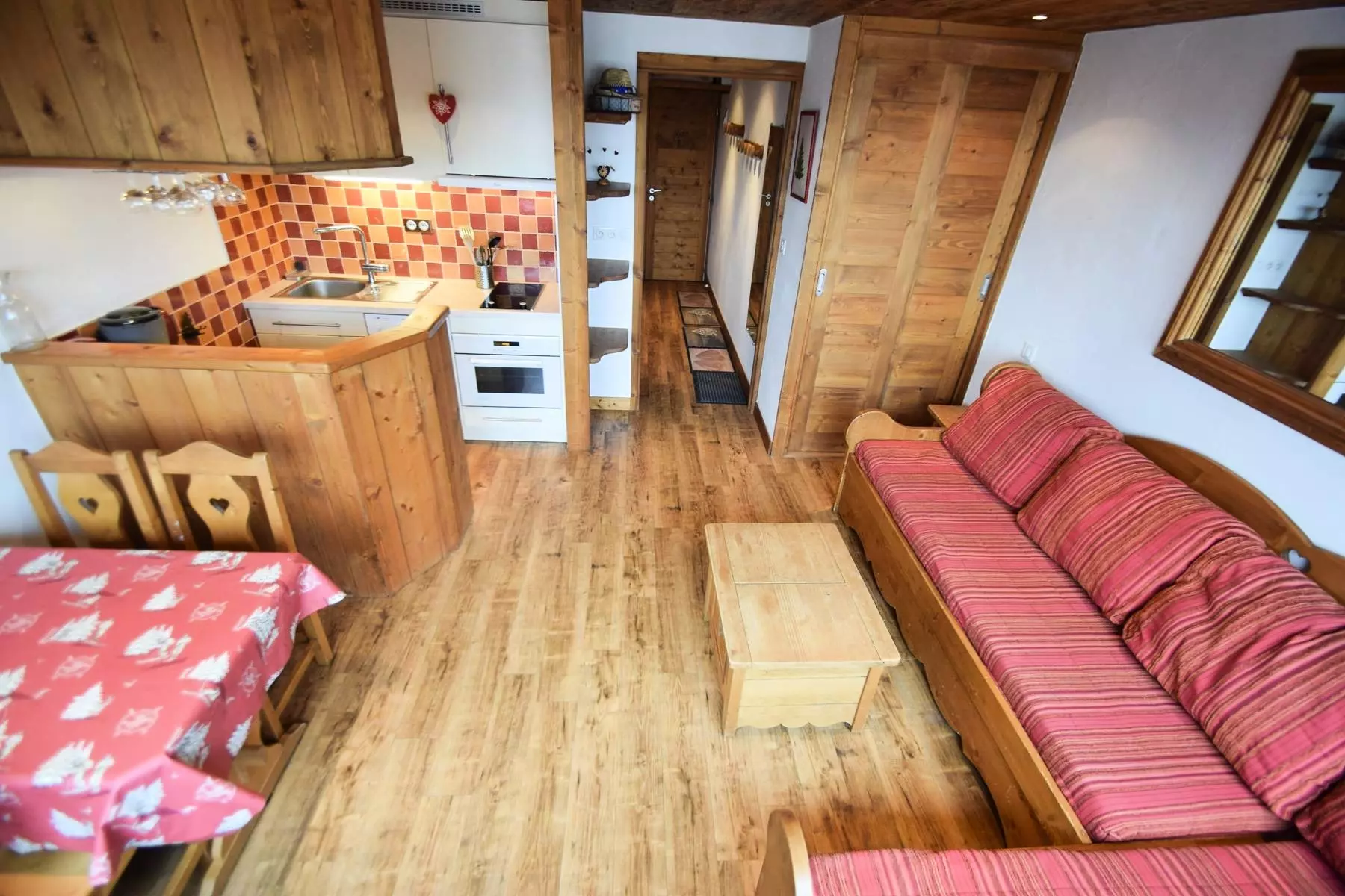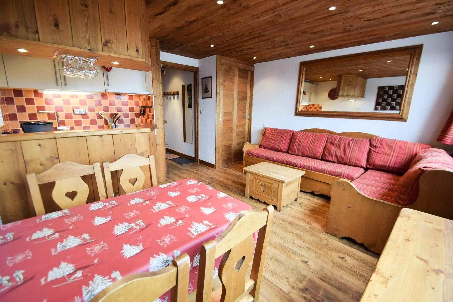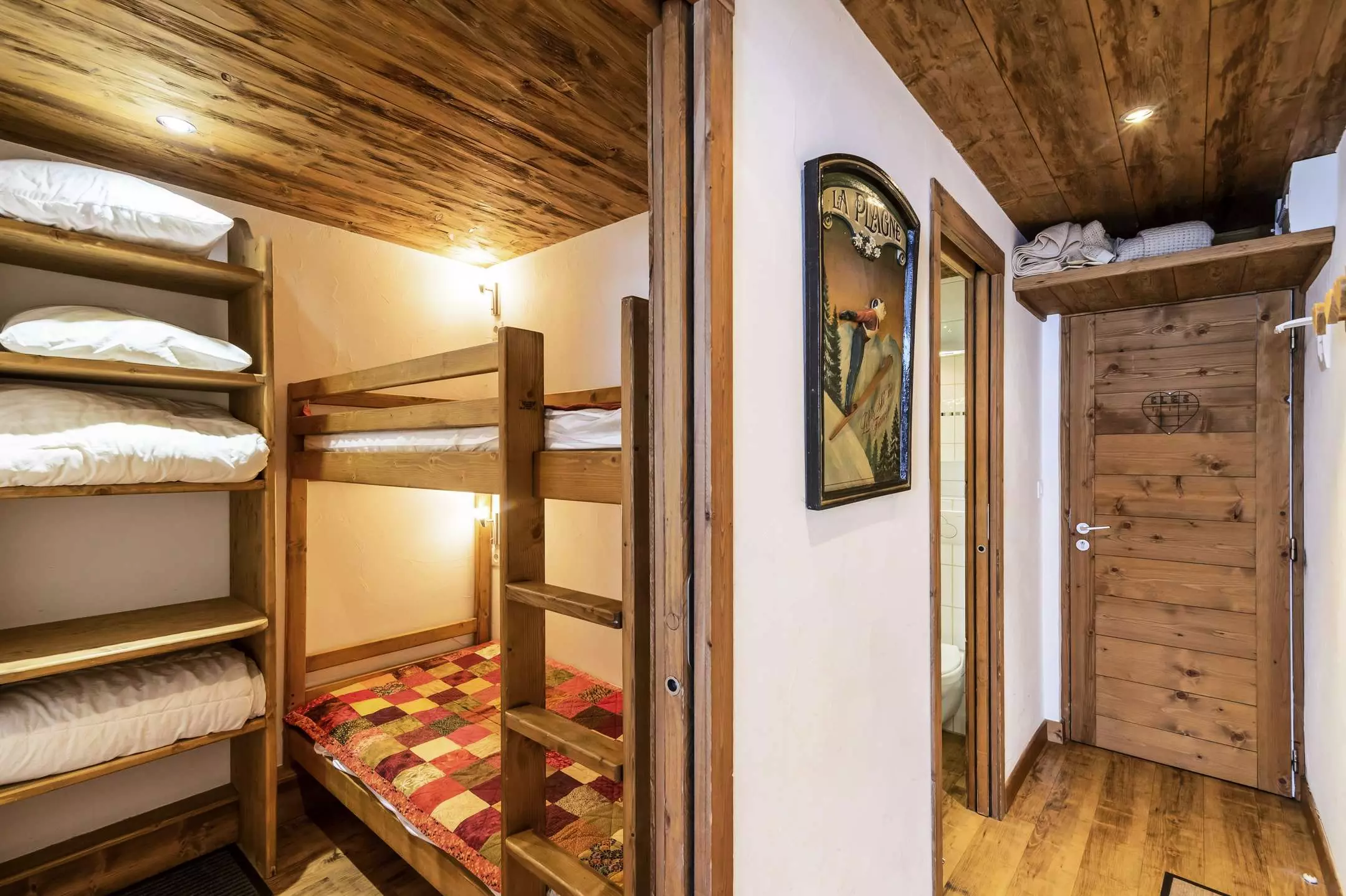 Studio Cabin 3/4 people, 27m2, 1st floor by stairs from the parking lot, North exposure, very beautiful view of Mont-Blanc, without balcony. Direct access to the building from the entrance on the slopes side. Kitchen in living room: 2 electric hobs, refrigerator, multi-function oven, dishwasher - Living room: dining area, 2 pull-out beds, TV - Cabin area (without window) closed by sliding door: 2 bunk beds. Bathroom with shower and WC included. Bedding: duvets - Ski locker n° R12 at the slopes exit level. Non-smoking apartment, pets not allowed. Optional and extra: End of stay cleaning, sheets, towels, ski passes.