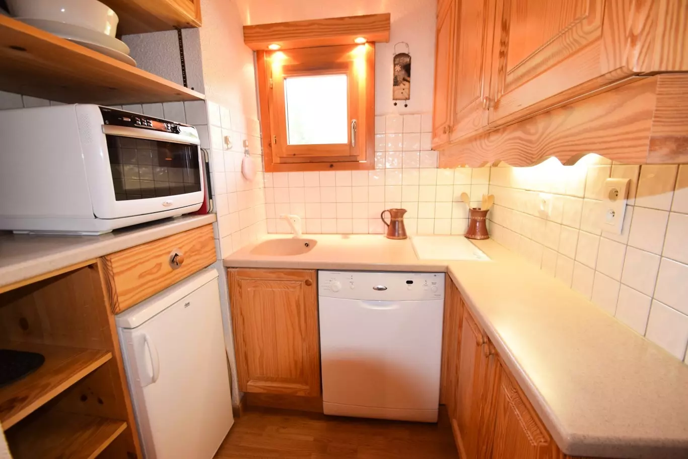 2-room apartment, divisible, sleeps 6, 42m2, east and south/west facing with 2 balconies, view of the slopes, 2nd floor with elevator - Separate kitchen: 2 ceramic hobs, refrigerator, combined oven, dishwasher - Living room: dining area, 2 single pull-out beds, TV - Divisible part: 2 pull-out beds - Bedroom: 2 single beds (possibility of bringing them together to form 1 double bed) - Bathroom: bathtub, separate WC - Bedding: blankets - End of stay cleaning, sheets and towels and optional ski passes. Ski locker: No. 206 on the ground floor - Bright apartment ideally located.