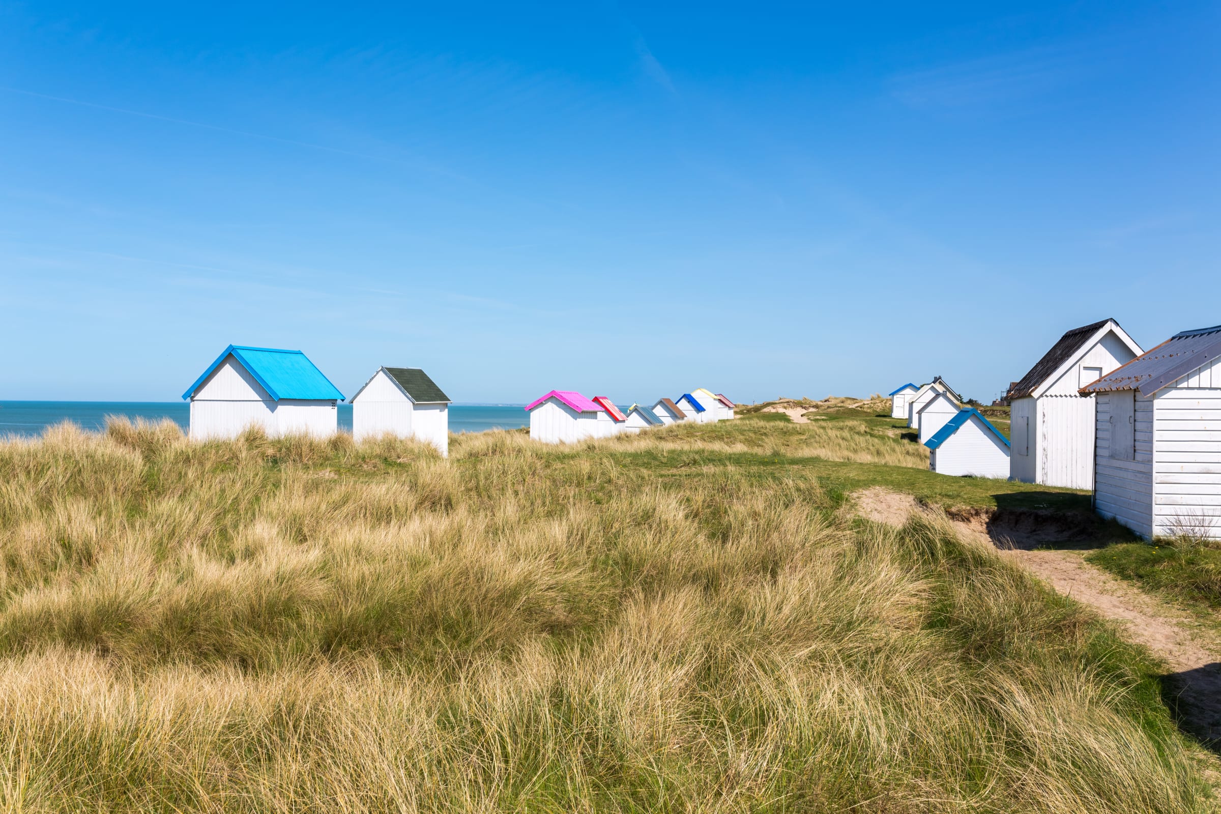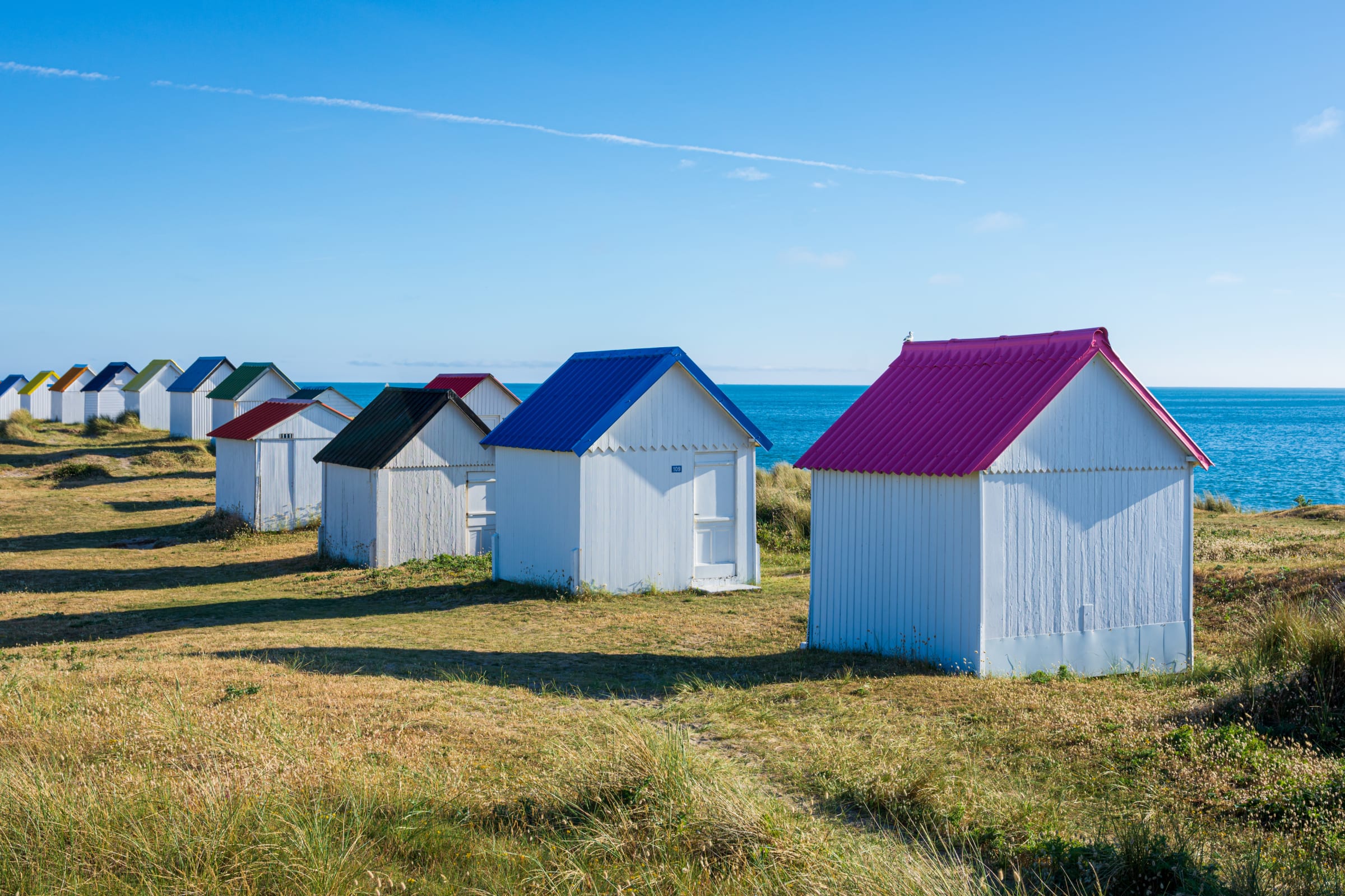 Gouville is best known for its wild beaches lined with natural dunes, but above all for its famous beach huts with colourful roofs, which have become emblematic of the coastline. These small huts, once used as changing rooms away from prying eyes, now form a picturesque scene that attracts photographers and lovers of unusual landscapes.
