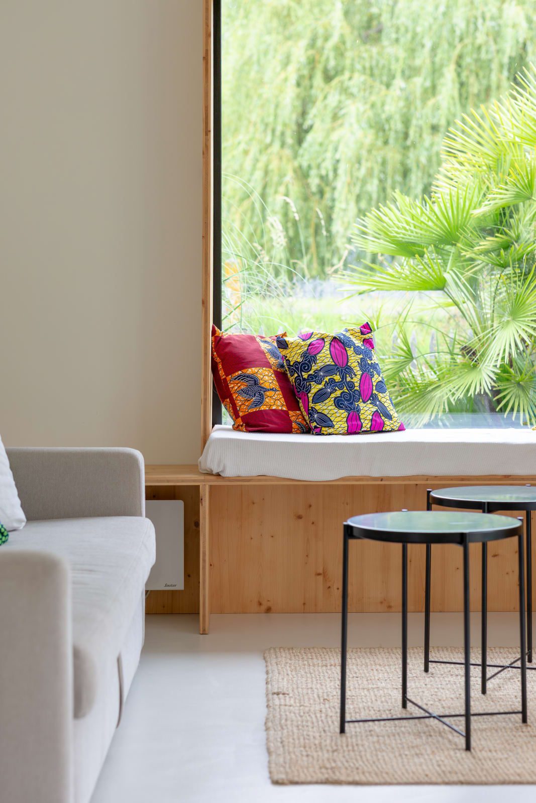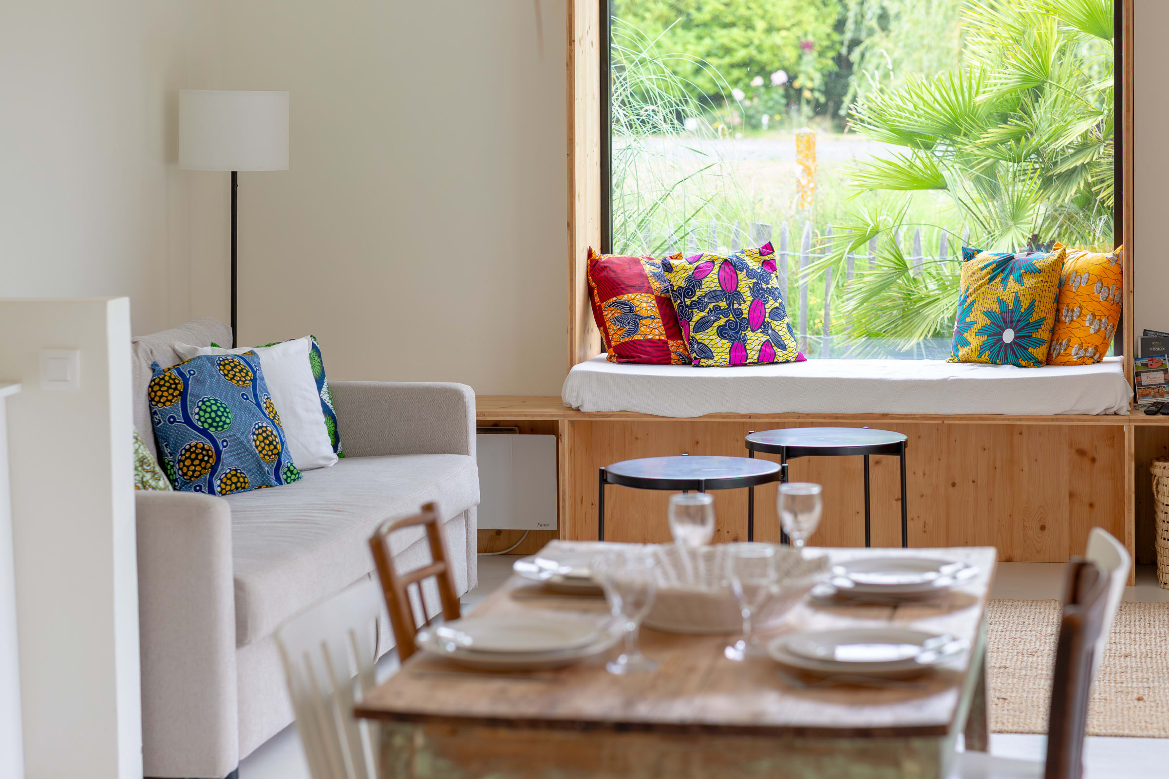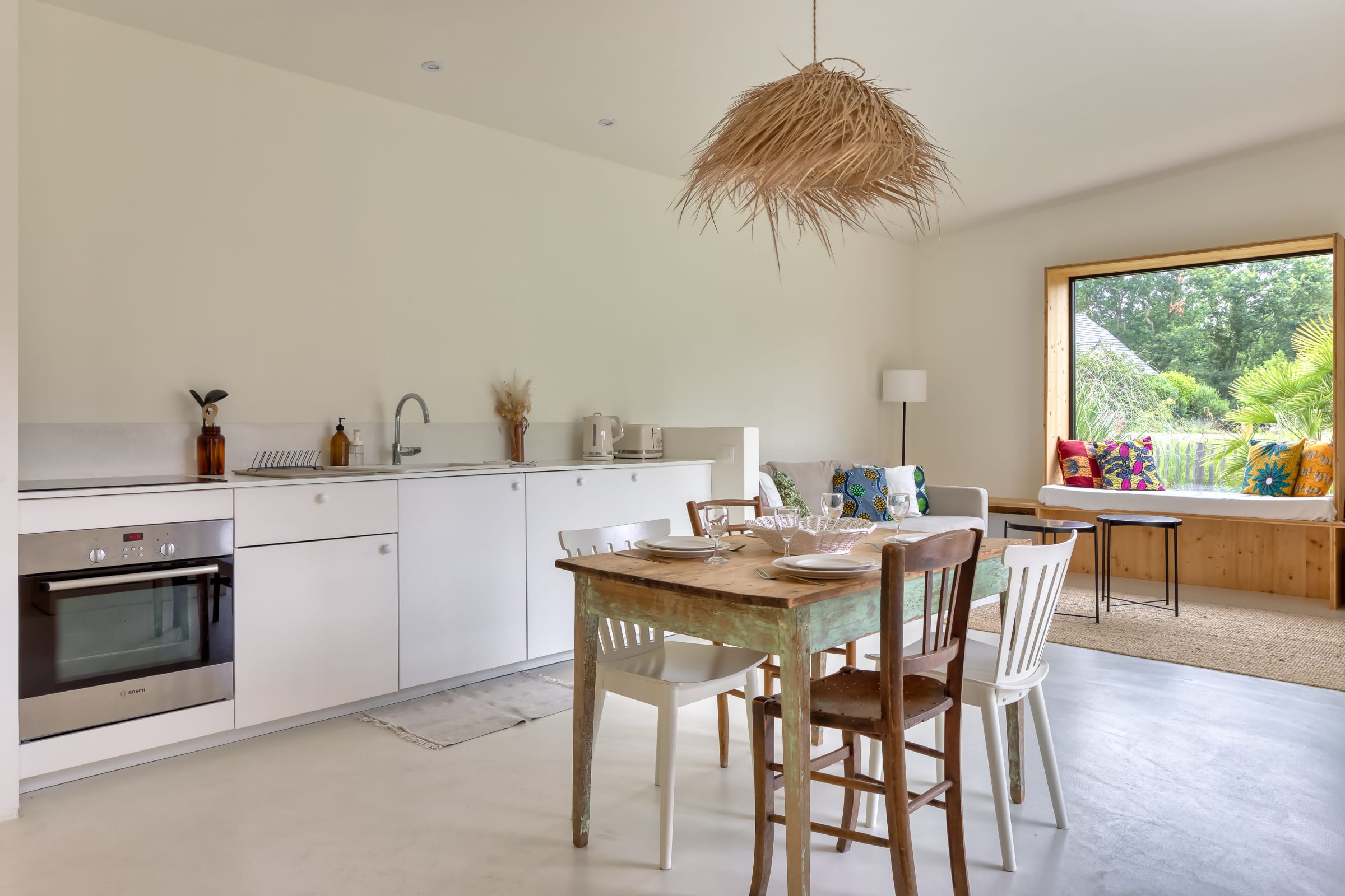 The bright living room, which opens onto the terrace, has a TV with Netflix, east, south and west facing windows, and a charming fixed bench seat facing west, perfect for reading or admiring the countryside.