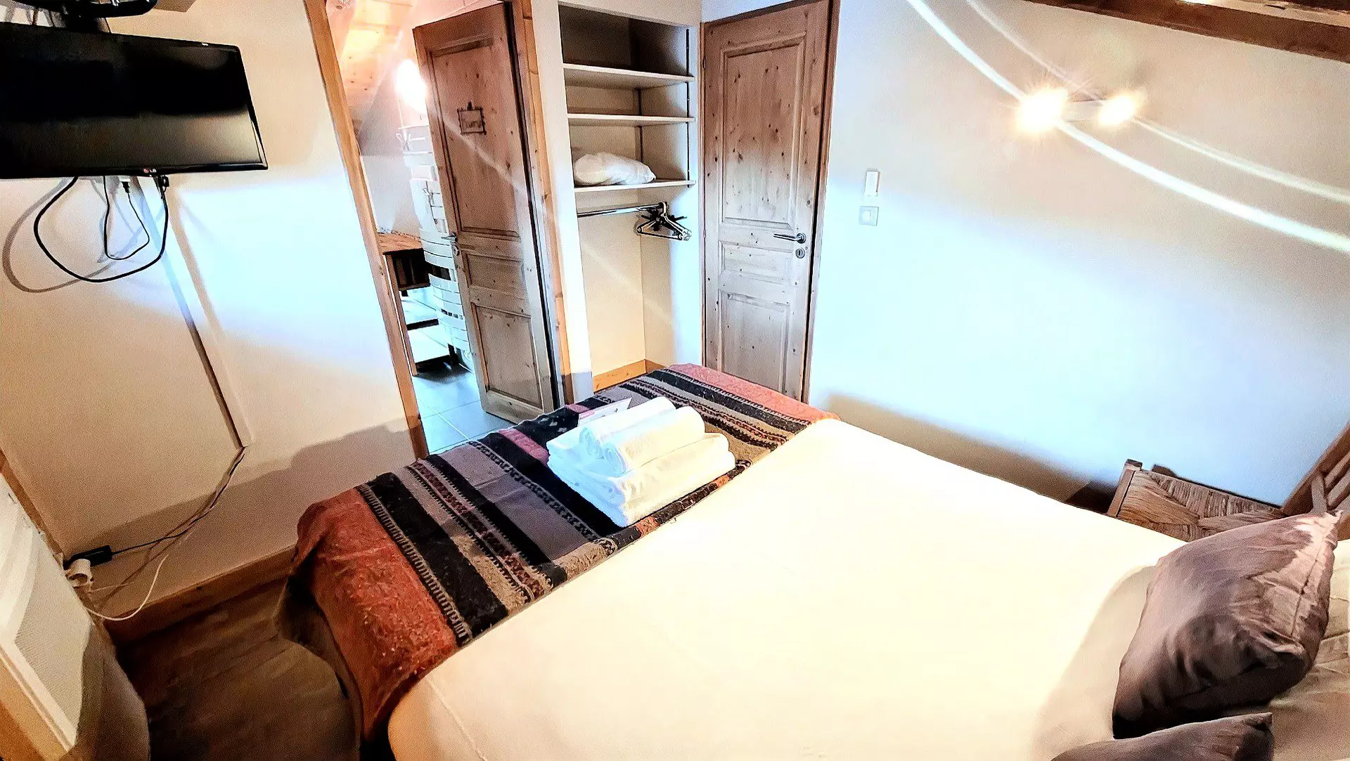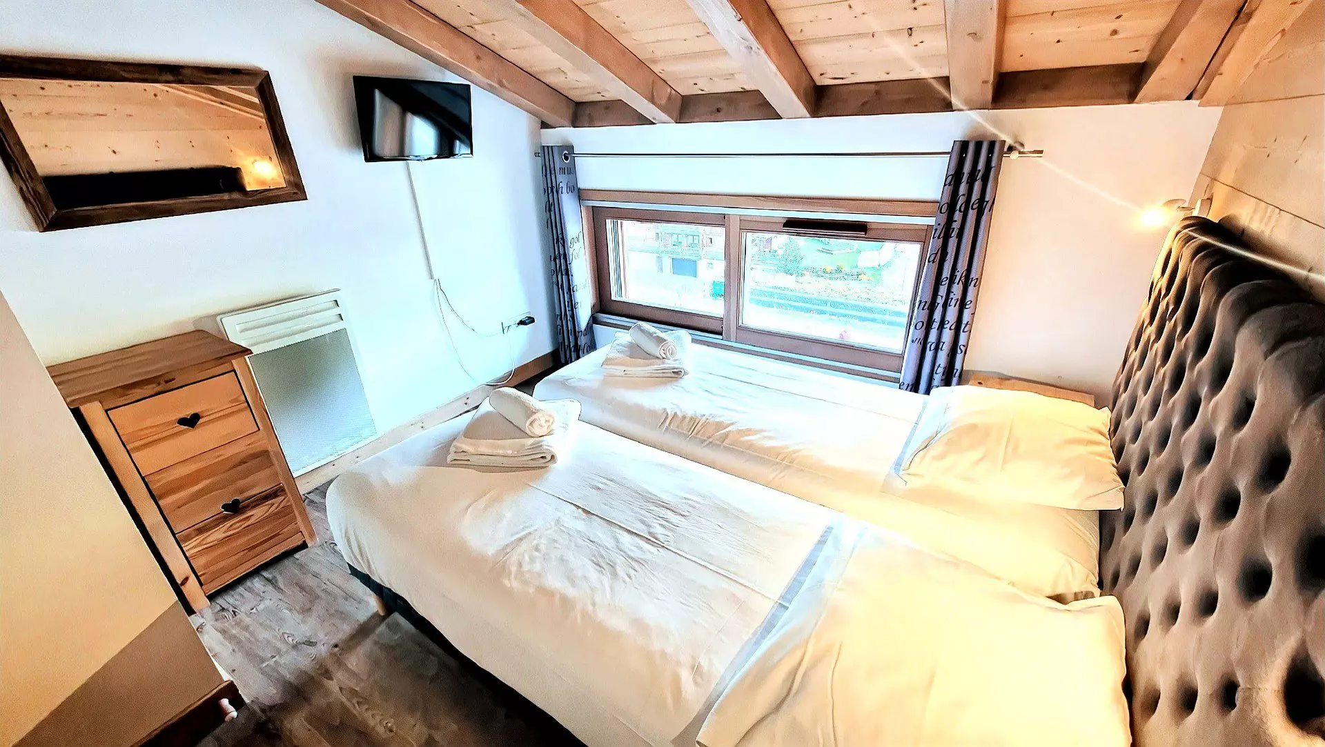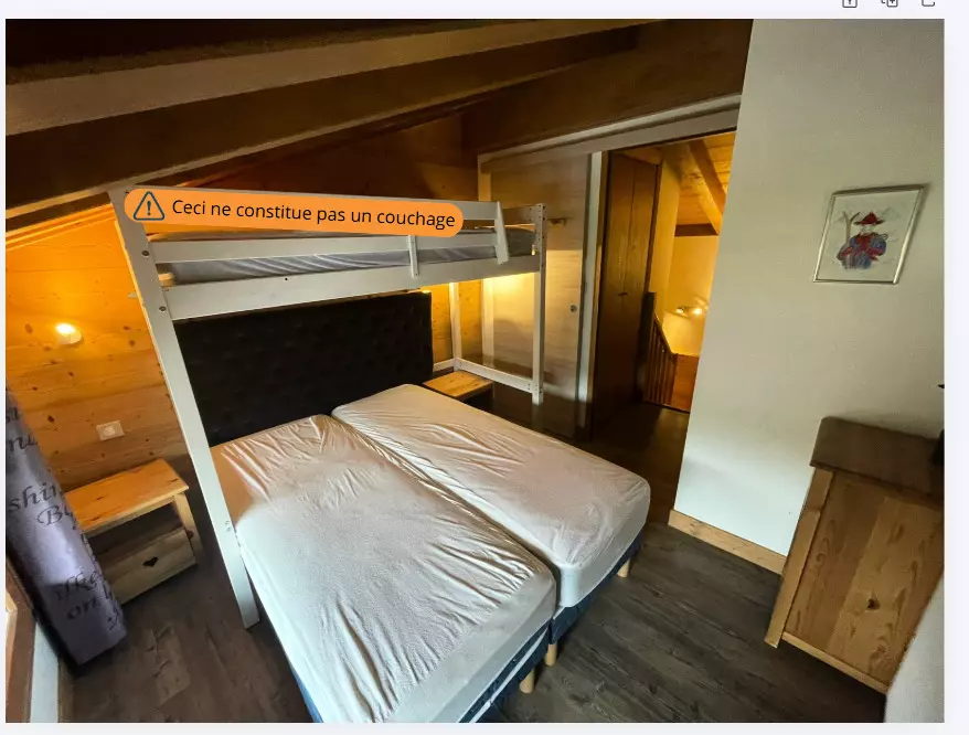 - 1 double bedroom with 2 beds of 70cm x 190cm which can form a bed of 140 x 190 cm, TV, storage. (please note, installation of a bunk bed in width above the single beds which does not count as sleeping accommodation)