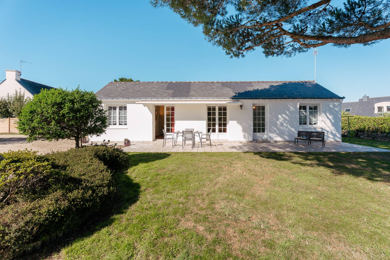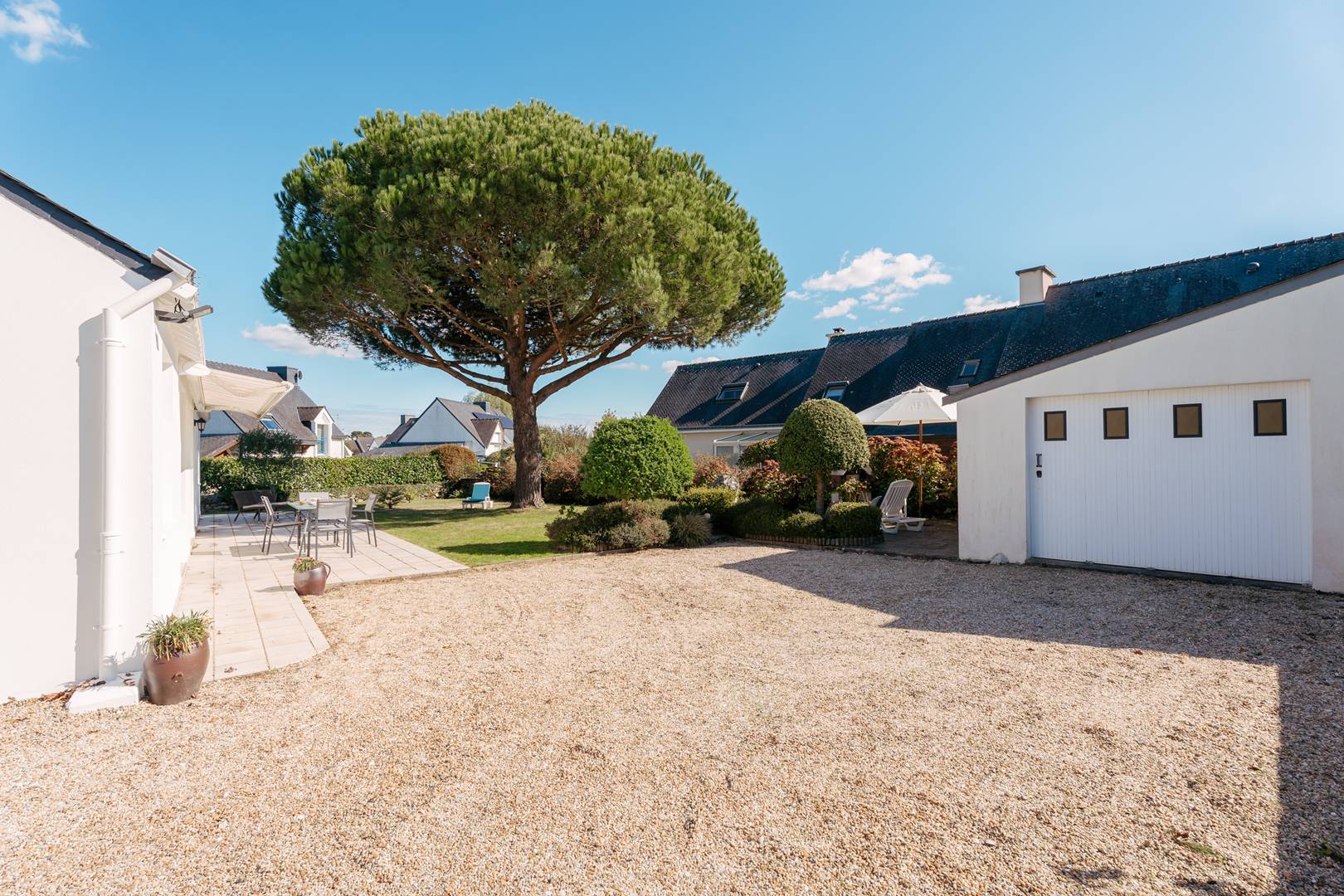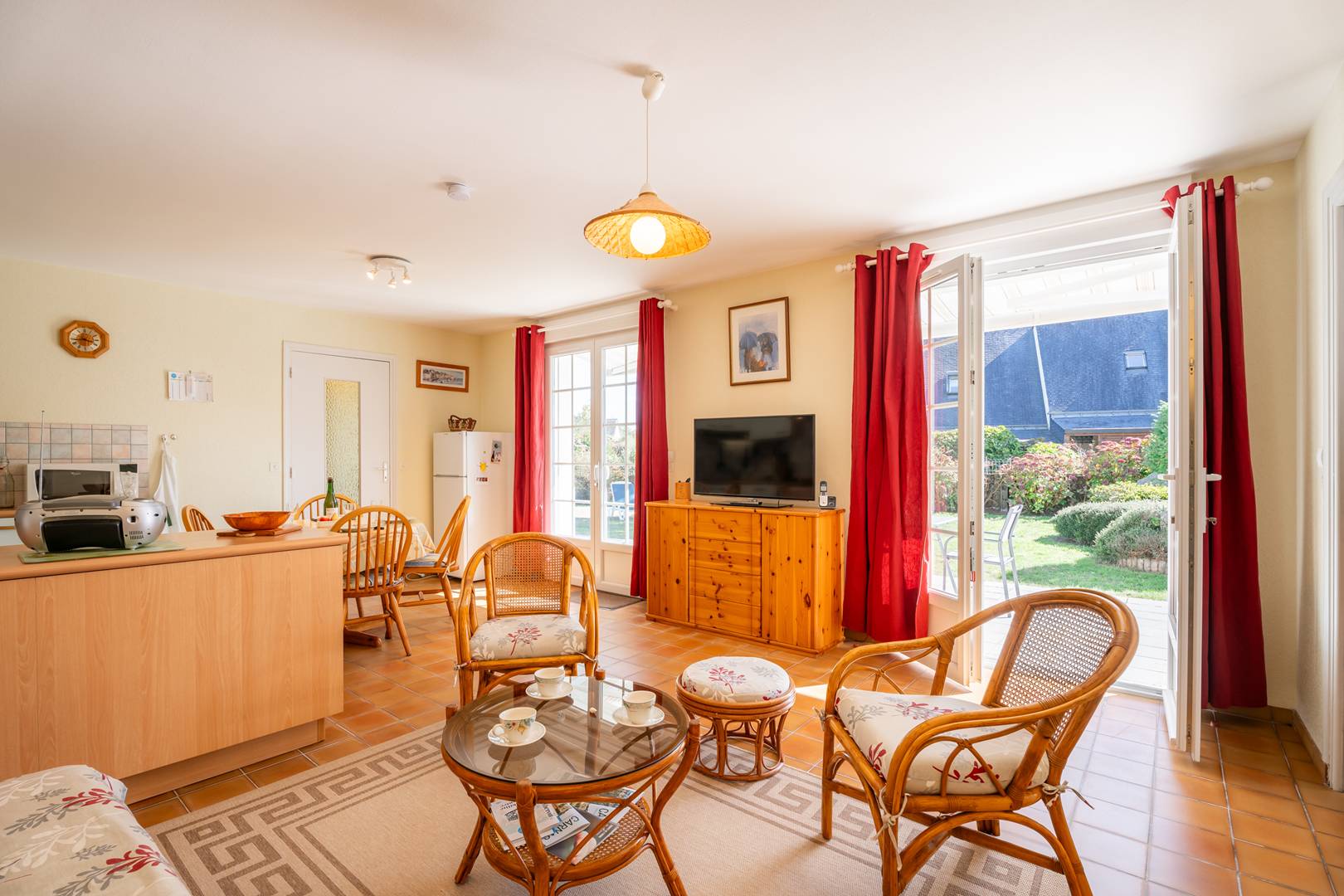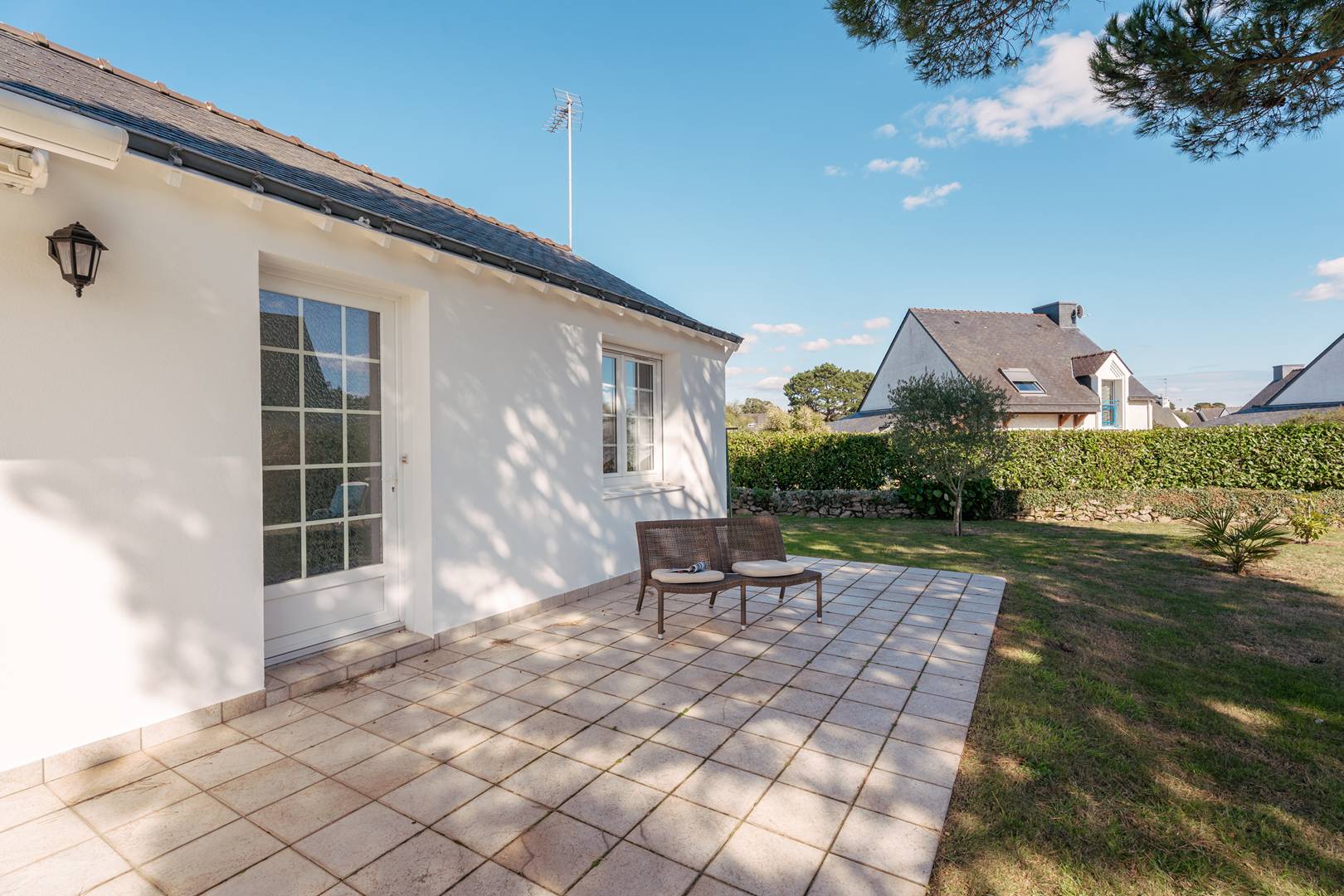 - Living room with lounge area (sofa, armchairs, TV), opening onto a south-facing terrace (garden furniture), extended by a private enclosed garden