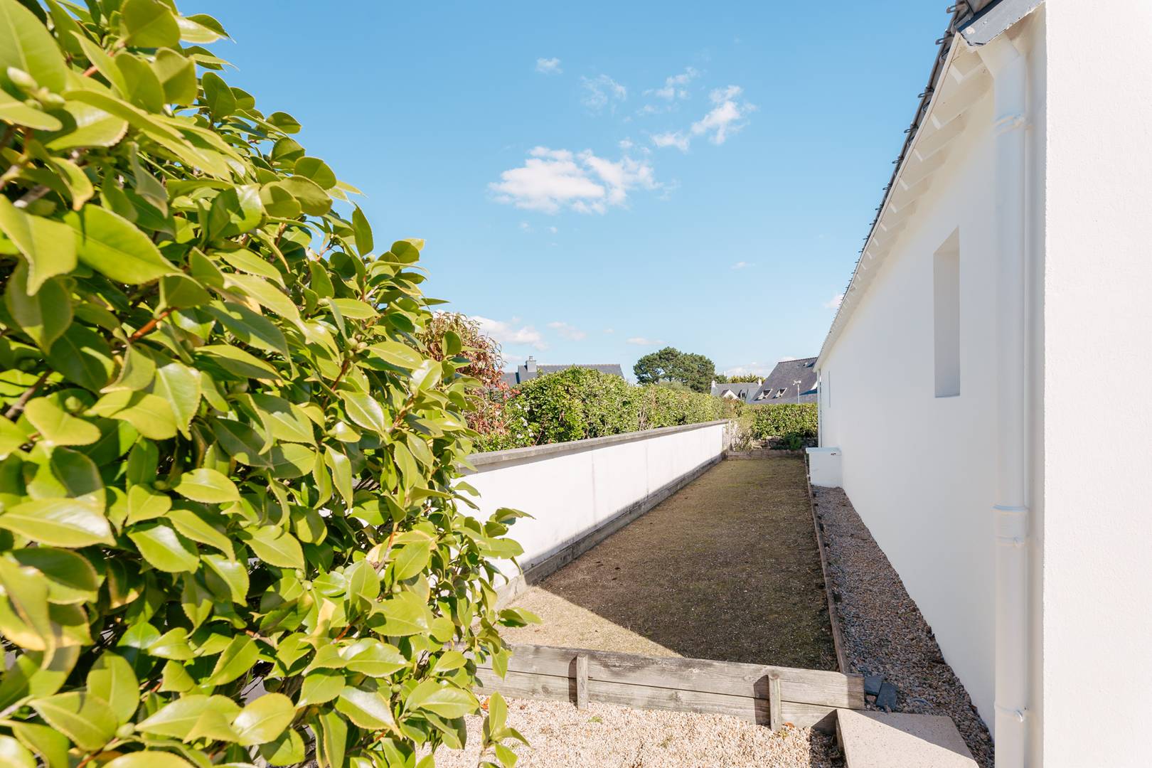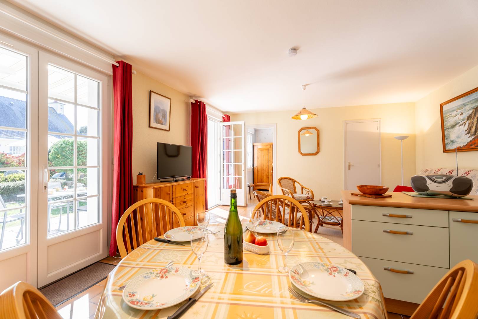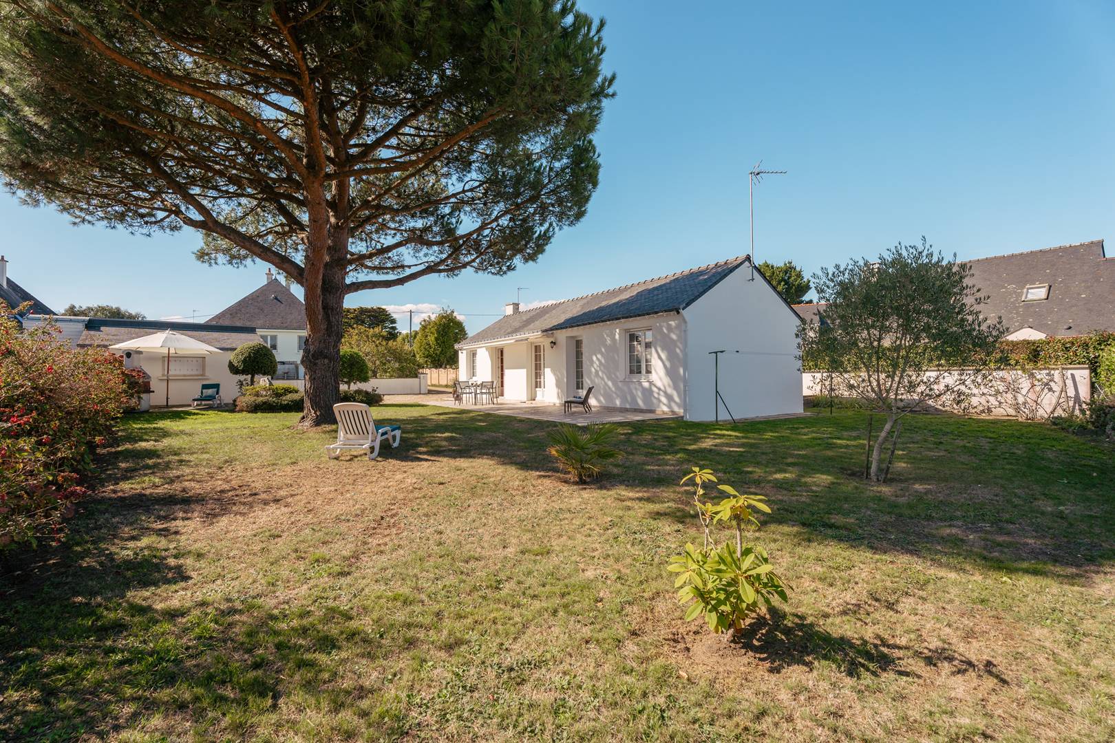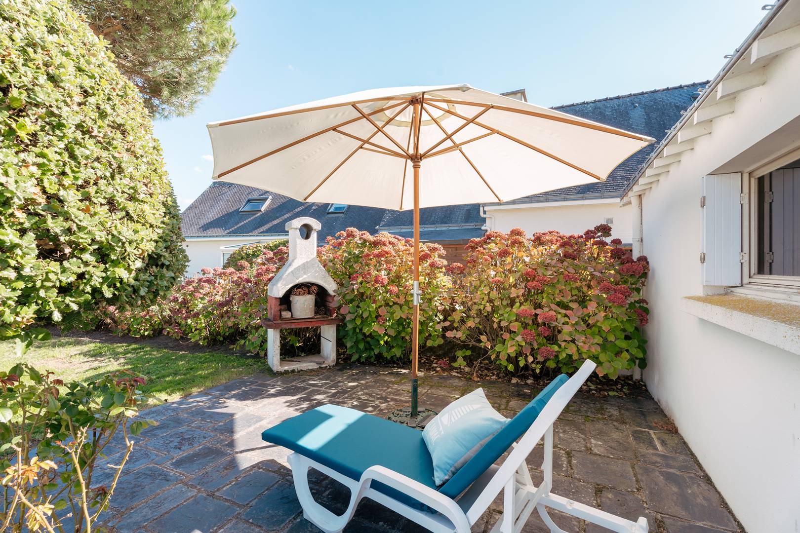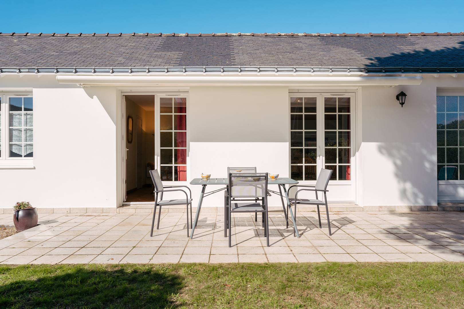- Living room with lounge area (sofa, armchairs, TV), opening onto a south-facing terrace (garden furniture), extended by a private enclosed garden