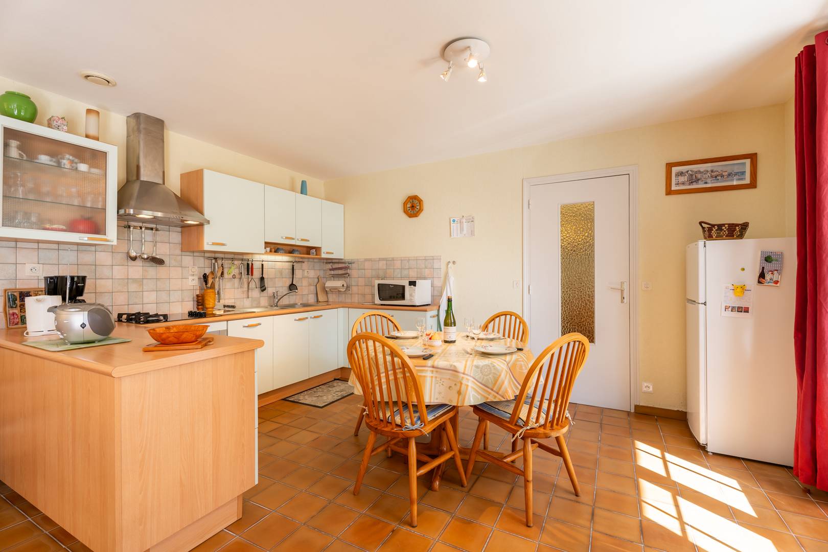 - Open-plan kitchen with dining area (table, chairs, mixed hob: 2-ring gas + 2-ring ceramic, microwave, oven, dishwasher, fridge/freezer) opening onto the terrace