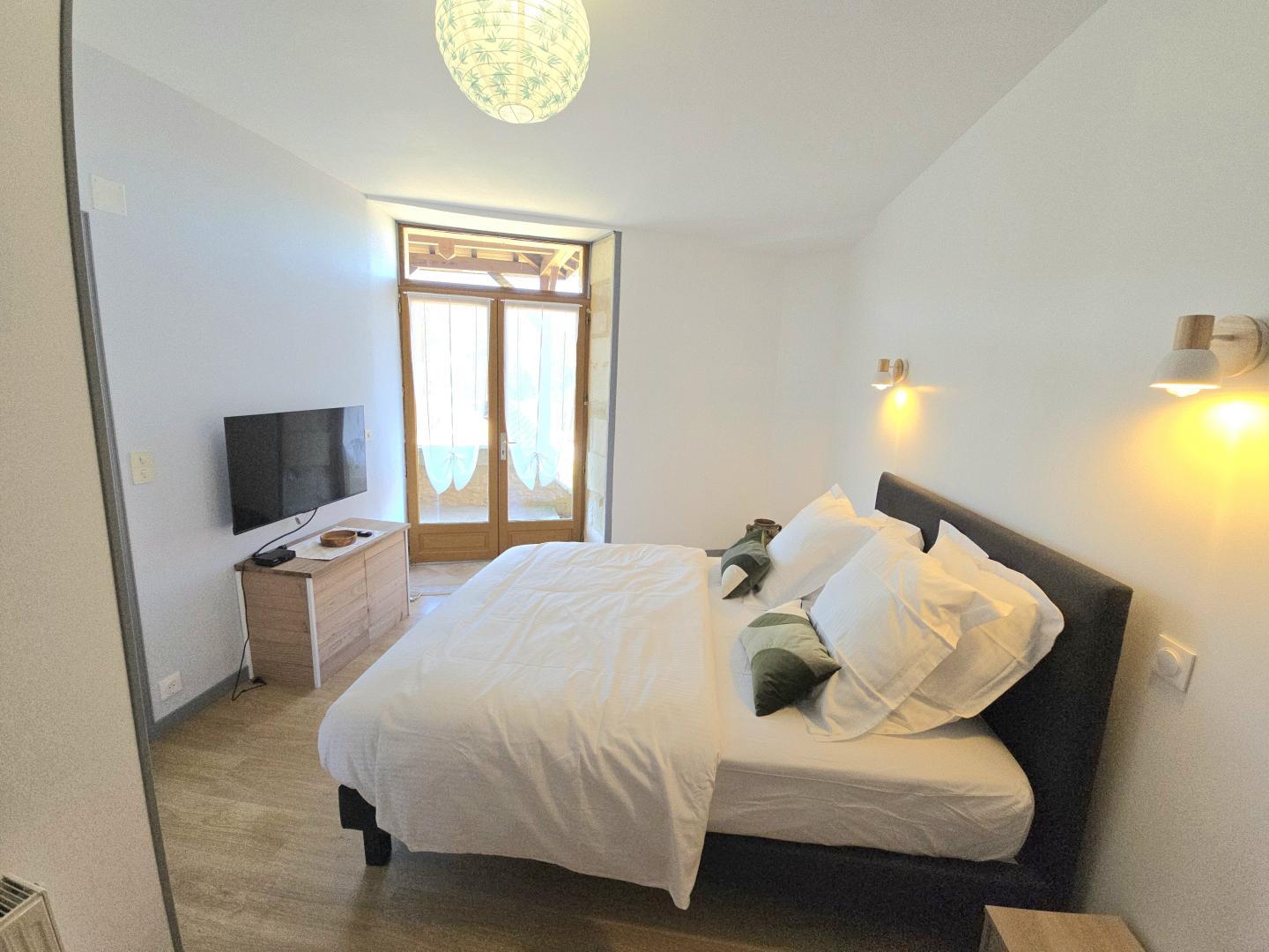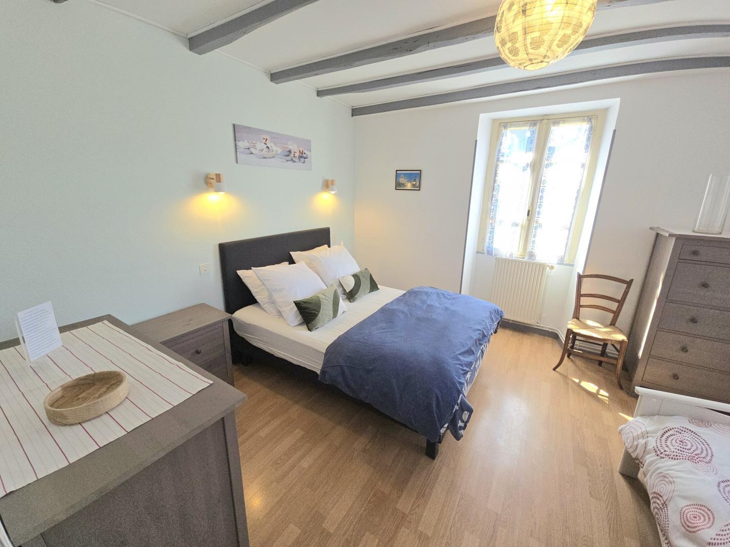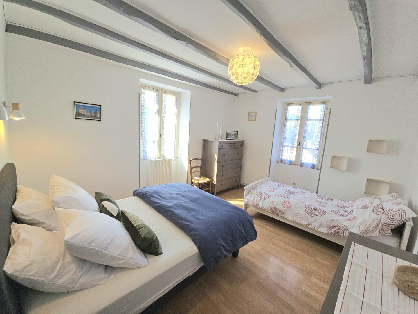 Upstairs (14 steps) you will find a bedroom with a 140cm bed and a 90cm bed, a bathroom with WC and a bedroom with a 160cm bed and its small terrace.