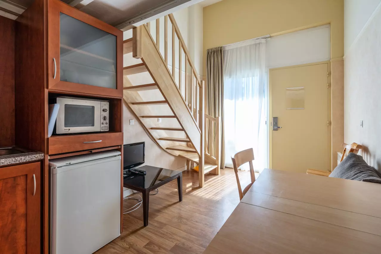 Living room composition: 1 sofa. 1 mezzanine with 2 beds (2 single beds pushed together or not). Dining area: 1 table with 4 chairs.