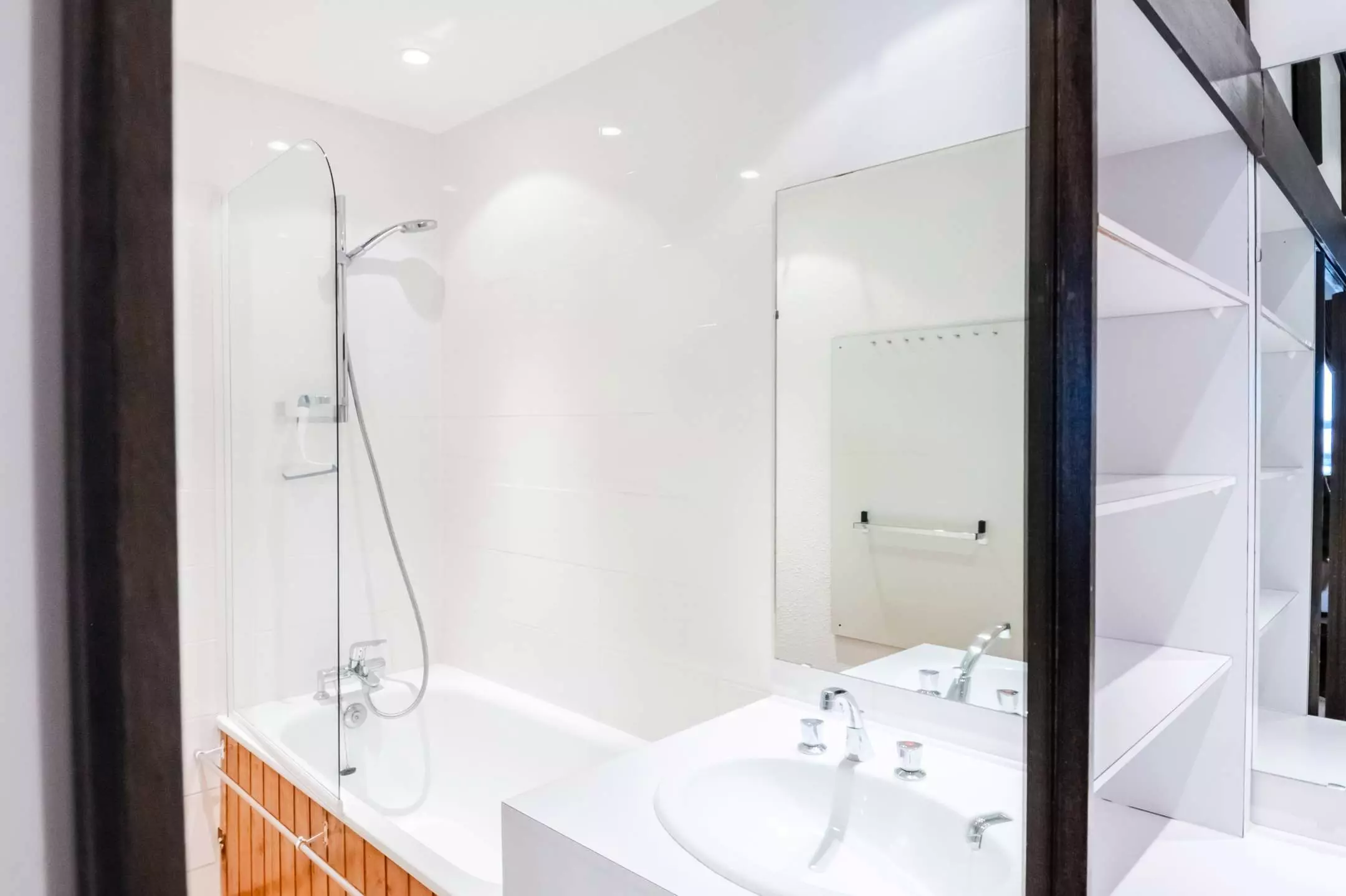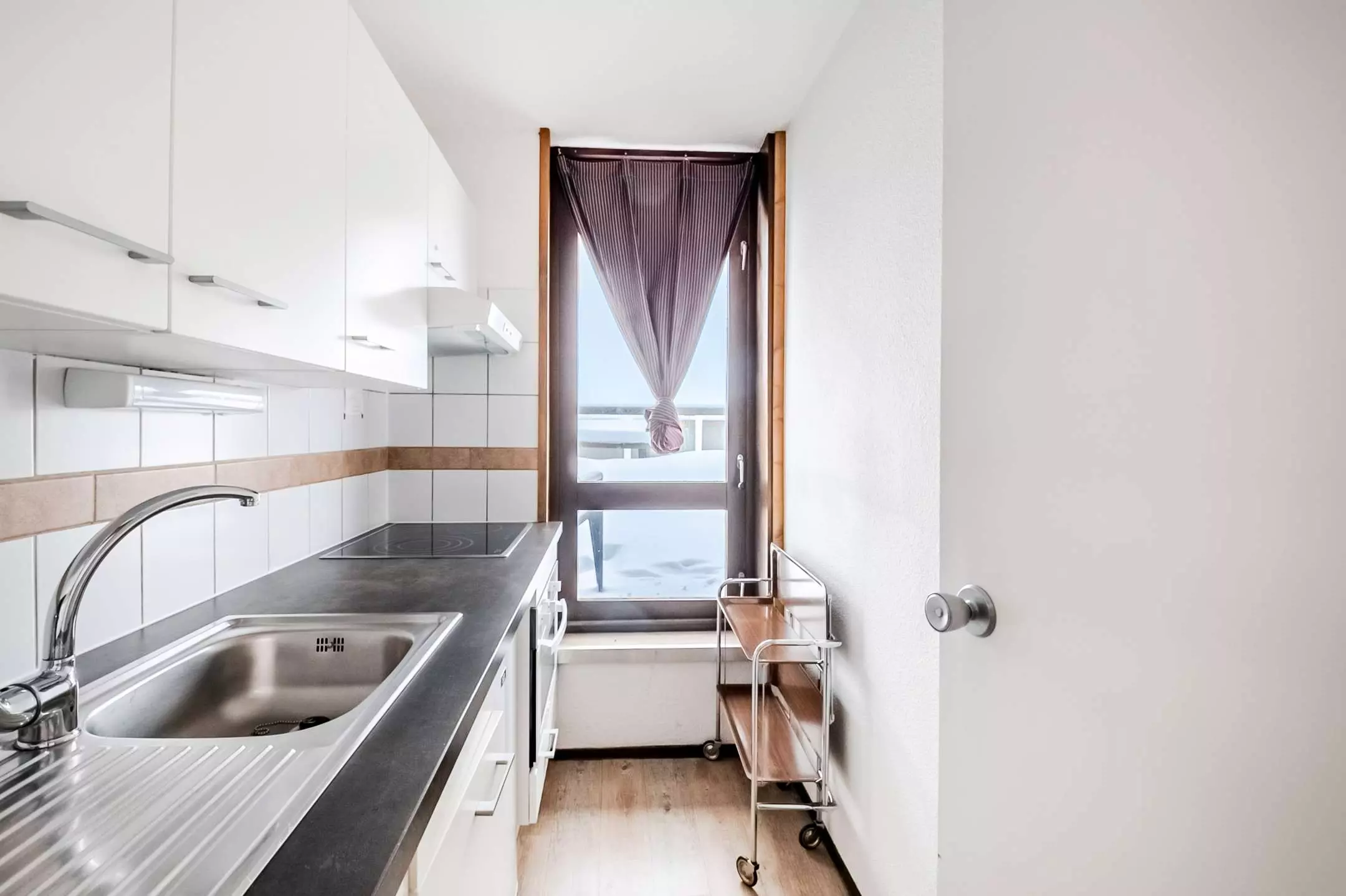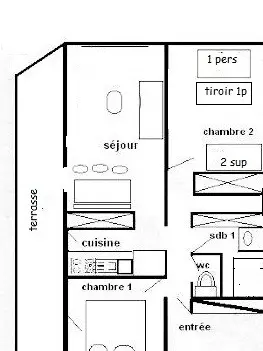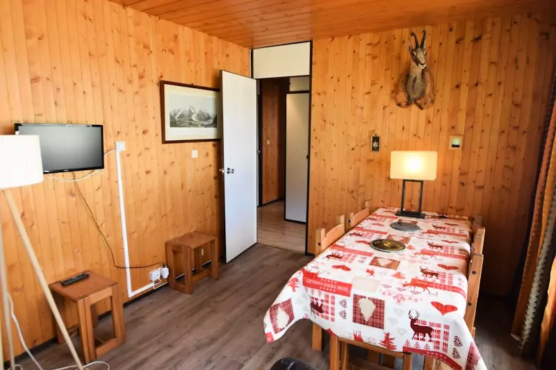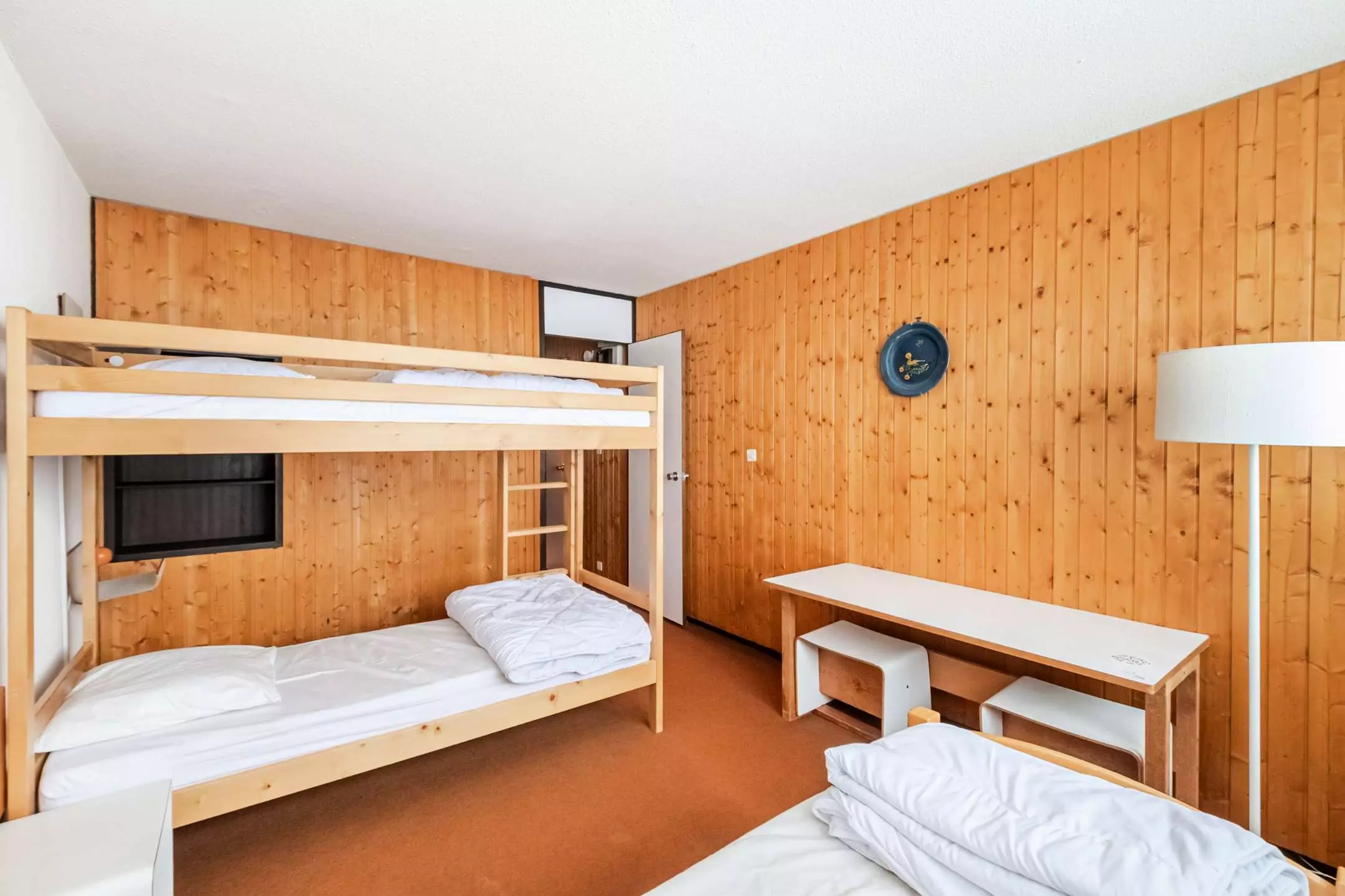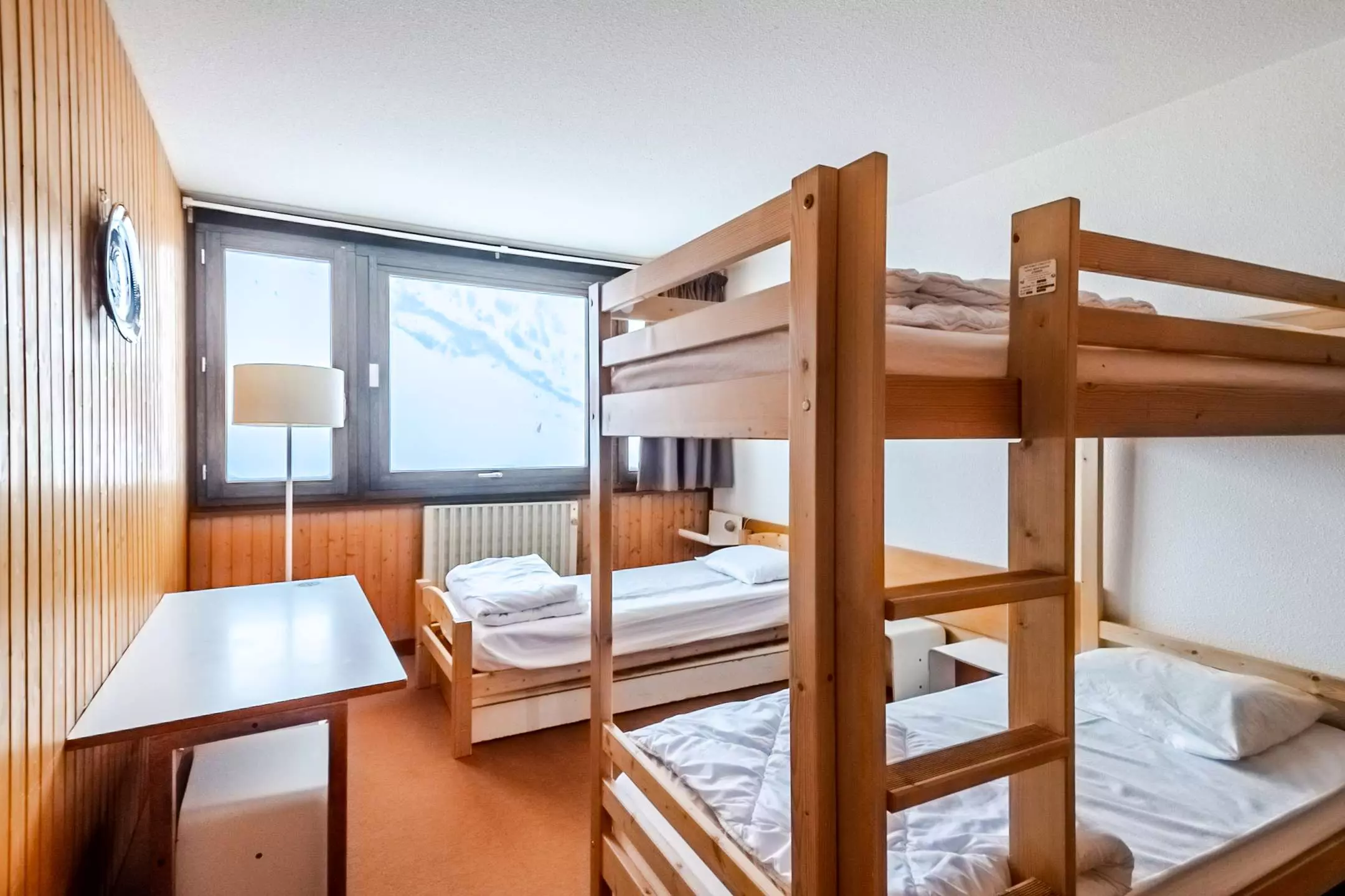 3-room apartment for 6 people, 52m2, terrace (snow removal not guaranteed), South and East exposure, view of the slopes, floor Q, with elevator (Chamois section). Kitchen in living room: 3 ceramic hobs, refrigerator, combination oven, dishwasher - Living room: dining area, lounge, television. Bedroom 1: one double bed, terrace access. Bedroom 2: 2 bunk beds, 1 single bed, 1 single drawer bed - Bathroom: bathtub, separate WC. Bedding: duvets - Floor: plastic except carpeted bedrooms -
