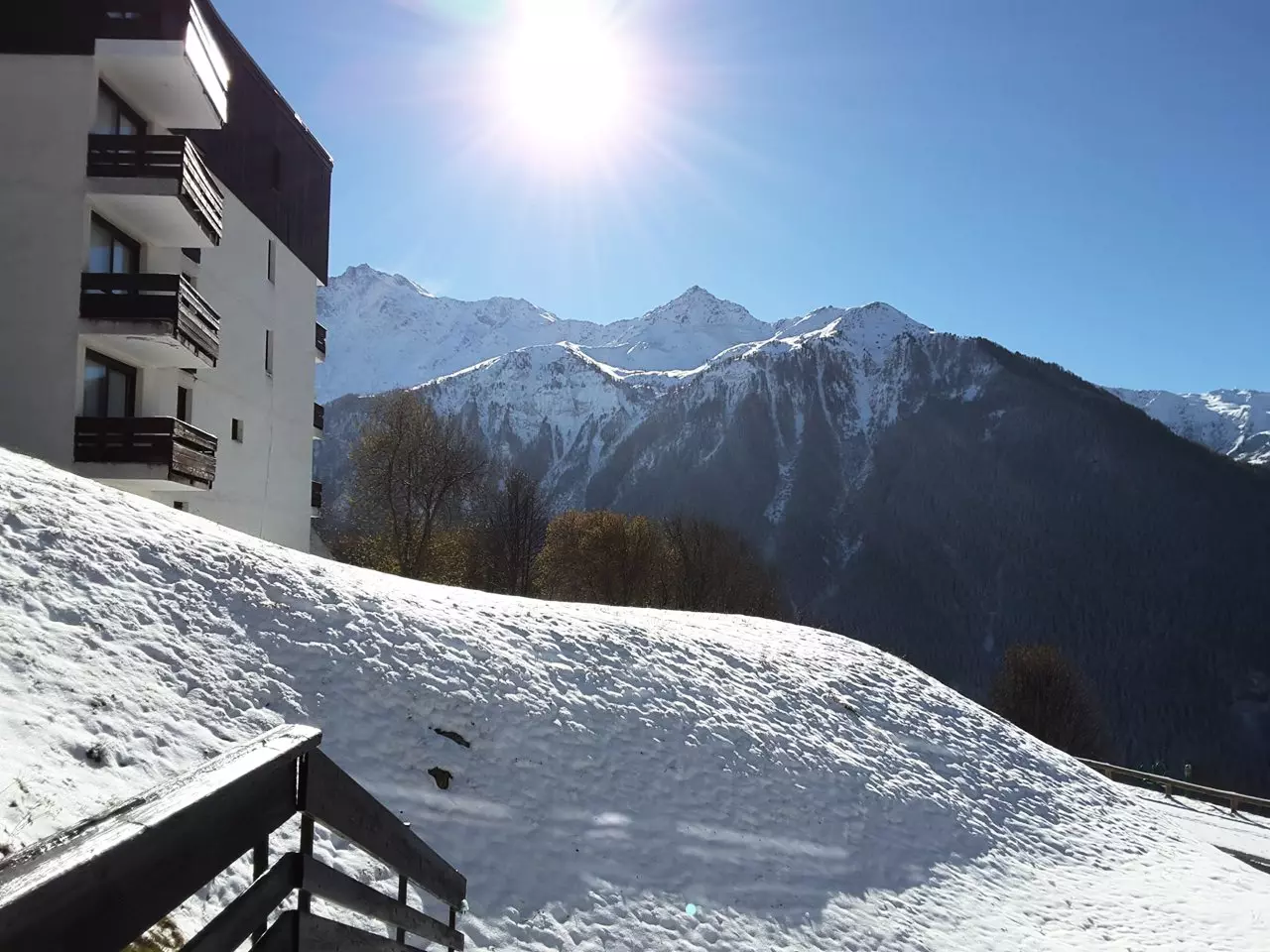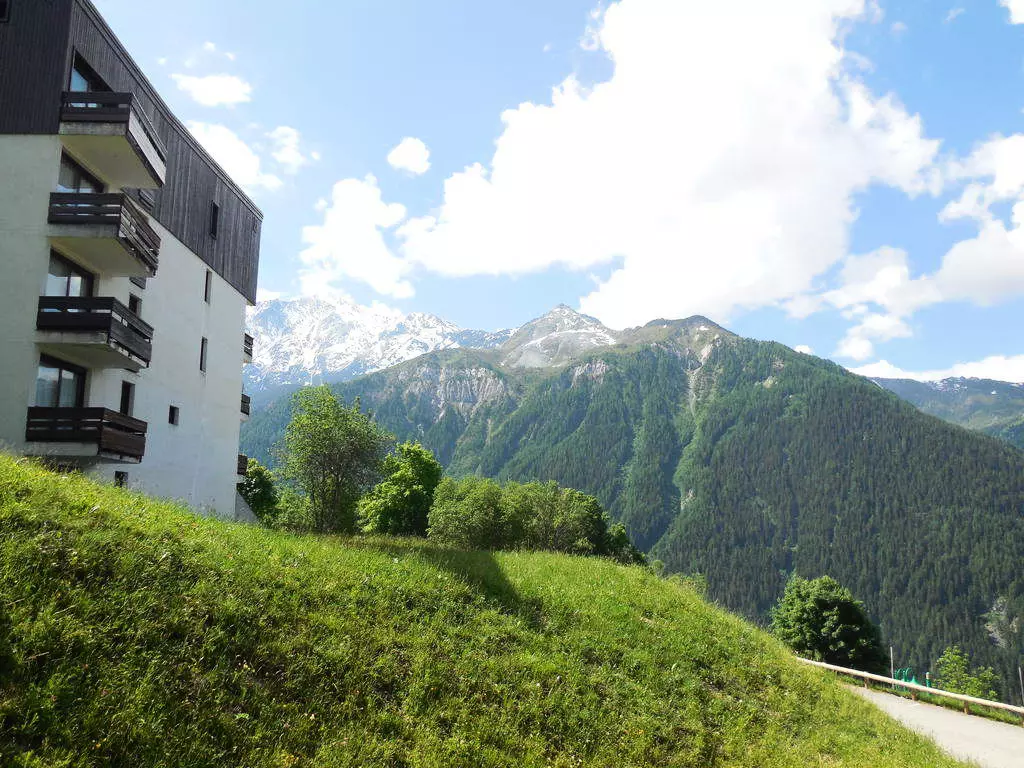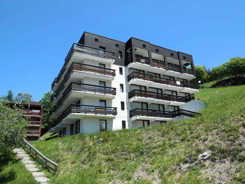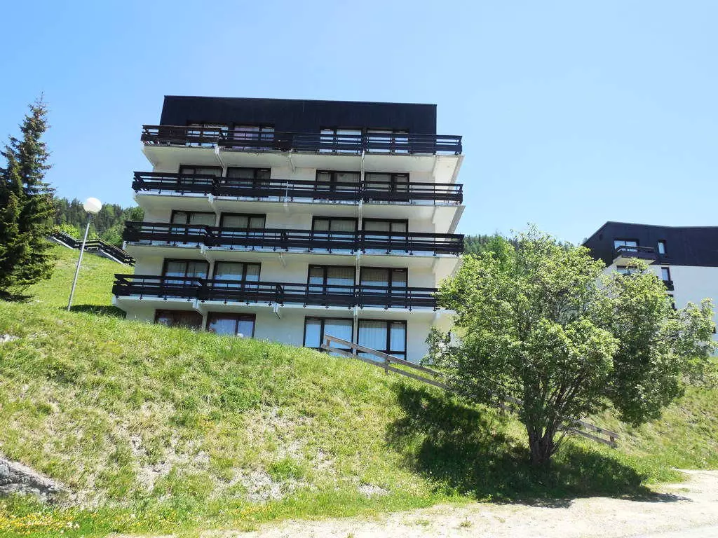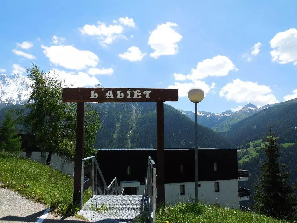 This quiet, sunny, 4-story, 1970s residence offers beautiful views. Free, uncovered communal parking is available below the residence. Access is via stairs. The slopes are approximately 200 meters away, and shops are nearby (sports shops and a mini-market).