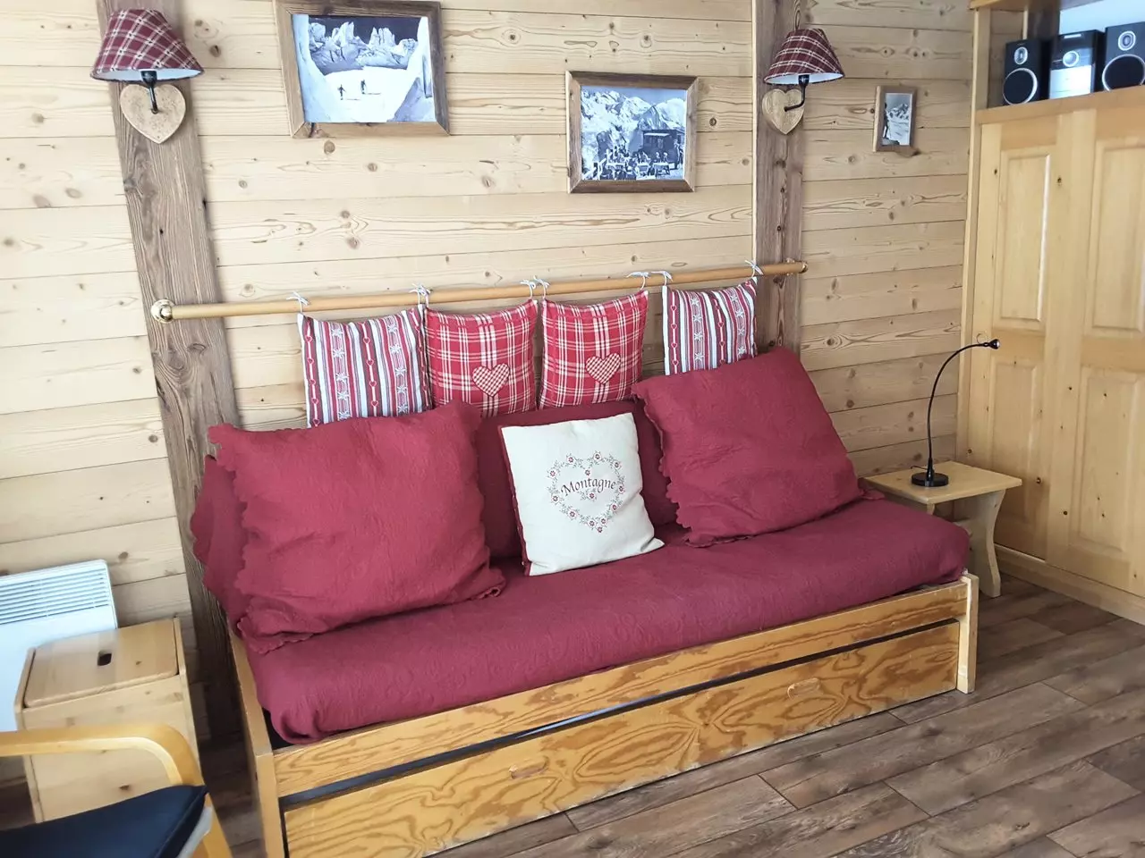 For 4 people, this apartment is composed of an entrance with 2 bunk beds, a living room equipped with a sofa bed + trundle bed, a kitchen area as well as a shower room with WC.