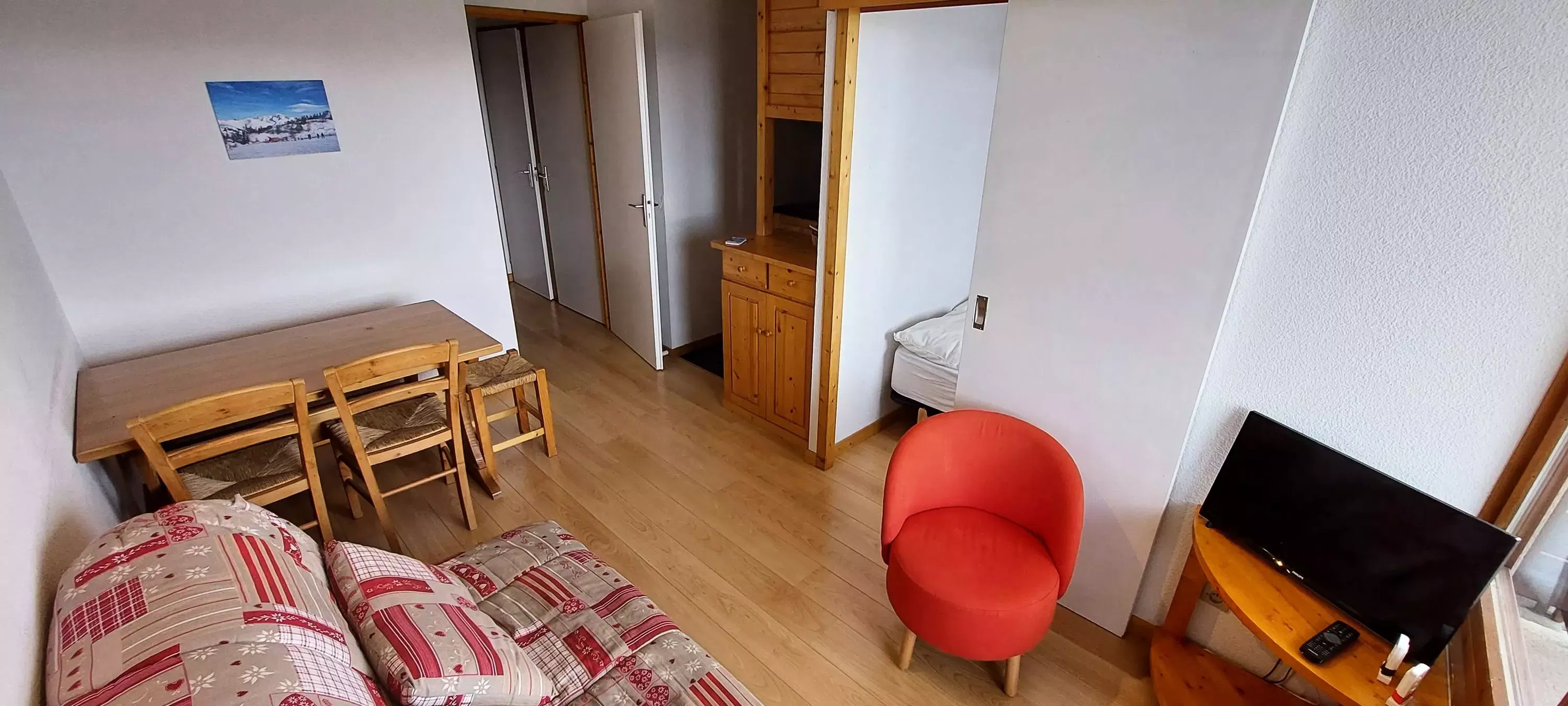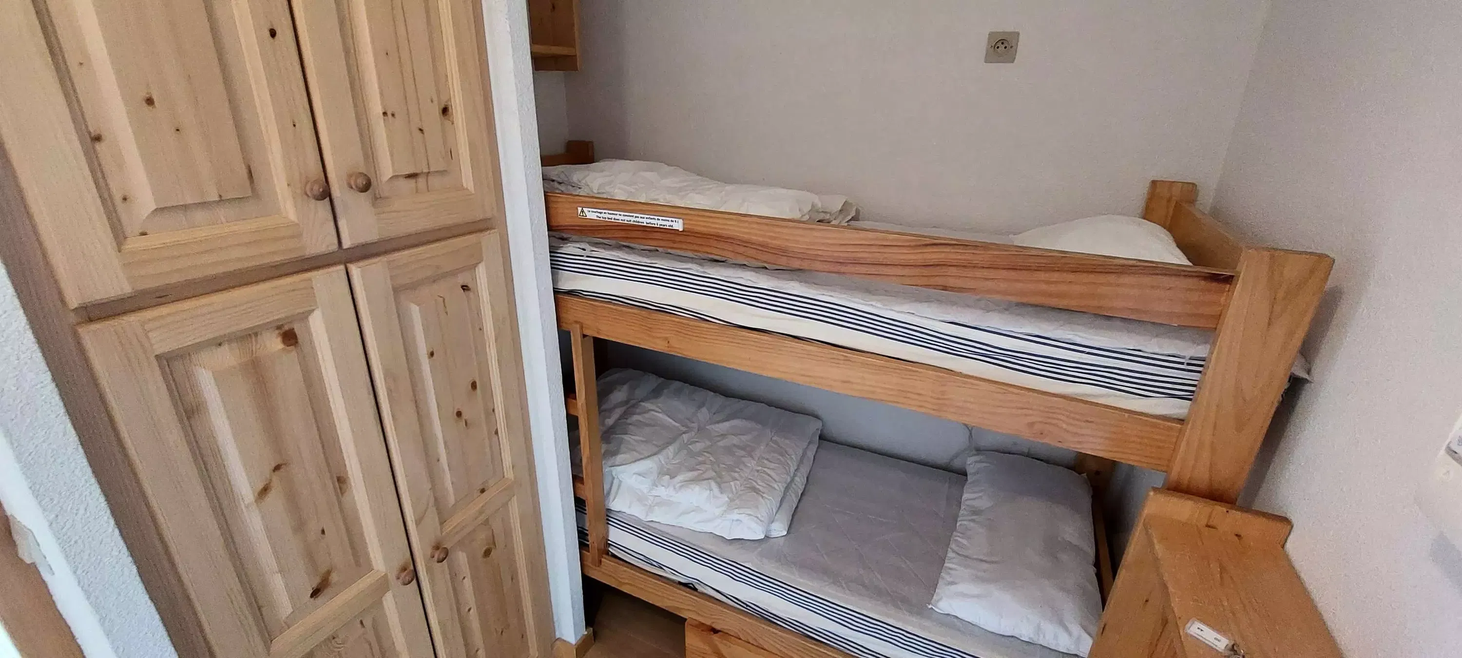 Located in a residence with elevator offering direct access to the slopes, this apartment of approximately 25m² is composed of a living room with kitchen open to the living room opening onto a balcony offering a very beautiful view of the slopes and the valley, a renovated bathroom with bathtub and separate WC, a bedroom with double bed and a sleeping area in the entrance, well separated from the living room, with bunk beds.