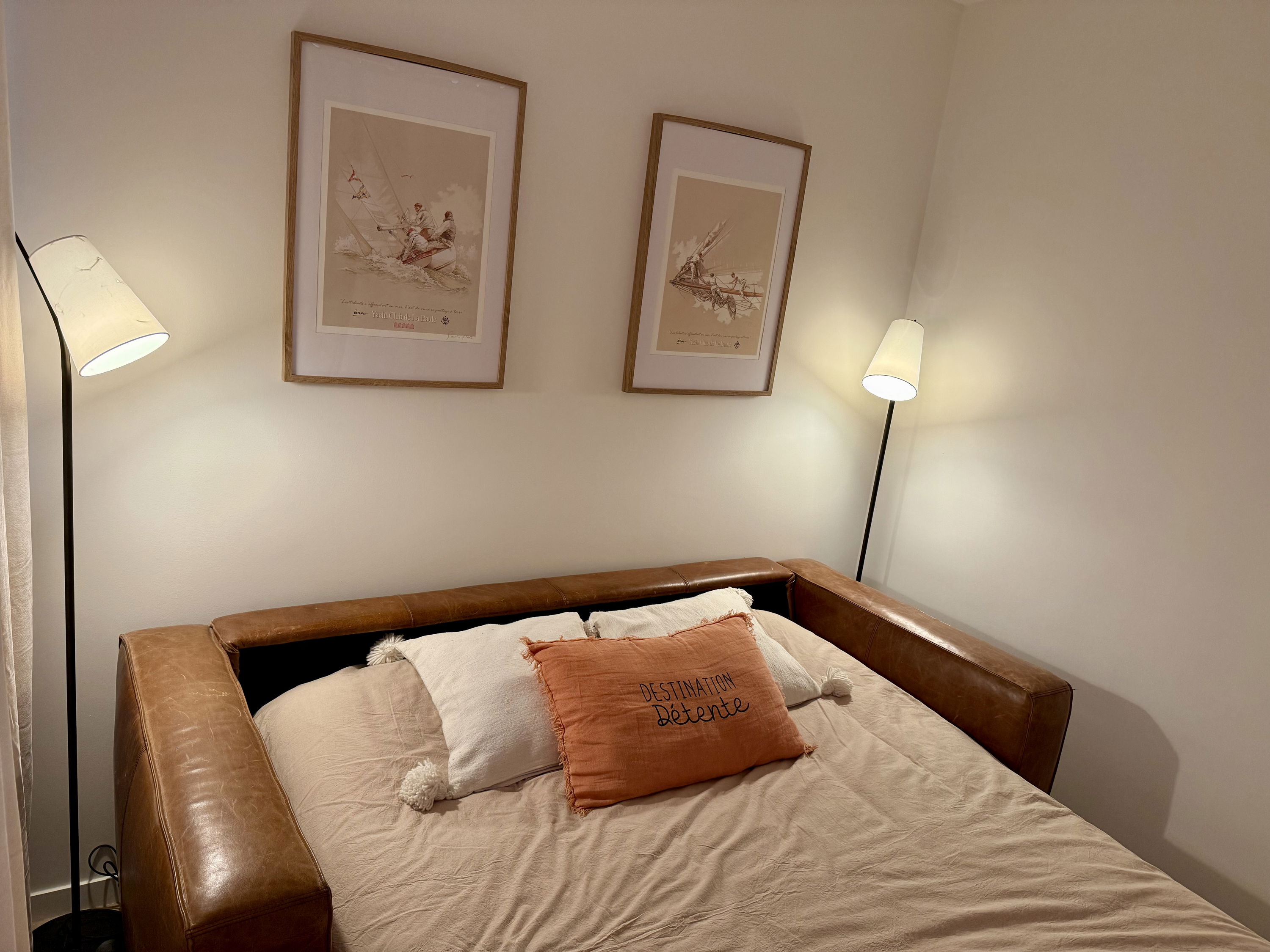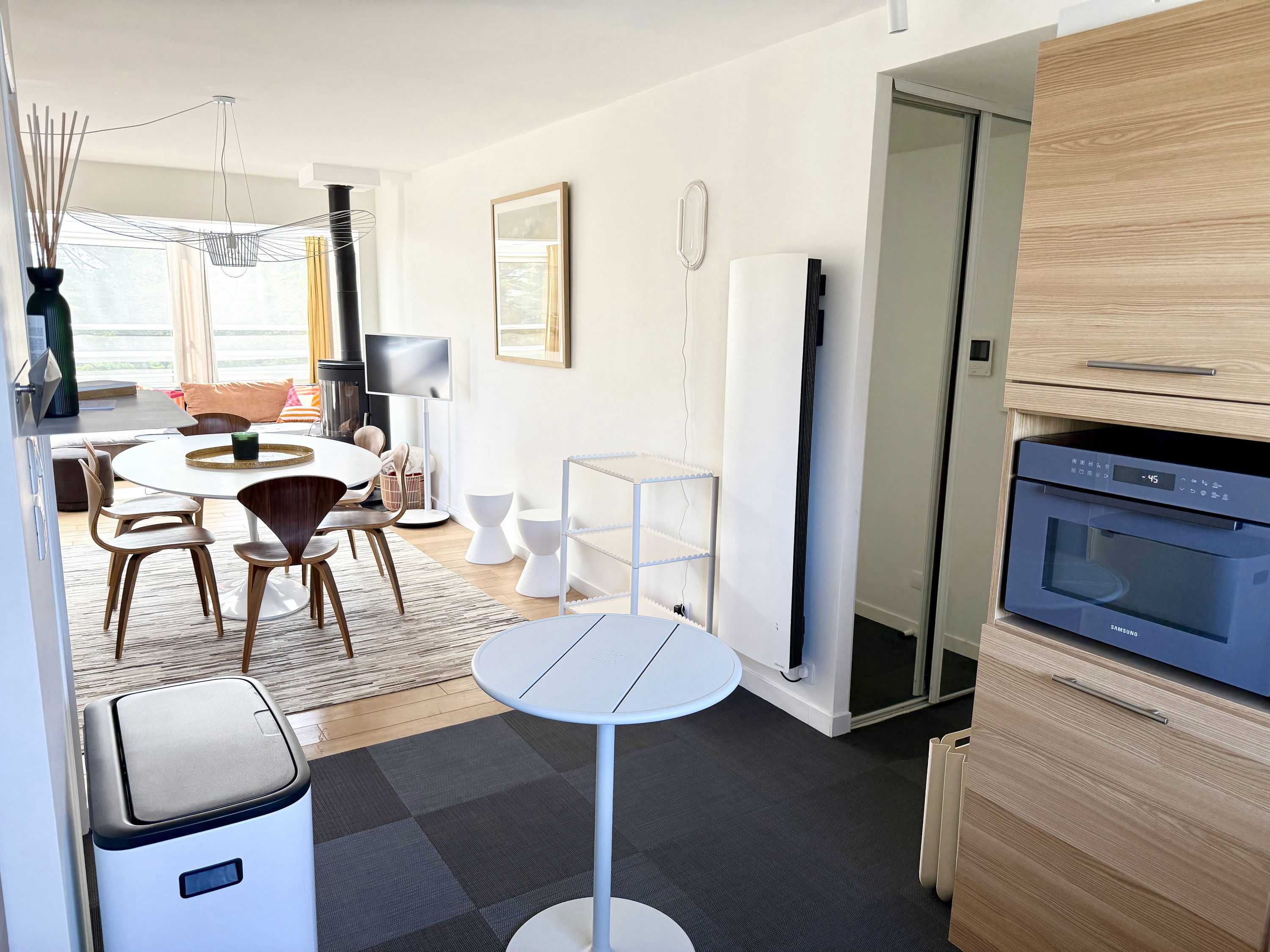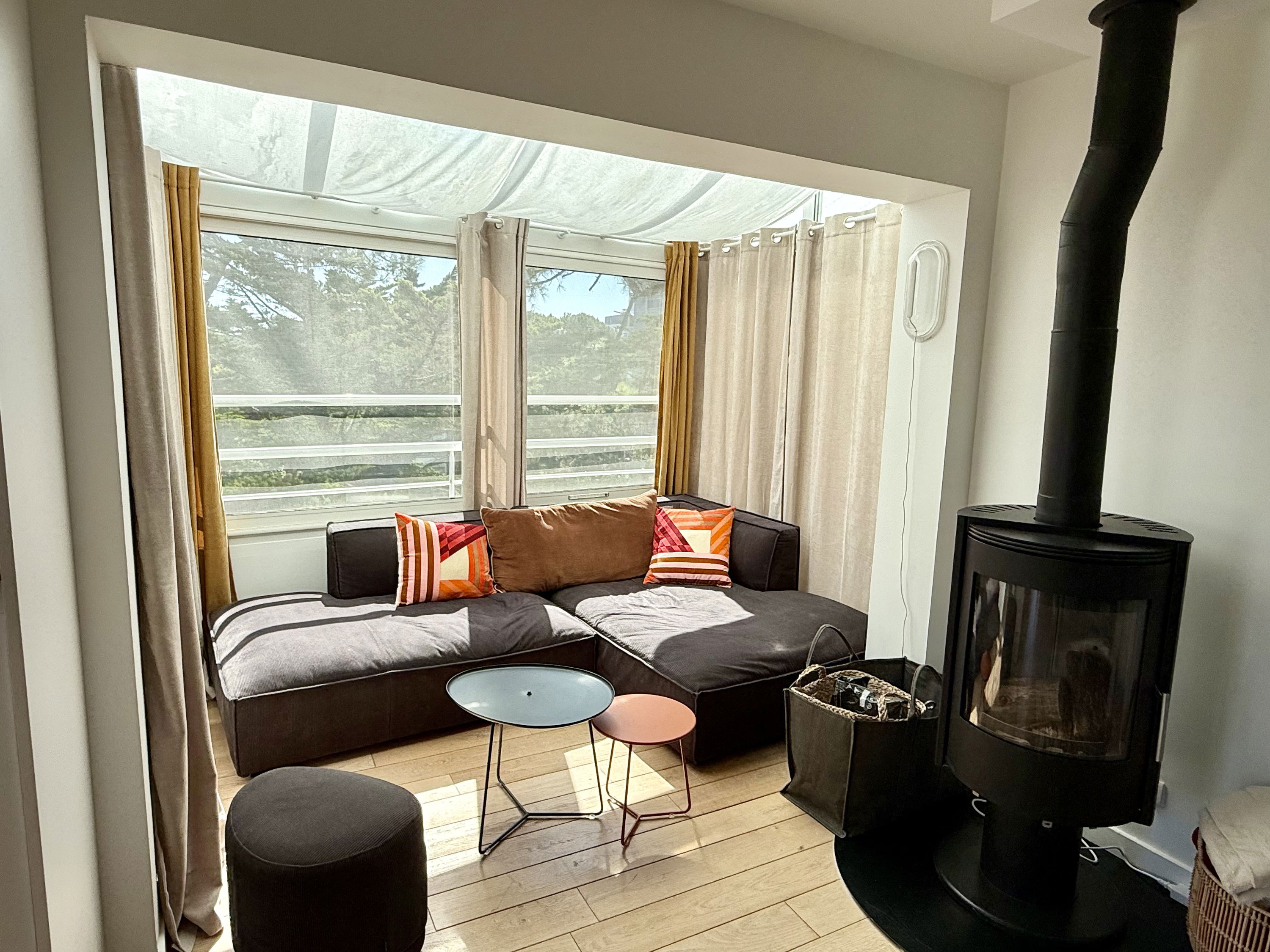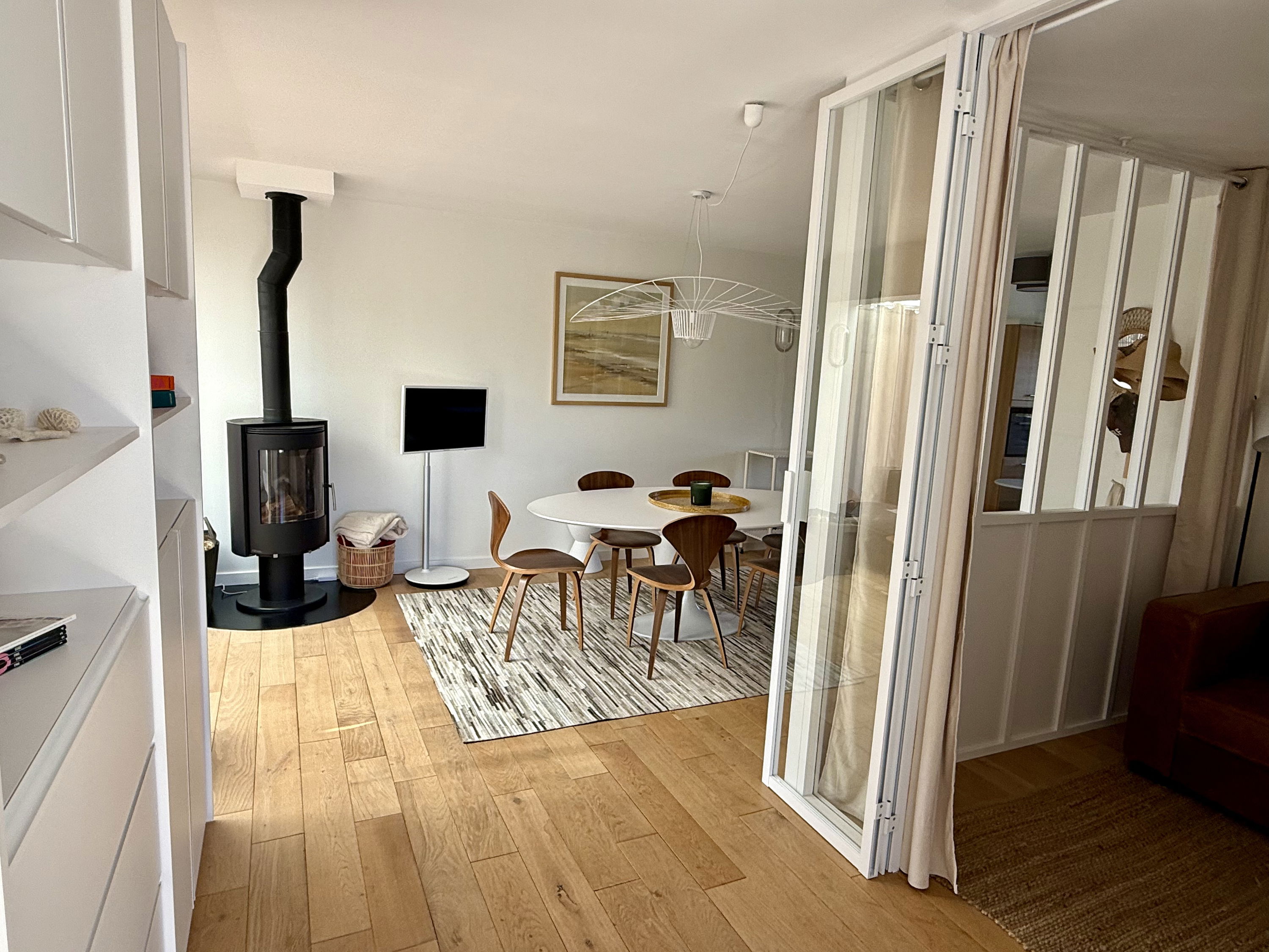 It benefits from: Bright and warm living room with lounge area (flat screen TV, WIFI access and wood stove) - Closed sleeping area with sofa bed 140/200 - Equipped and fitted kitchen (oven/microwave, capsule machine, kettle, citrus press, toaster, dishwasher, fridge/freezer, induction hob, extractor hood) - The two bedrooms have a cupboard/wardrobe and a double bed 160/200 - Shower room (shower, washer-dryer and towel dryer with integrated speaker).
