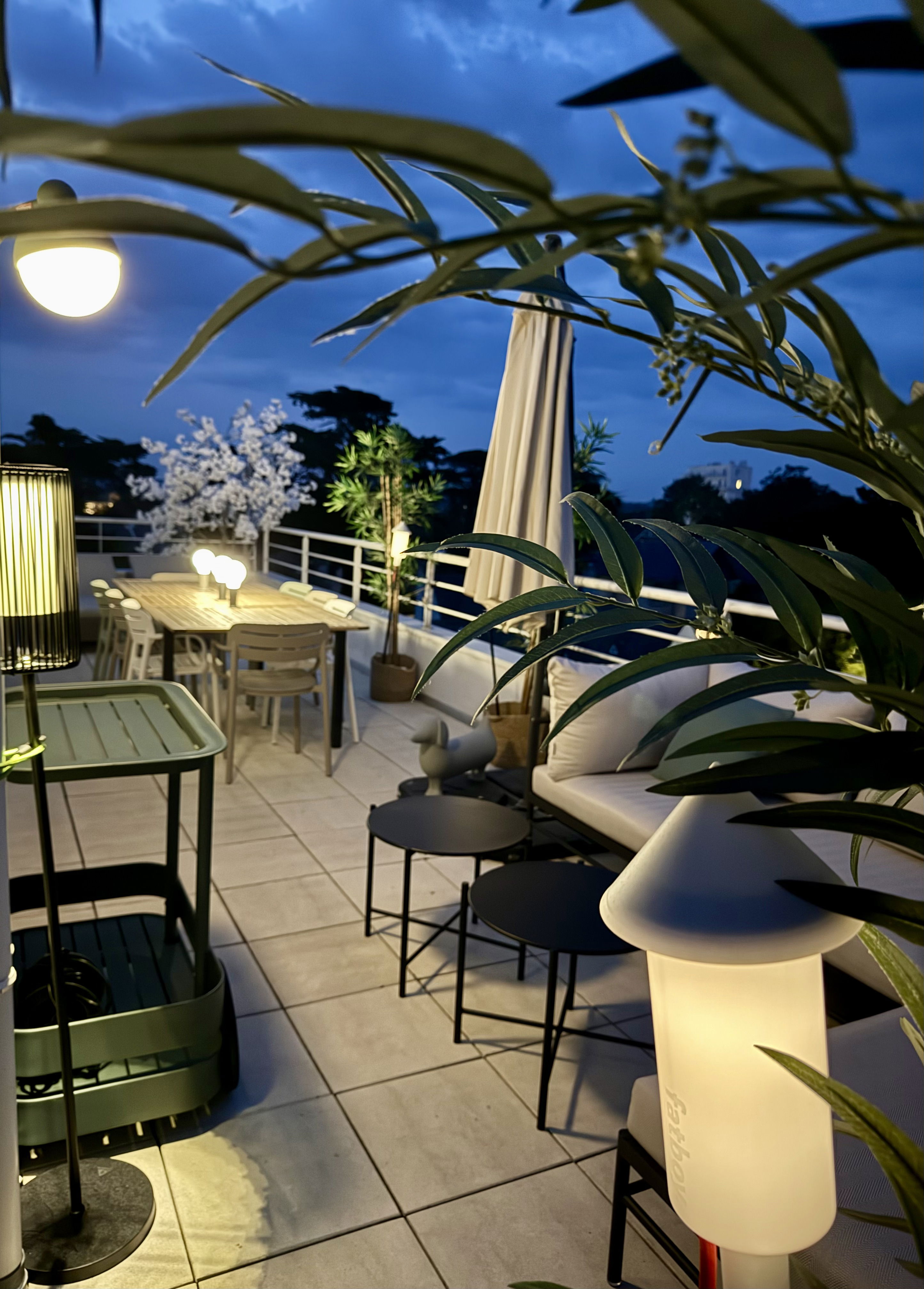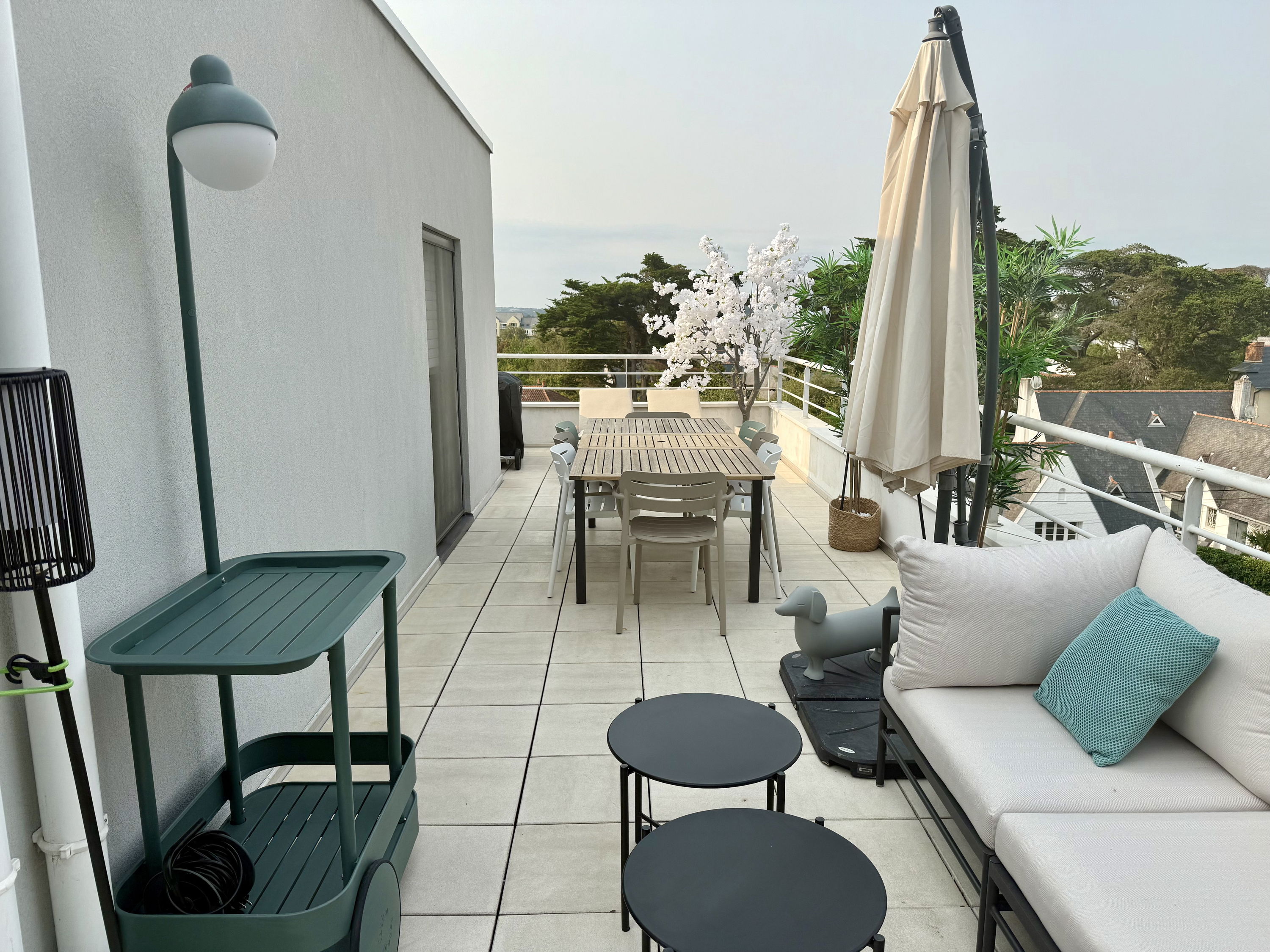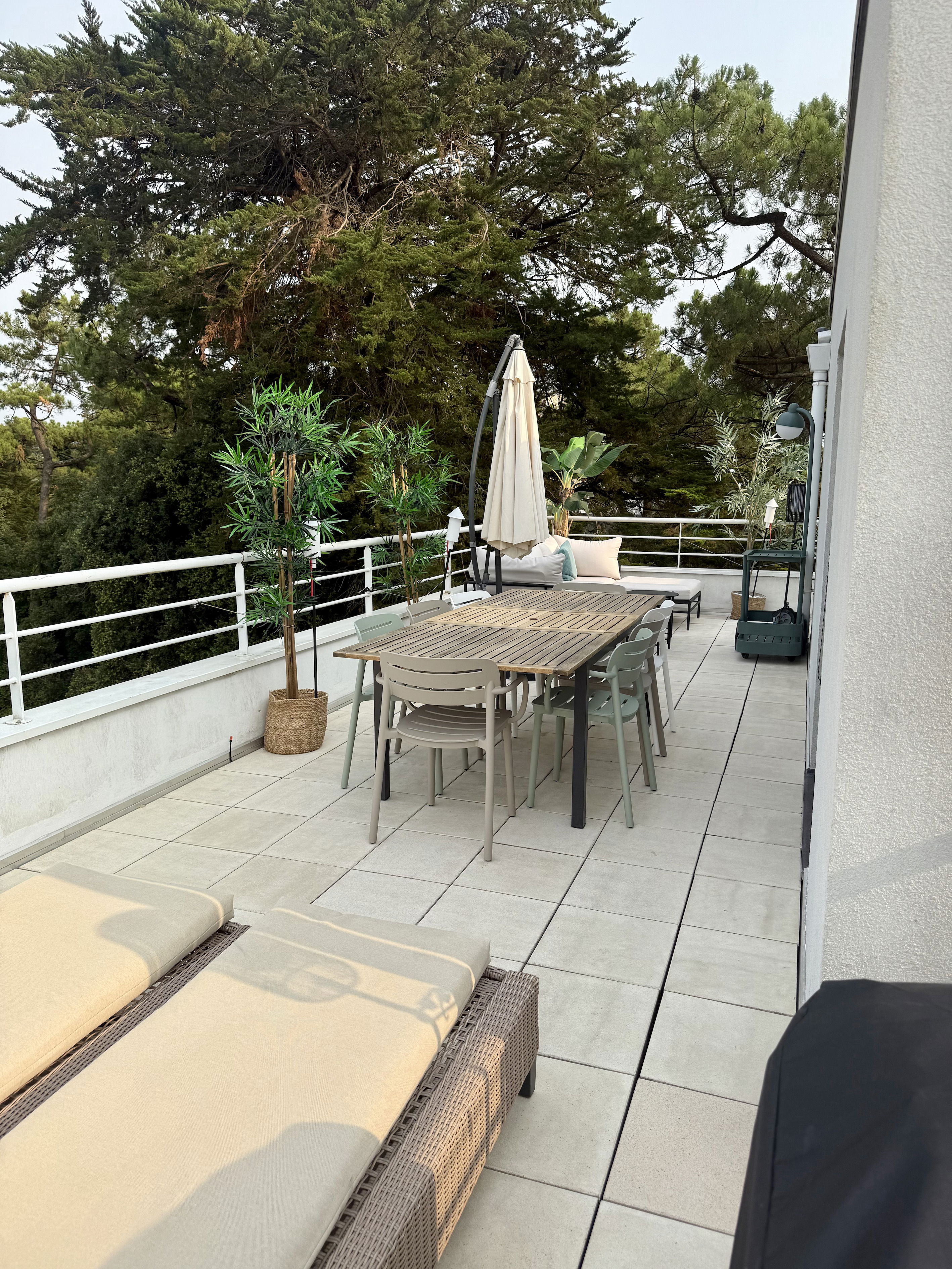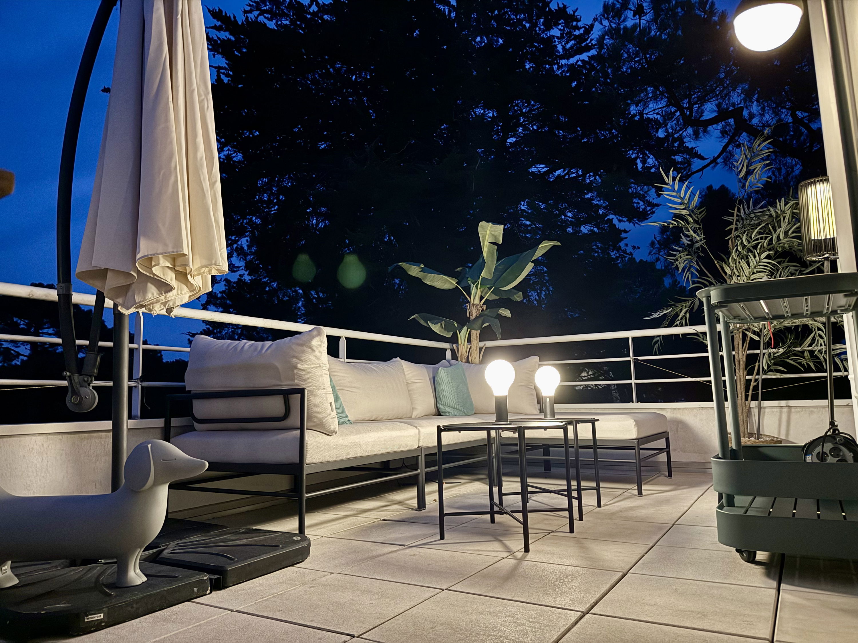 The outdoor space is pleasant and well-equipped (parasol, sun lounger, patio furniture).