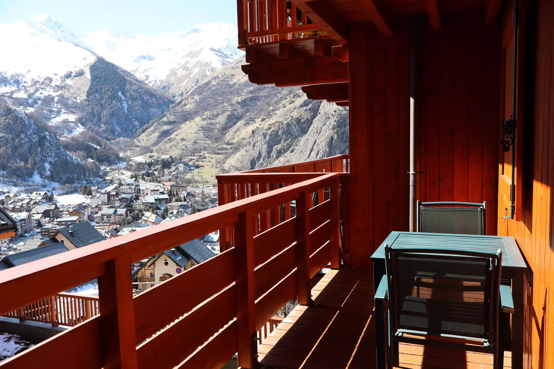 Balcony (8m²/South) with table and two chairs. One private outdoor parking space.
