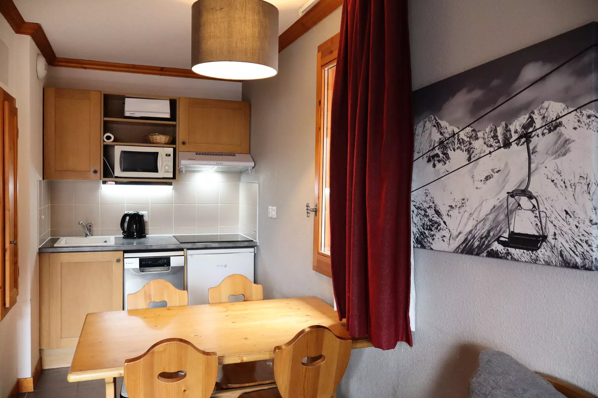 - Kitchen area: microwave/grill, dishwasher, refrigerator, ceramic hob (4 burners)