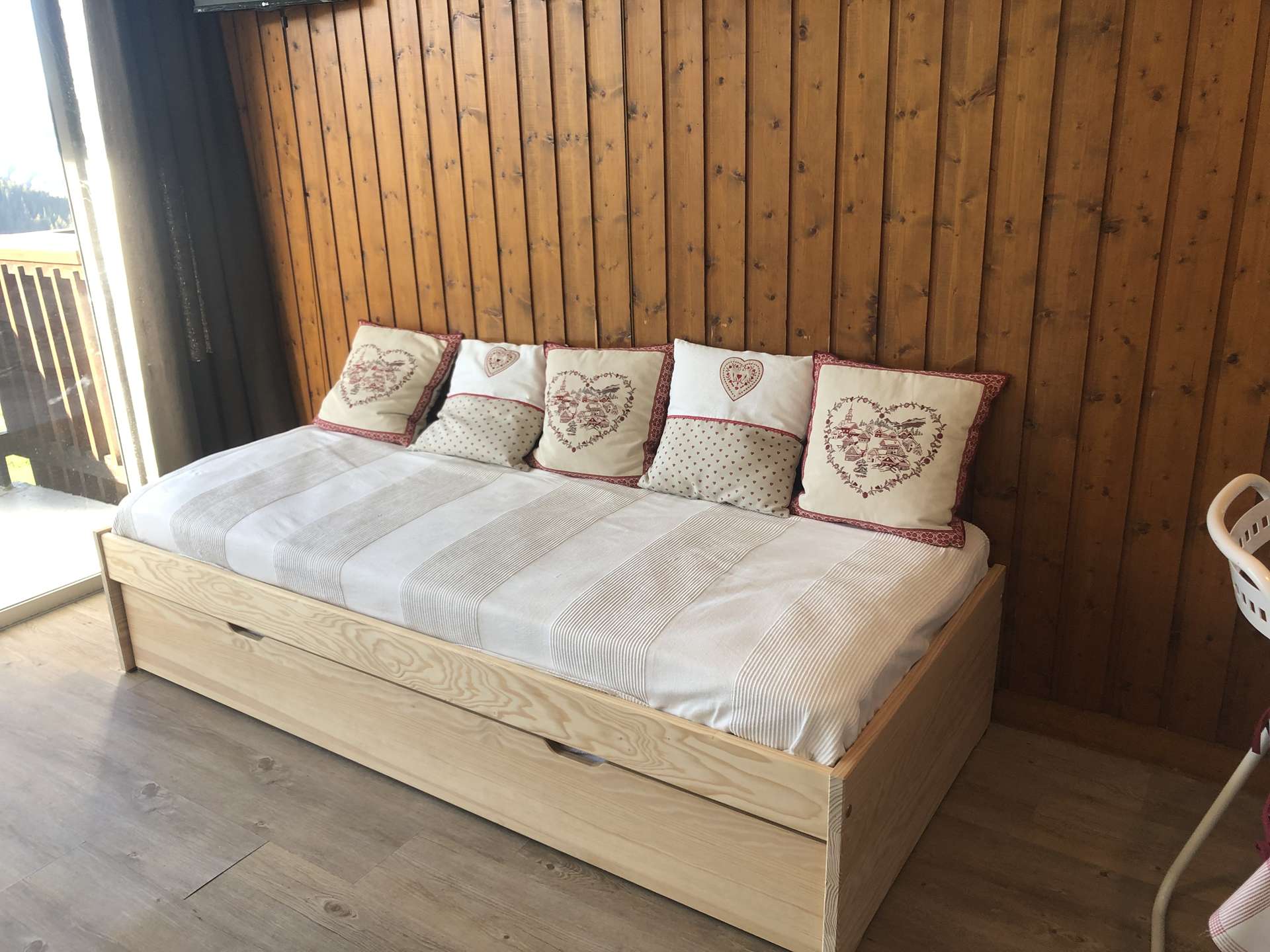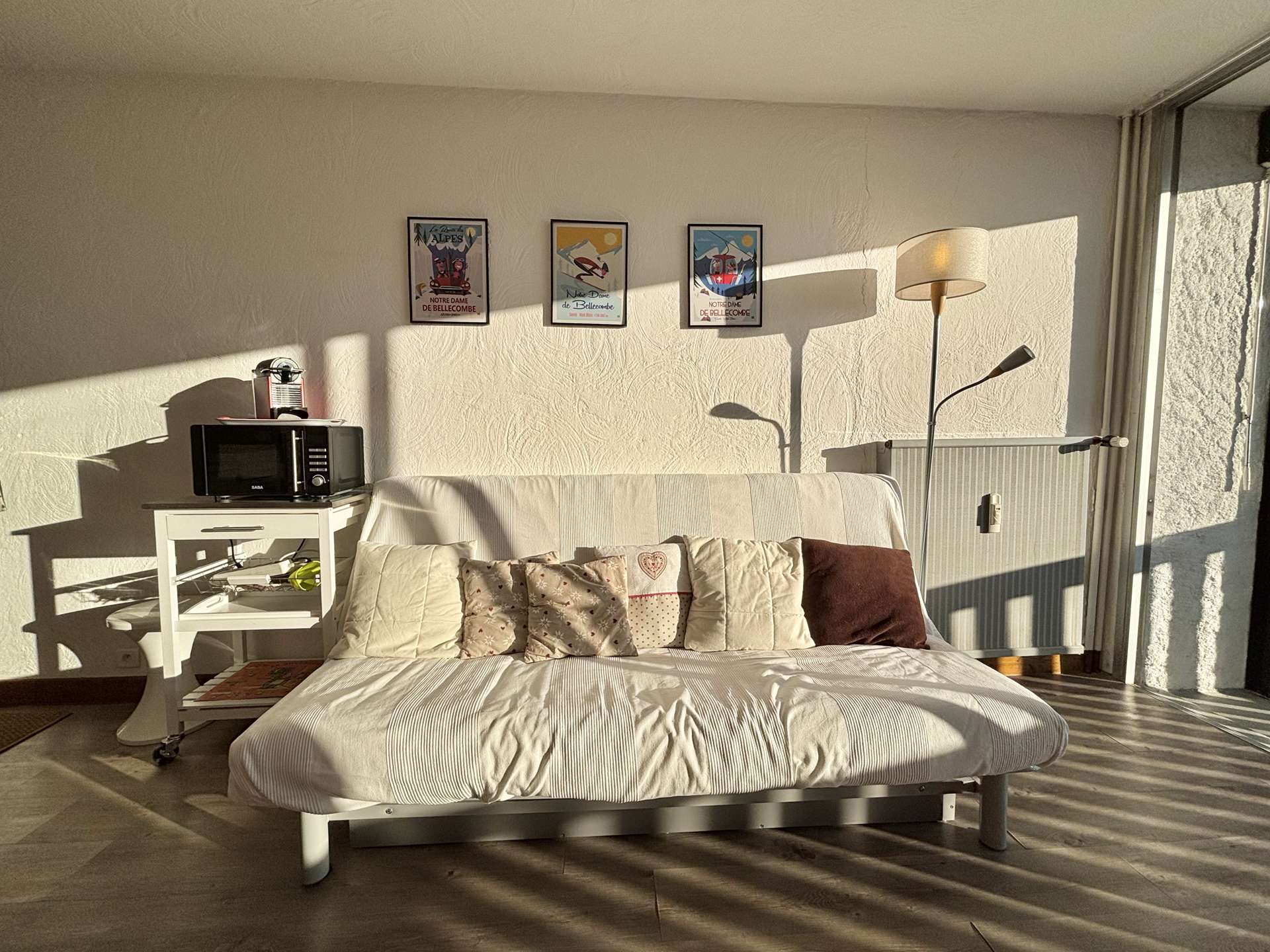 This 23 m² studio apartment is located on the eighth floor with lift access and comprises a kitchen area opening onto a living room with a large bay window overlooking the mountains, a shower room with WC, a living room with a sofa bed for two people and a pull-out bed for two people.