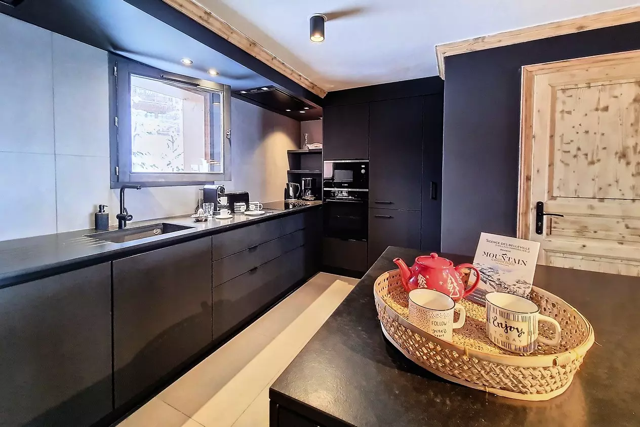 You enter into an open kitchen equipped with a large central island allowing you to share friendly moments around this standing table.