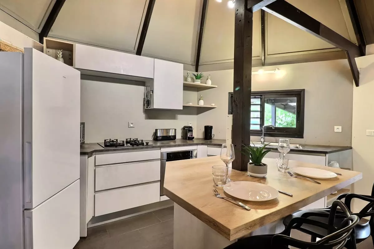 The living room, bathed in light throughout the day, opens entirely onto the terrace and the sea, blurring the boundaries between indoors and outdoors. It offers a welcoming and peaceful space perfect for reading, socializing, or simply gazing at the lagoon. The modest but fully functional kitchen features a refrigerator, microwave, coffee maker, and kettle. The living room is equipped with portable fans.