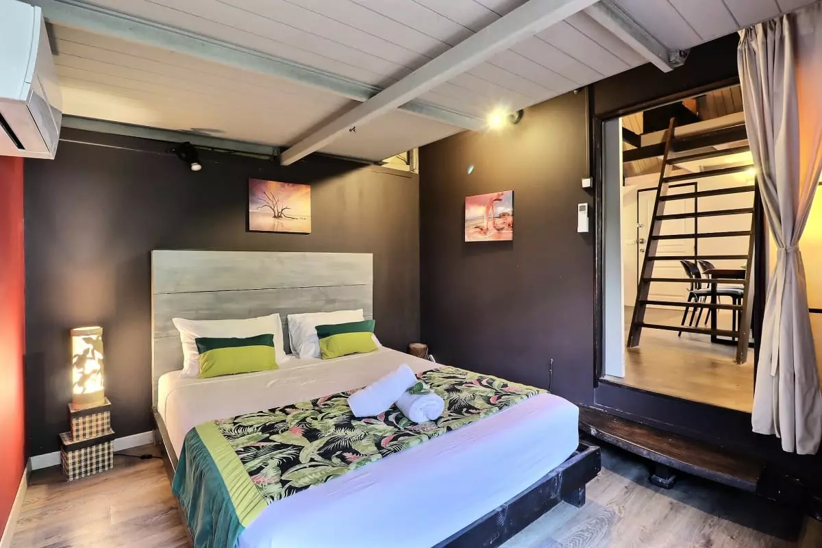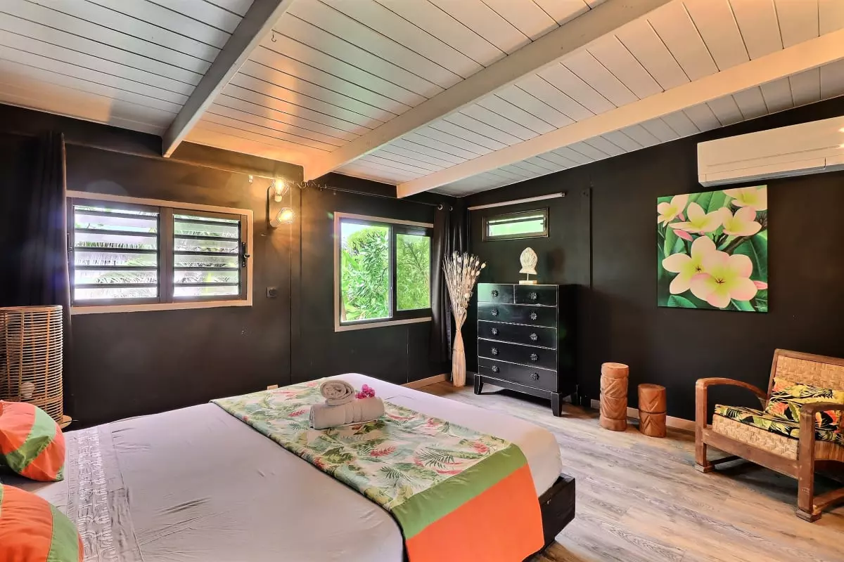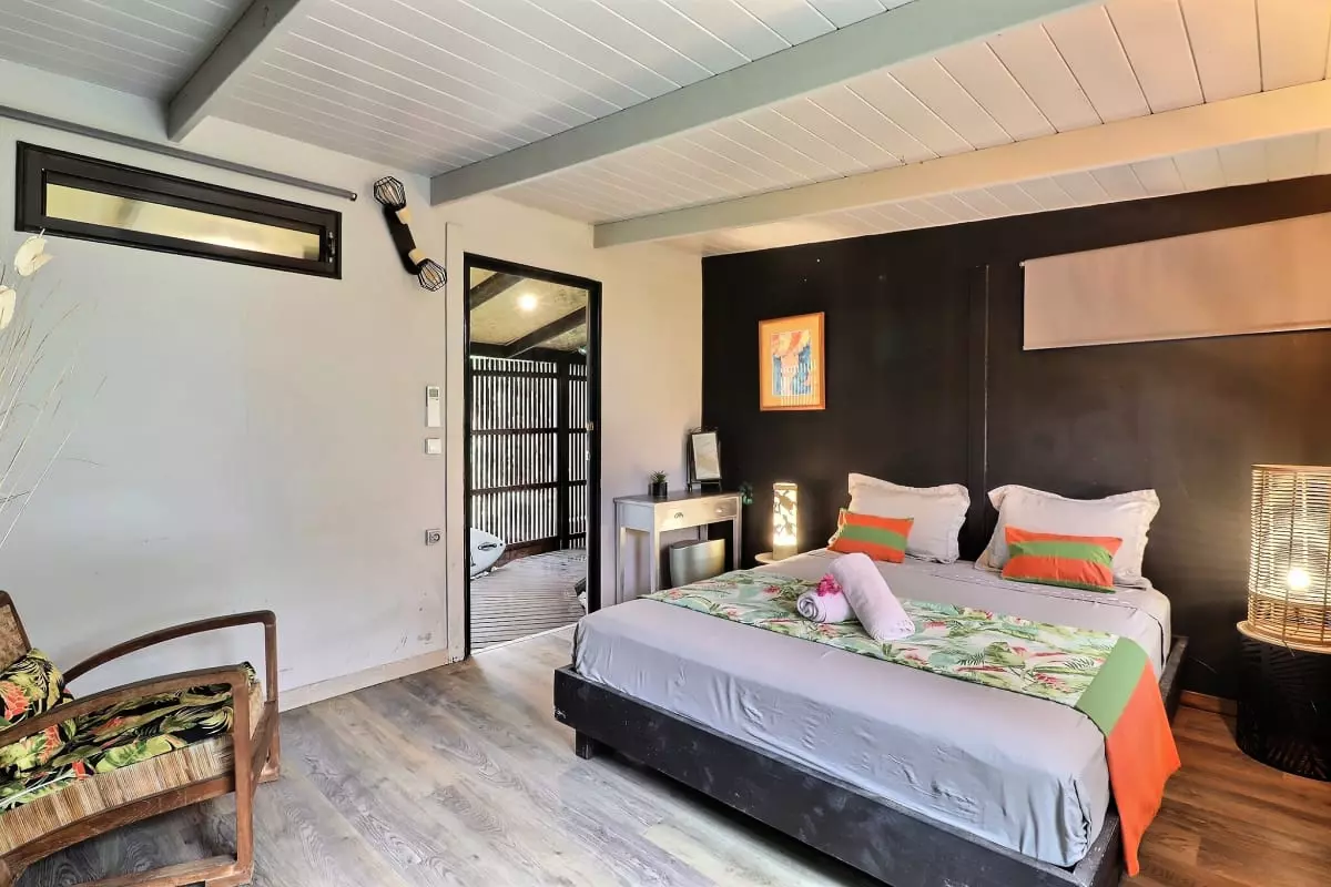 A air-conditioned bedroom faces the sea. Equipped with a double bed (160 x 200 cm), it offers a direct view of the lagoon and constitutes a true cocoon of tranquility.