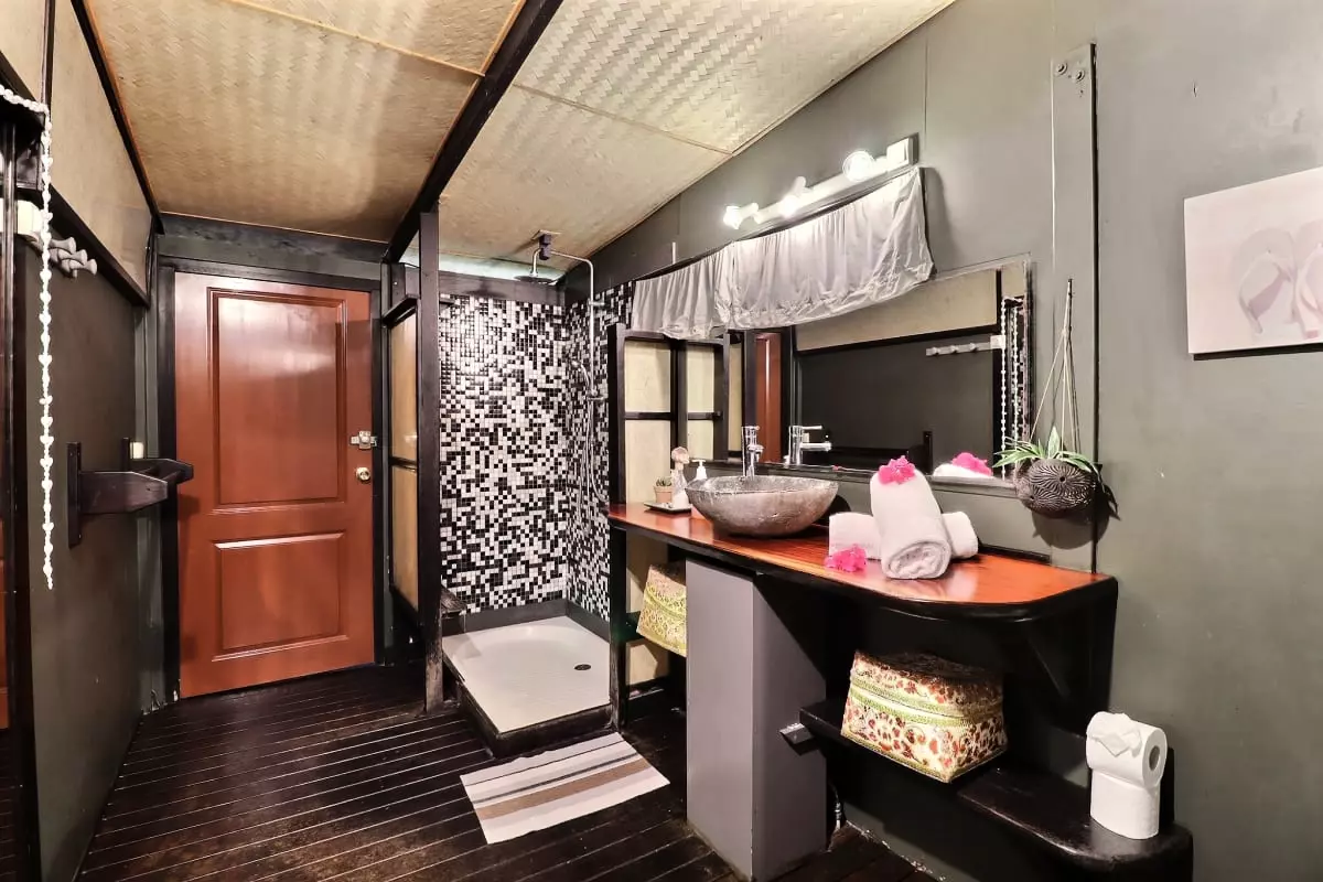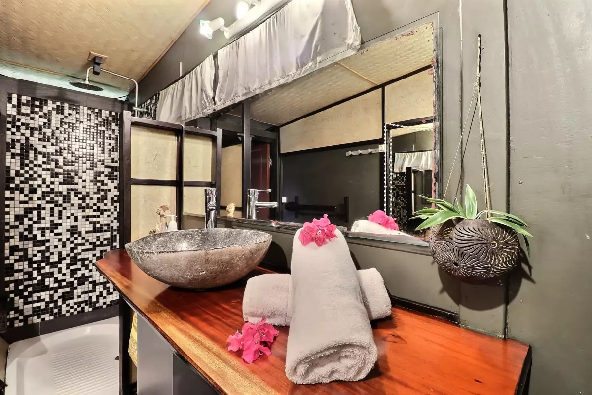 The house has a single bathroom with a walk-in shower, ideal for refreshing yourself after a swim or a tropical hike. Functional and refined, it is a natural extension of the spirit of the place.