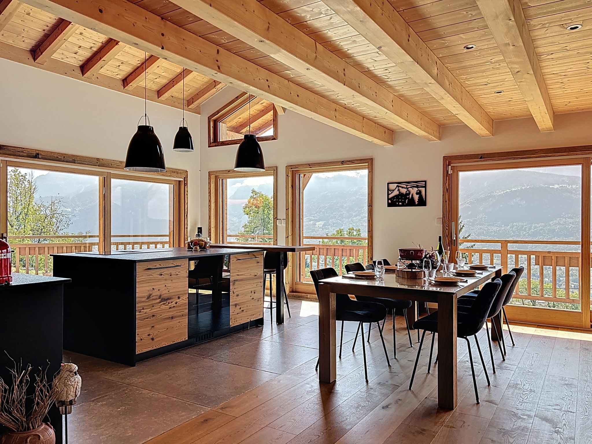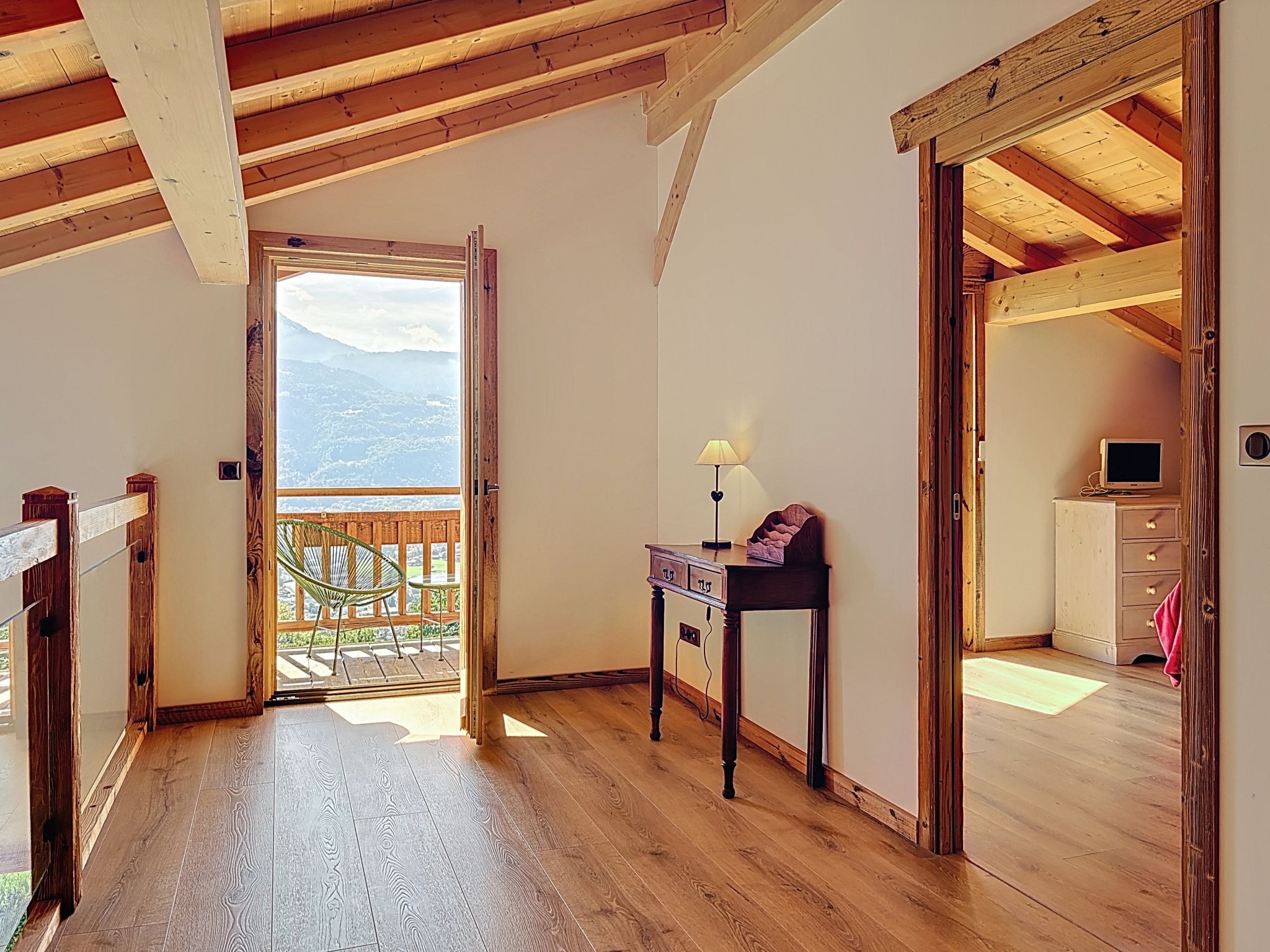 5-room chalet 180 m2 on 2 levels. Luxurious and tasteful furnishings: living/dining room with open-hearth fireplace, TV, Home cinema and electric shutters. Exit to the terrace, south-west facing position. 1 room with 1 double bed (160 cm, length 200 cm), shower. Exit to the garden. Large, open kitchen (dishwasher, 4 induction hot plates, toaster, kettle, electric coffee machine, Capsules for coffee machine (Nespresso) extra, raclette grill, cooking island, combination microwave, fondue Set (cheese)) with dining table. Sep. WC. Floor heating, boiler. On the lower ground floor: large entrance hall. Upper floor: gallery. 1 room with 1 double bed (160 cm, length 200 cm). 1 room with 1 double bed (160 cm, length 200 cm). Bath/shower, sep. WC. Large terrace 10 m2, south-west facing position. Terrace furniture, barbecue. Very beautiful panoramic view of the mountains and the valley. Facilities: washing machine, dryer, safe, iron, children's high chair, baby cot, hair dryer. Internet (WiFi, free). Garage (2 cars). Please note: non-smokers only. Smoke alarm, no lift. Outdoor hot tub on the terrace. Offer by a private individual according to Art. 155, IV of CGI.