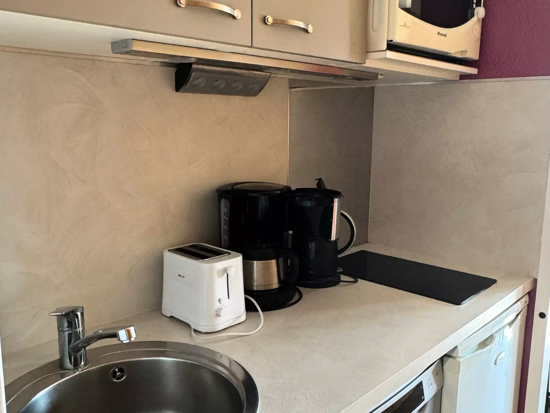 Kitchen: open to the living room with 2 ceramic hobs, a combination oven, a dishwasher and a refrigerator