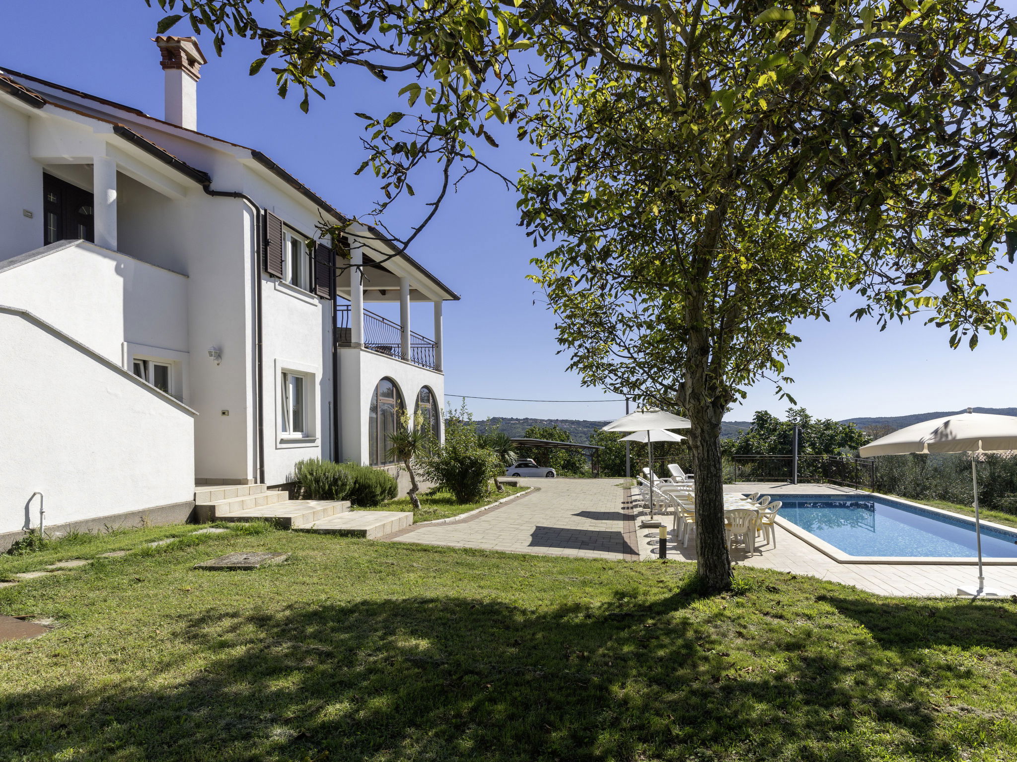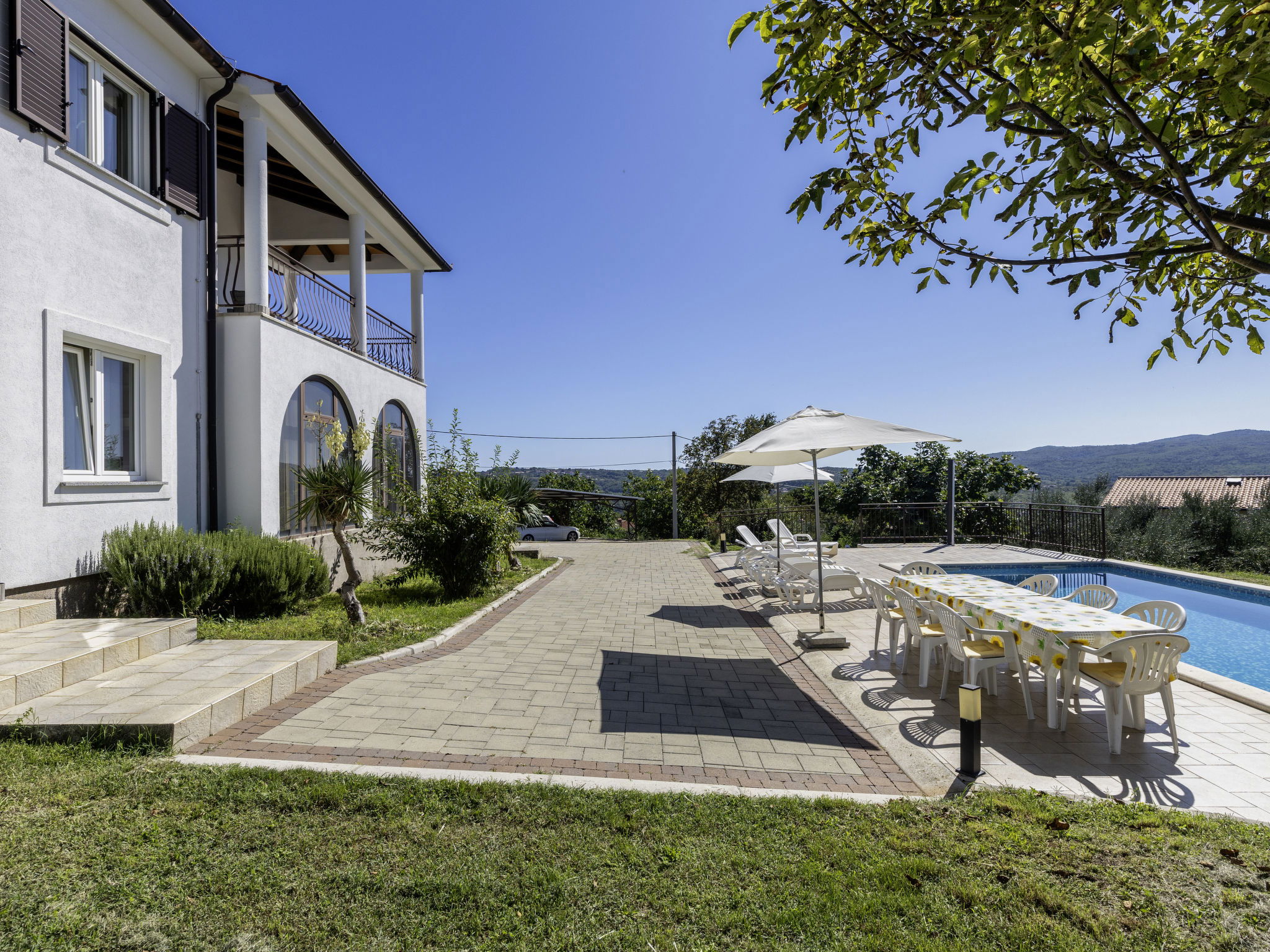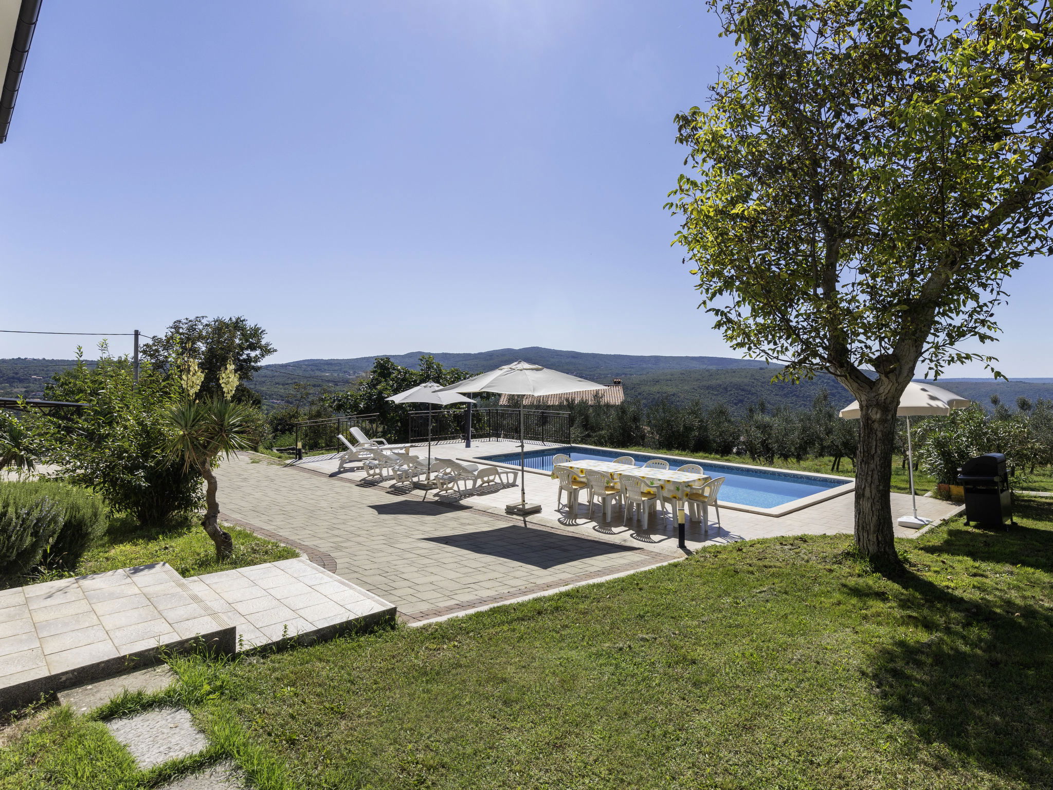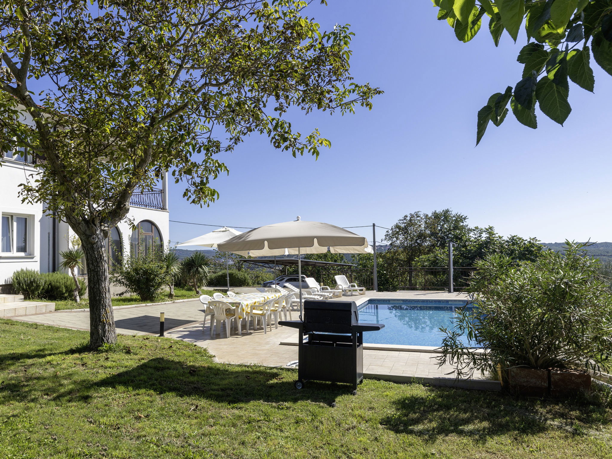 2-family house "Meri". In the hamlet Sveti Bartul 4 km from the centre of Labin, 9 km from the centre of Rabac, in a sunny position, 9 km from the sea, in the countryside. For shared use: property 1'500 m2 with plants and trees. Private: swimming pool angular (8 x 4 m, depth 140 cm, seasonal availability: 01.Apr. - 30.Oct.) with internal staircase. Outdoor shower, barbecue, pool maintenance by the owner/gardener. In the house: internet access. Roofed, parking at the house on the premises. Shop 3 km, supermarket 5 km, restaurant 5 km, bus stop "Labin" 5 km, pebble beach 9 km. The owner does not accept any youth groups. Please note: airfield 50 km from the property.