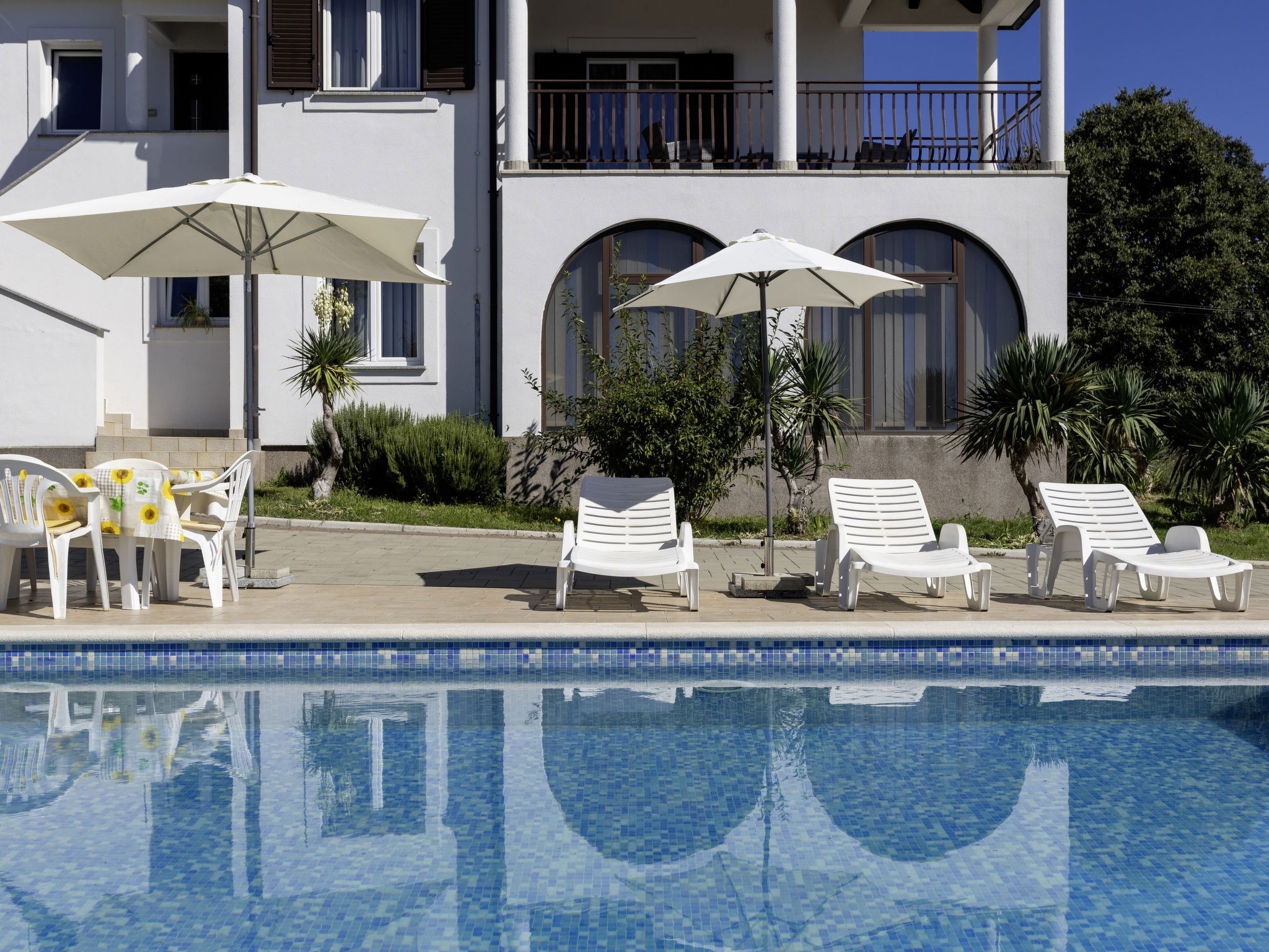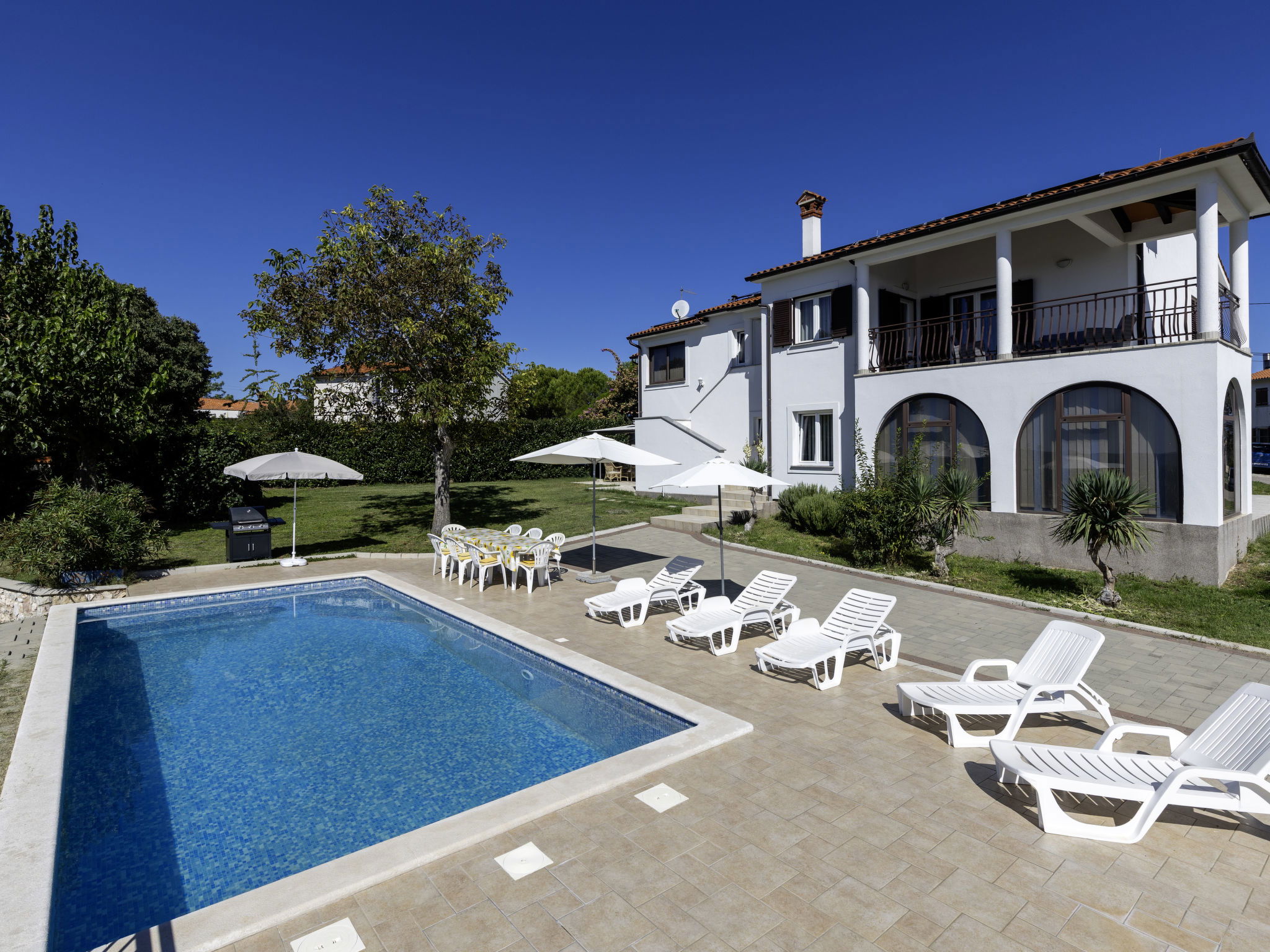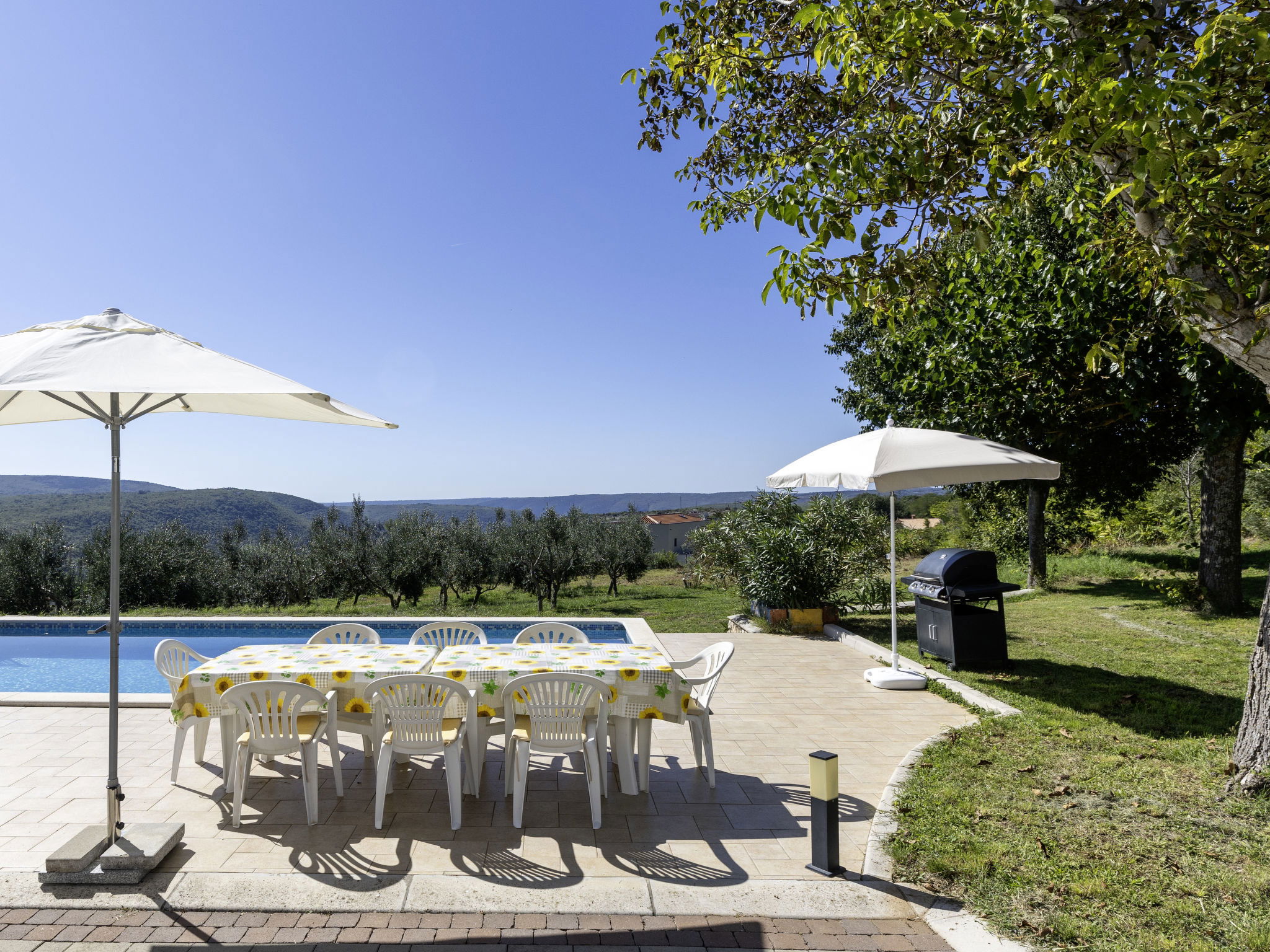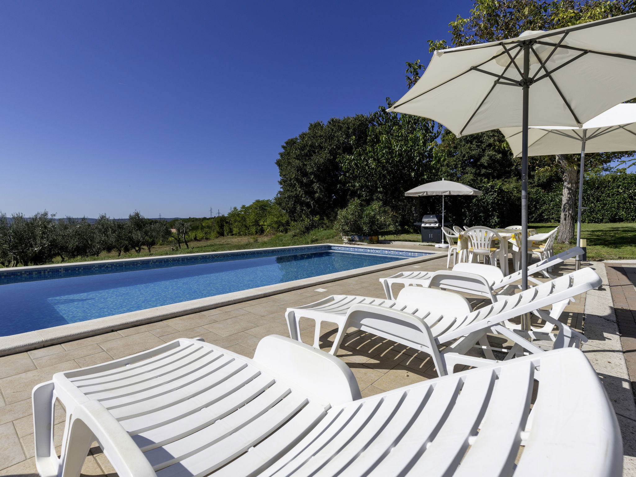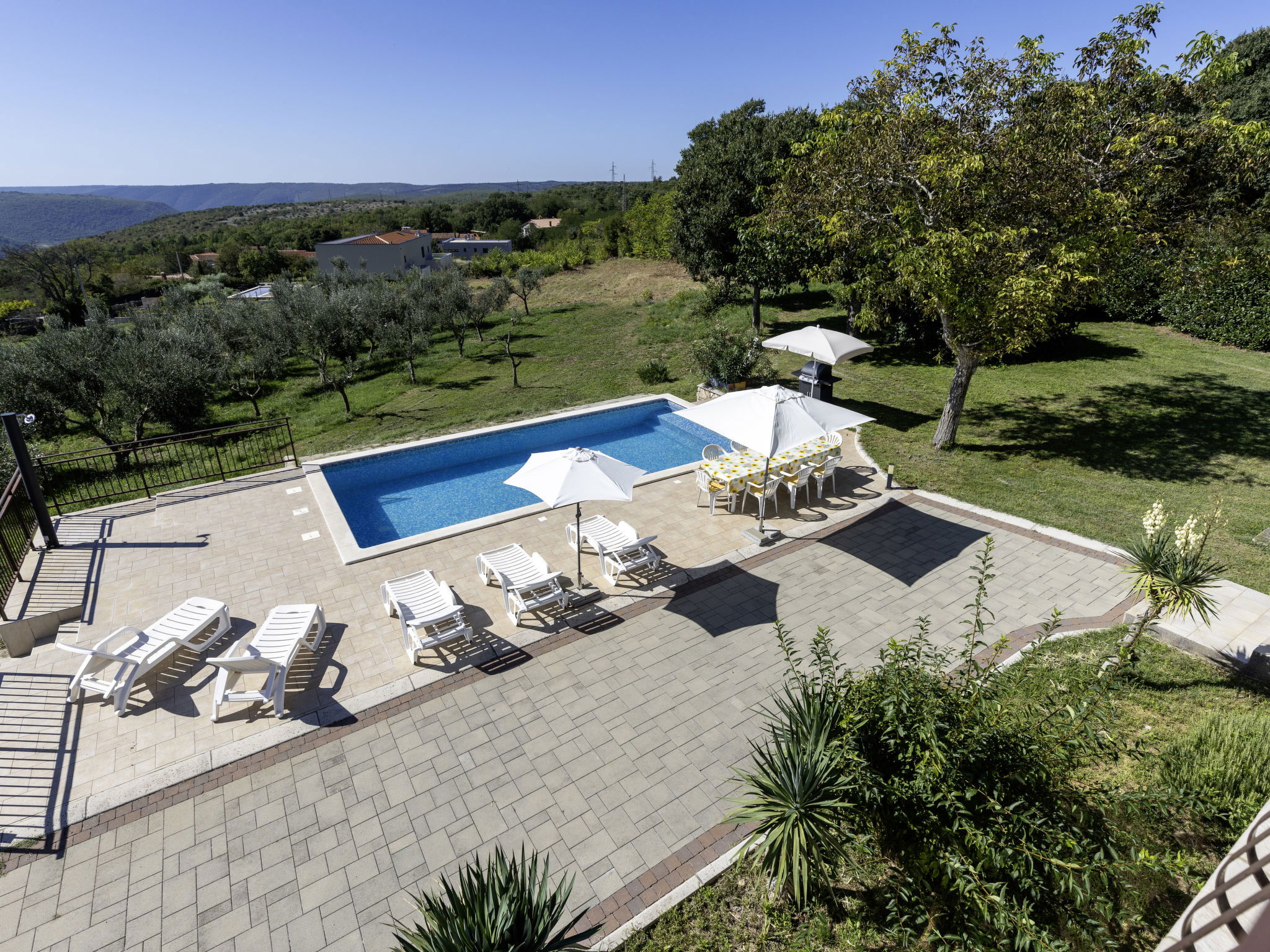 2-family house "Meri". In the hamlet Sveti Bartul 4 km from the centre of Labin, 9 km from the centre of Rabac, in a sunny position, 9 km from the sea, in the countryside. For shared use: property 1'500 m2 with plants and trees. Private: swimming pool angular (8 x 4 m, depth 140 cm, seasonal availability: 01.Apr. - 30.Oct.) with internal staircase. Outdoor shower, barbecue, pool maintenance by the owner/gardener. In the house: internet access. Roofed, parking at the house on the premises. Shop 3 km, supermarket 5 km, restaurant 5 km, bus stop "Labin" 5 km, pebble beach 9 km. The owner does not accept any youth groups. Please note: airfield 50 km from the property.